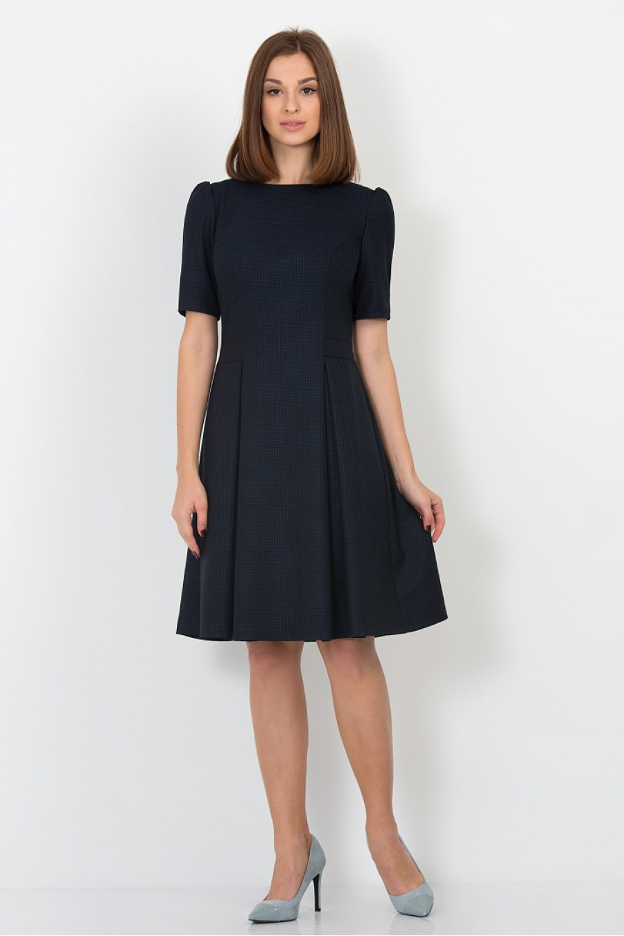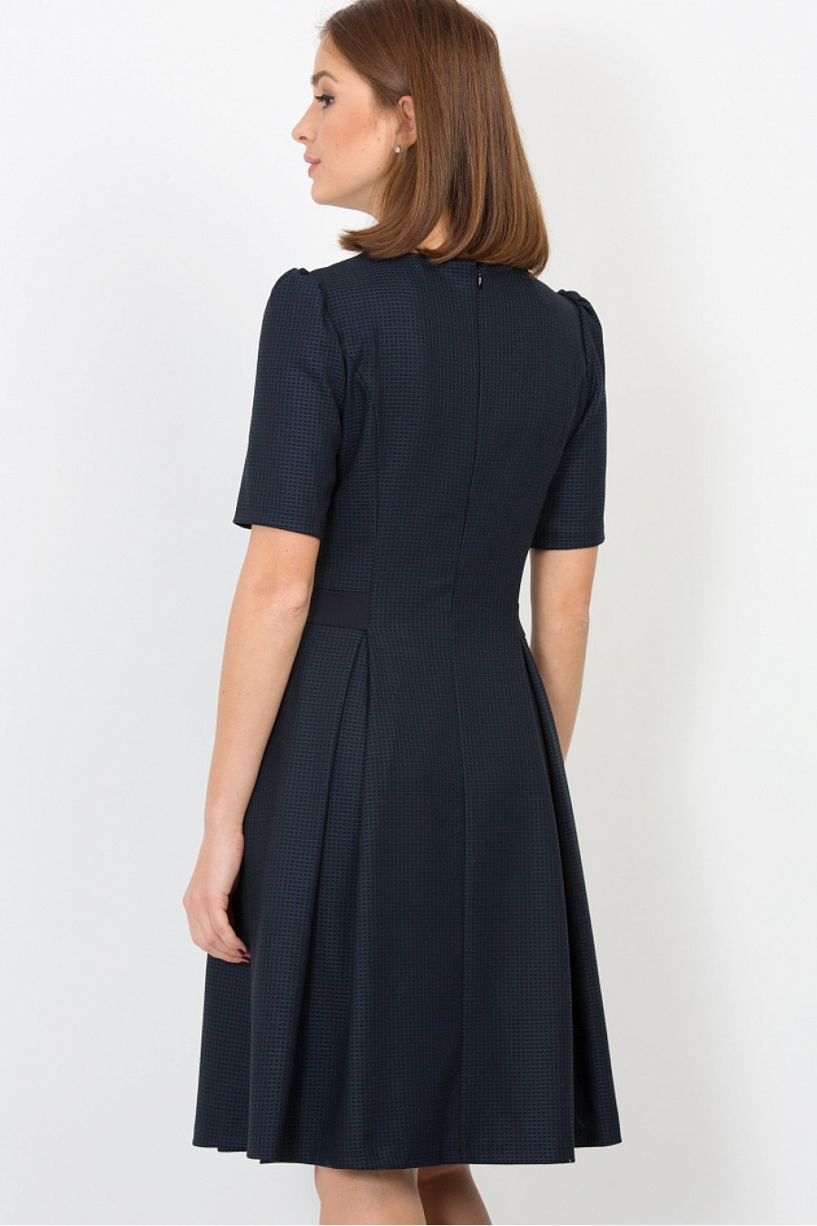 Оригинальное платье приталенного силуэта с расклешенной юбкой. Модель с округлым вырезом горловины и рукавами 3/4. Сзади-застёжка на потайную молнию. Прекрасный вариант для модных женщин, желающих подчеркнуть свою индивидуальность и хороший вкус.