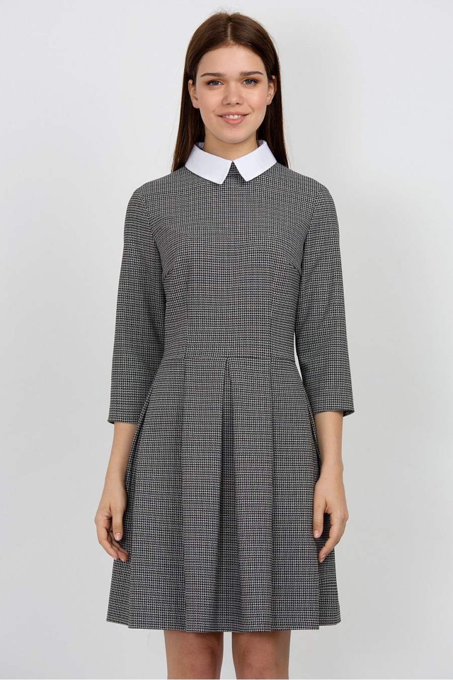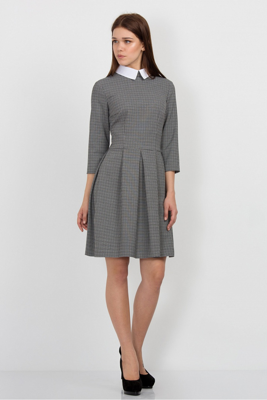 Оригинальная модель в классическом стиле органично впишется в повседневный гардероб. Платье со съемным отложным воротником. Рукава 3/4. Юбка модели расклешенная с небольшими сборками. Модель выполнена из качественной ткани. Ворот оформлен в контрастном цвете. Сзади-застёжка на потайную молнию. Длина - 88 см. Без подкладки. Станет замечательным дополнением к Вашему гардеробу.