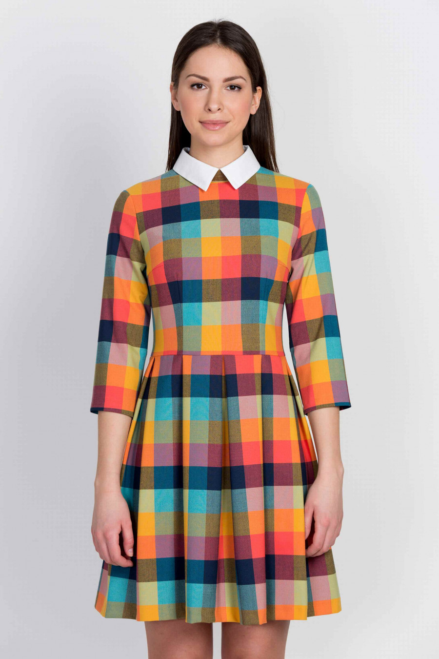 Стильное платье из ткани средней плотности, очень приятной к телу. Лиф рельефный, отрезной по линии талии, юбка с аккуратными складками. Белый воротничок пристегивается на пуговицах. Рукав 3/4, застежка-молния на спинке. Платье без подкладки. Отличный молодежный вариант.