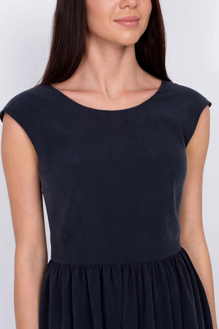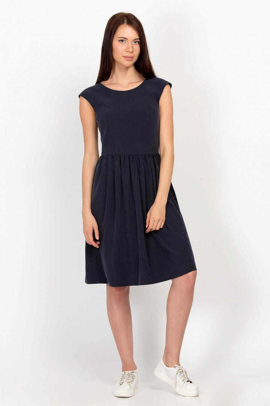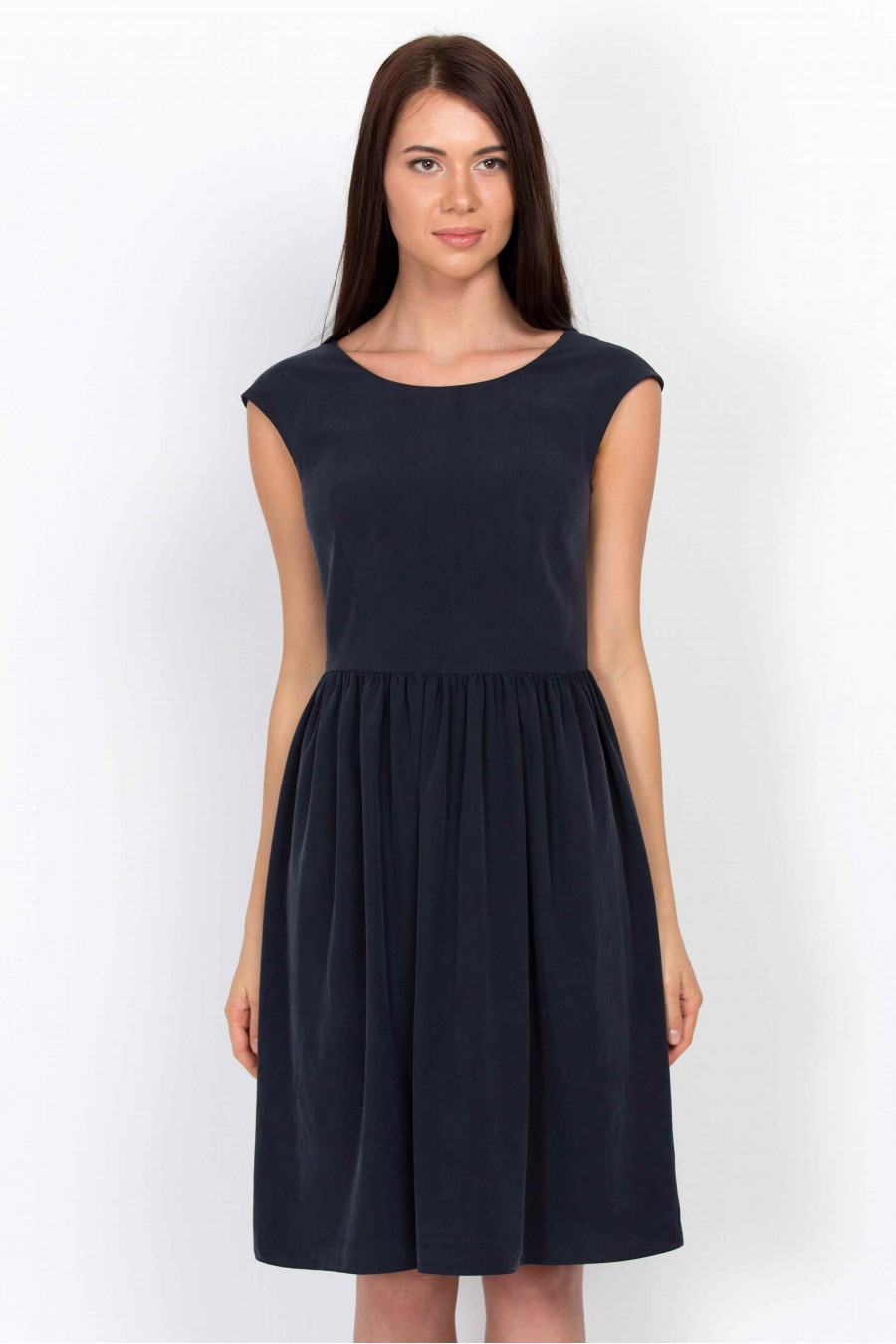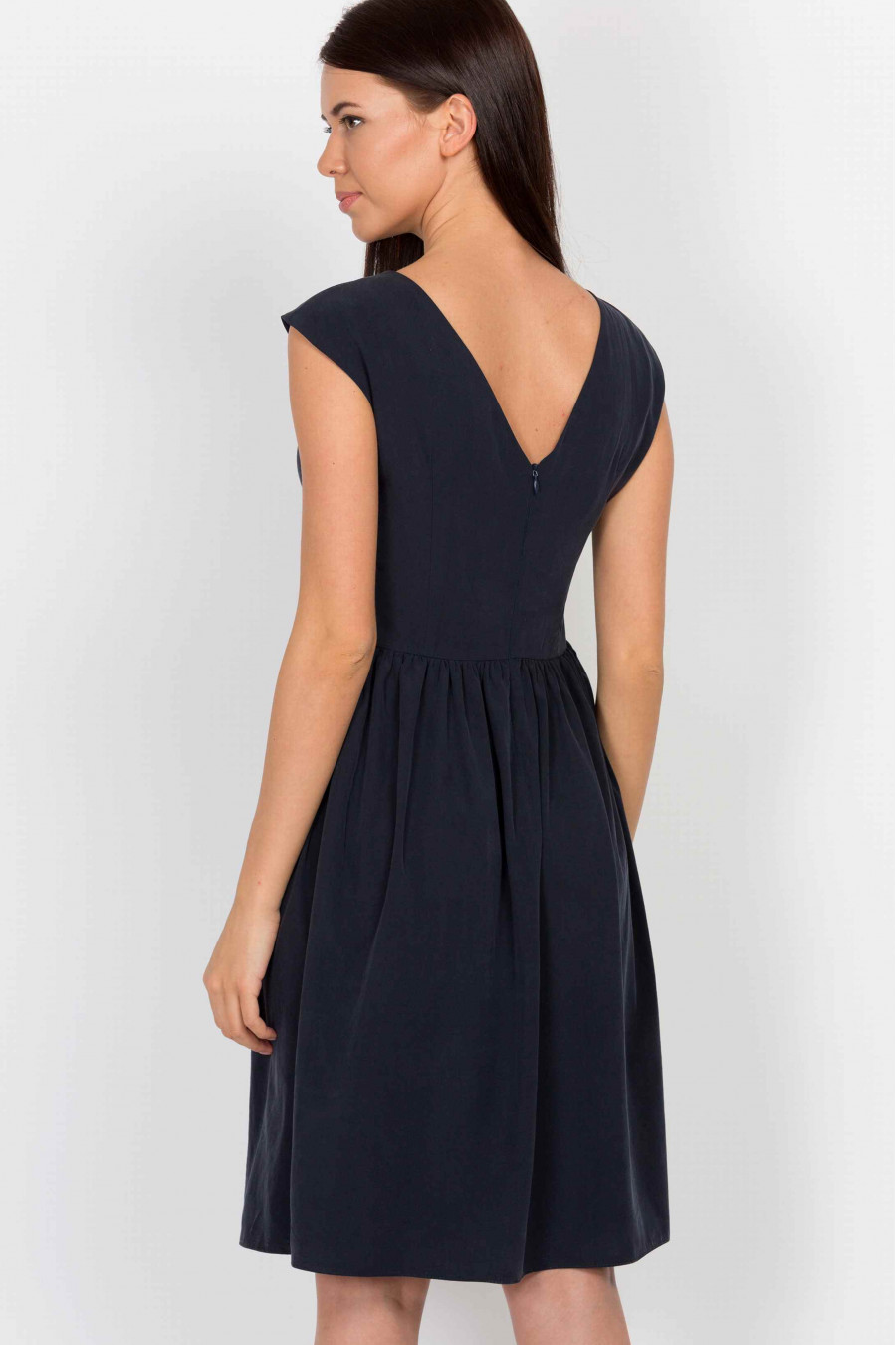 Легкое удобное платье темно-синего цвета. Ткань гладкая, струящаяся, очень приятная к телу. Без подкладки. Лиф рельефный, отрезной по линии талии, юбка с мягкими складками. На спинке есть элегантный V-образный разрез и застежка-молния. Платье хорошо сидит по фигуре и визуально удлиняет ноги.