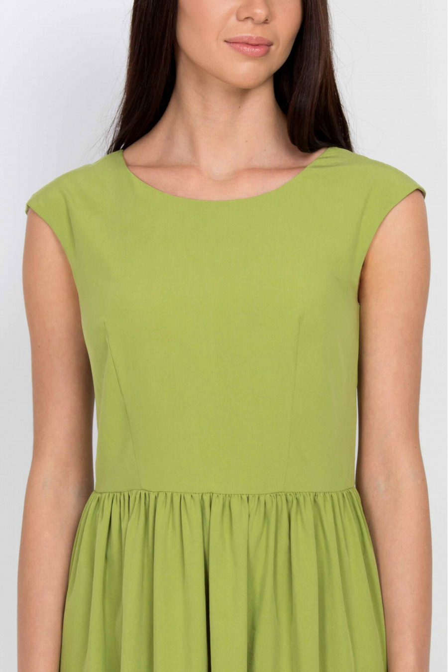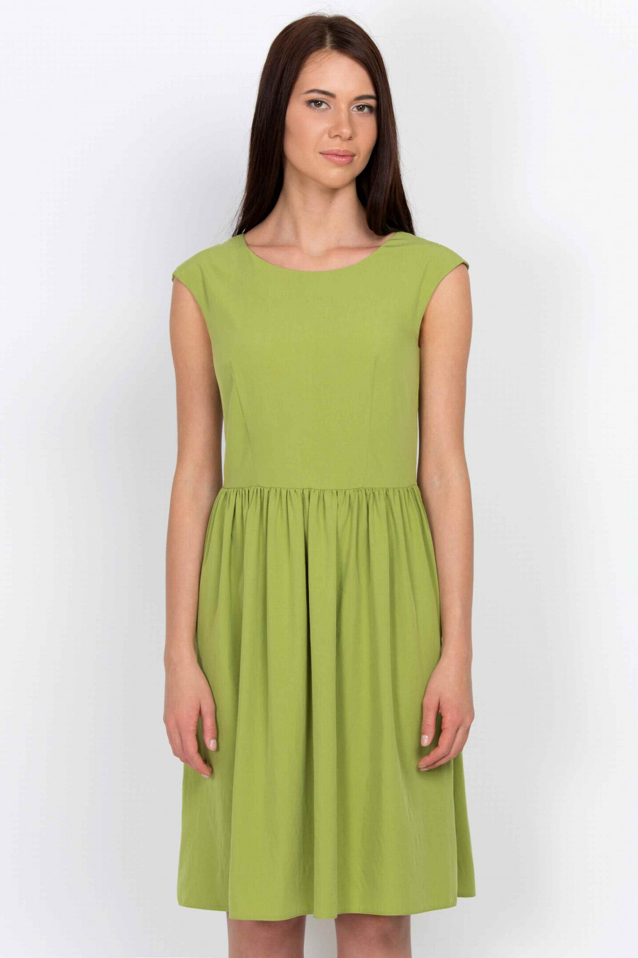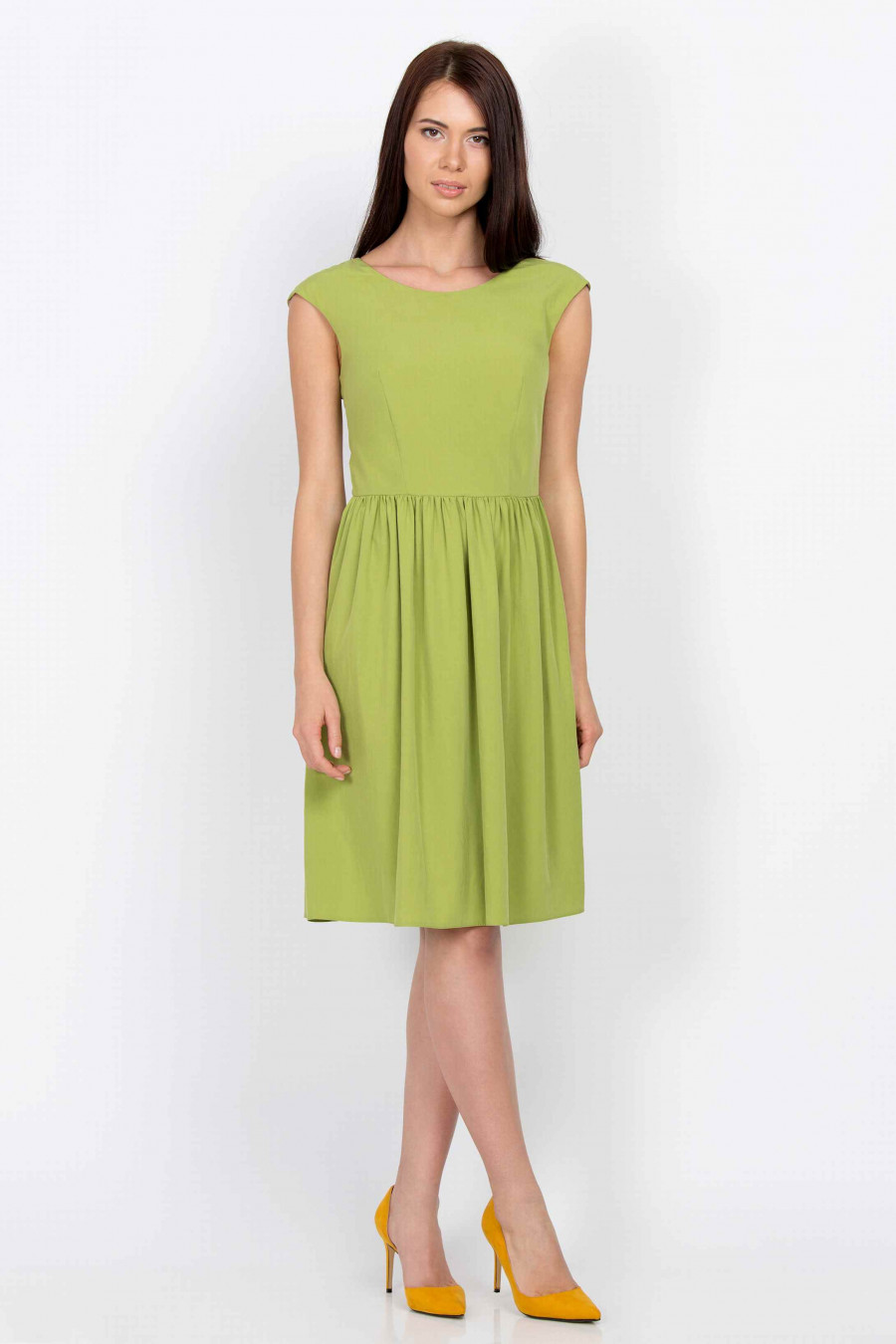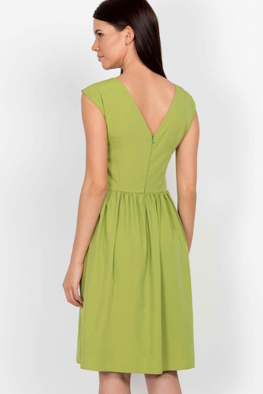Легкое удобное платье зеленого цвета. Ткань гладкая, струящаяся, очень приятная к телу. Без подкладки. Лиф рельефный, отрезной по линии талии, юбка с мягкими складками. На спинке есть элегантный V-образный разрез и застежка-молния. Платье хорошо сидит по фигуре и визуально удлиняет ноги.