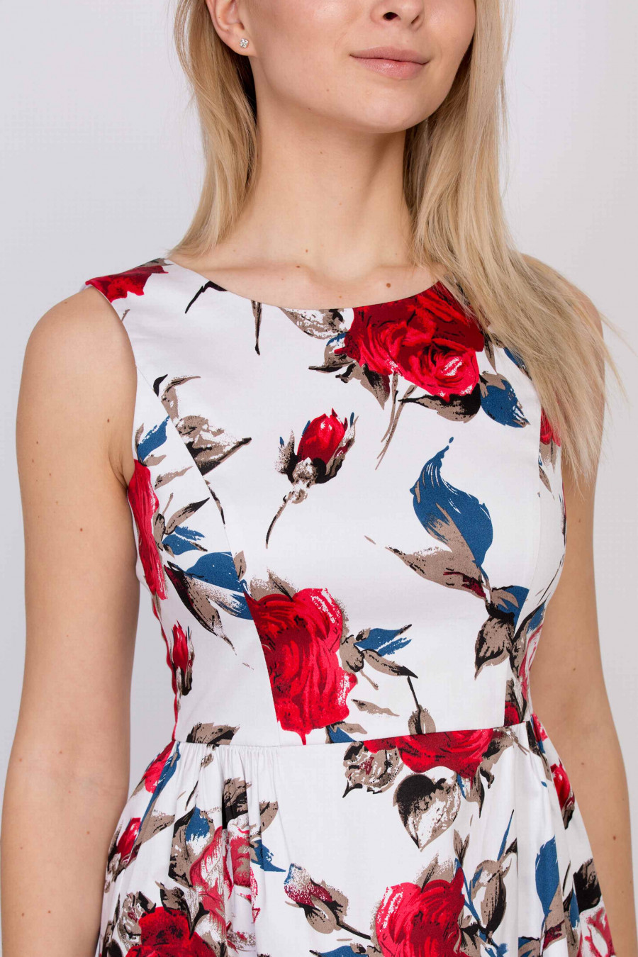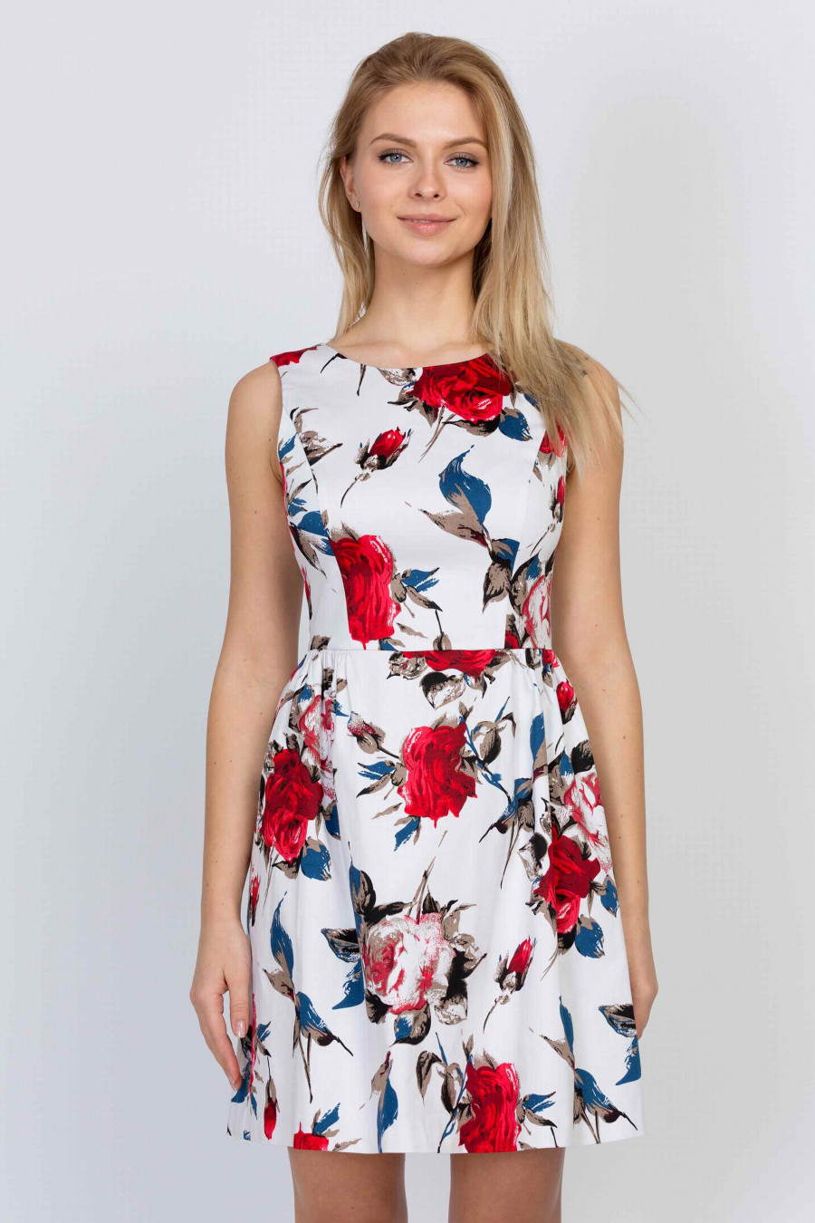 Легкое платье без рукавов из натурального хлопка. Цвет ткани белый с ярким цветочным принтом. Платье отрезное по линии талии, юбка с симпатичными складками. Без подкладки, на спинке V-образный вырез и застежка-молния. Отличная модель для весенне-летнего сезона, хорошо сидит по фигуре.