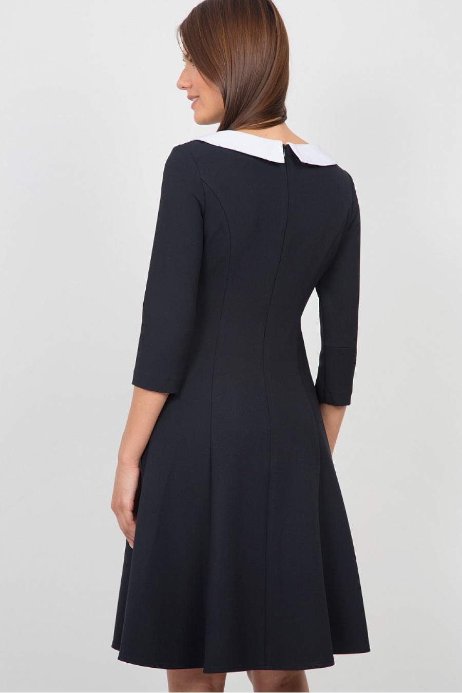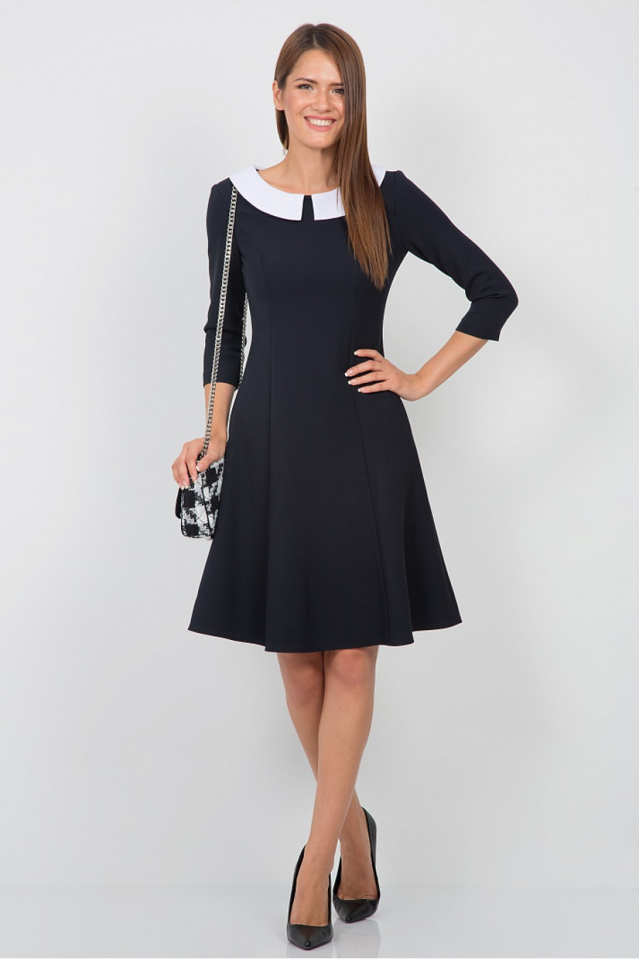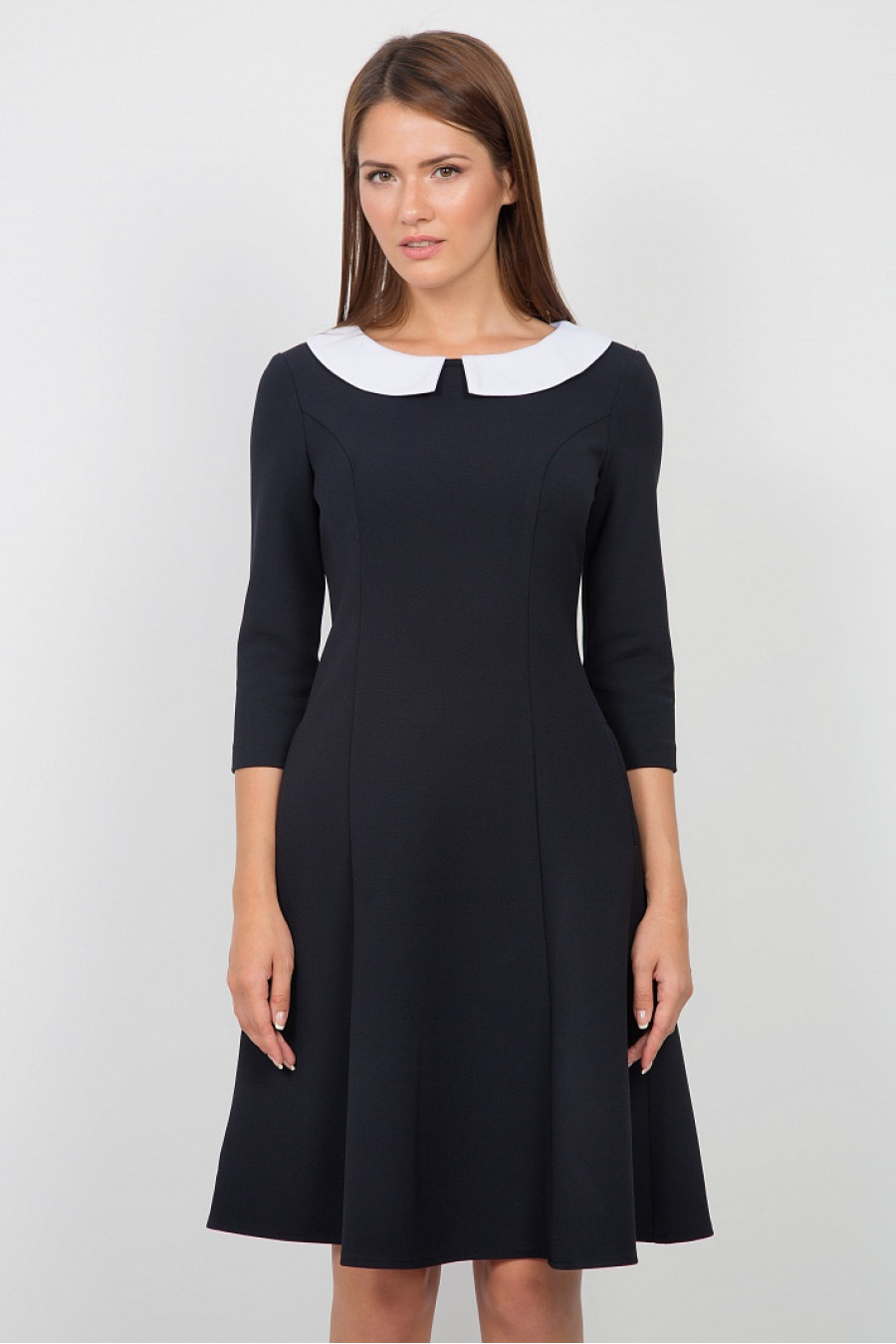 Элегантное платье лаконичного дизайна с округлым вырезом горловины, отложным белым воротником и рукавами 3/4. Модель приталенного кроя с пышной юбкой, длина изделия 104 см.,