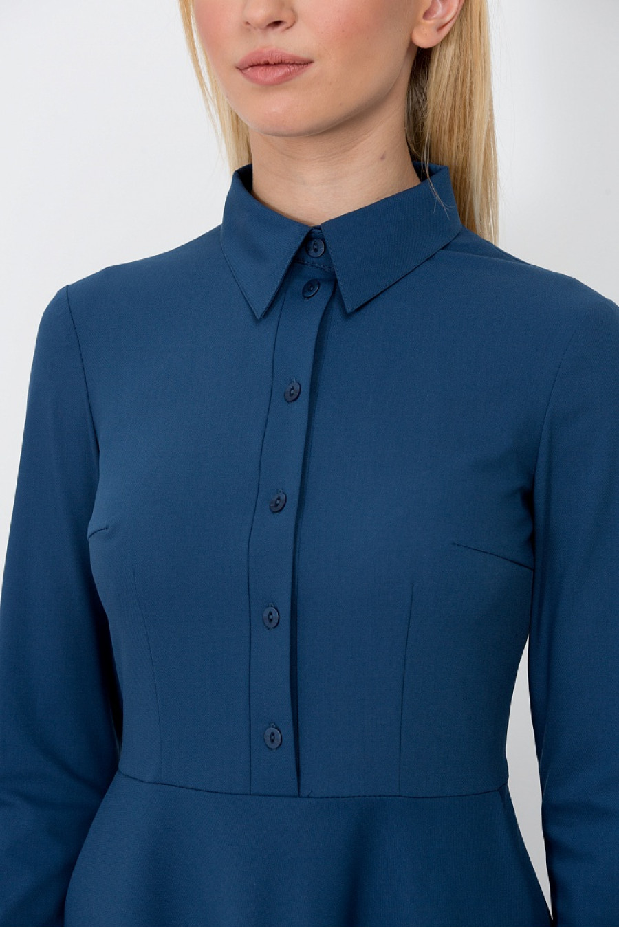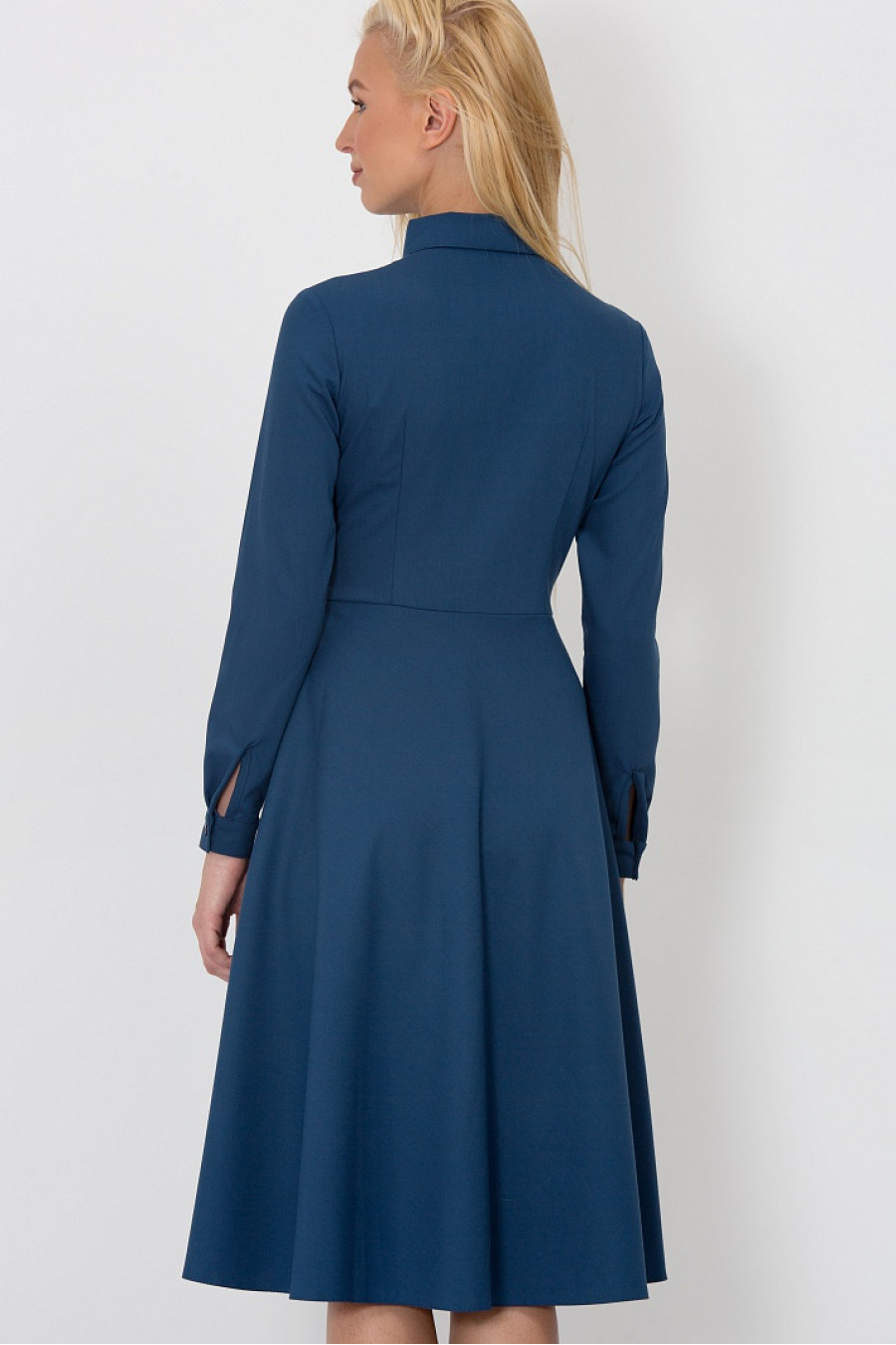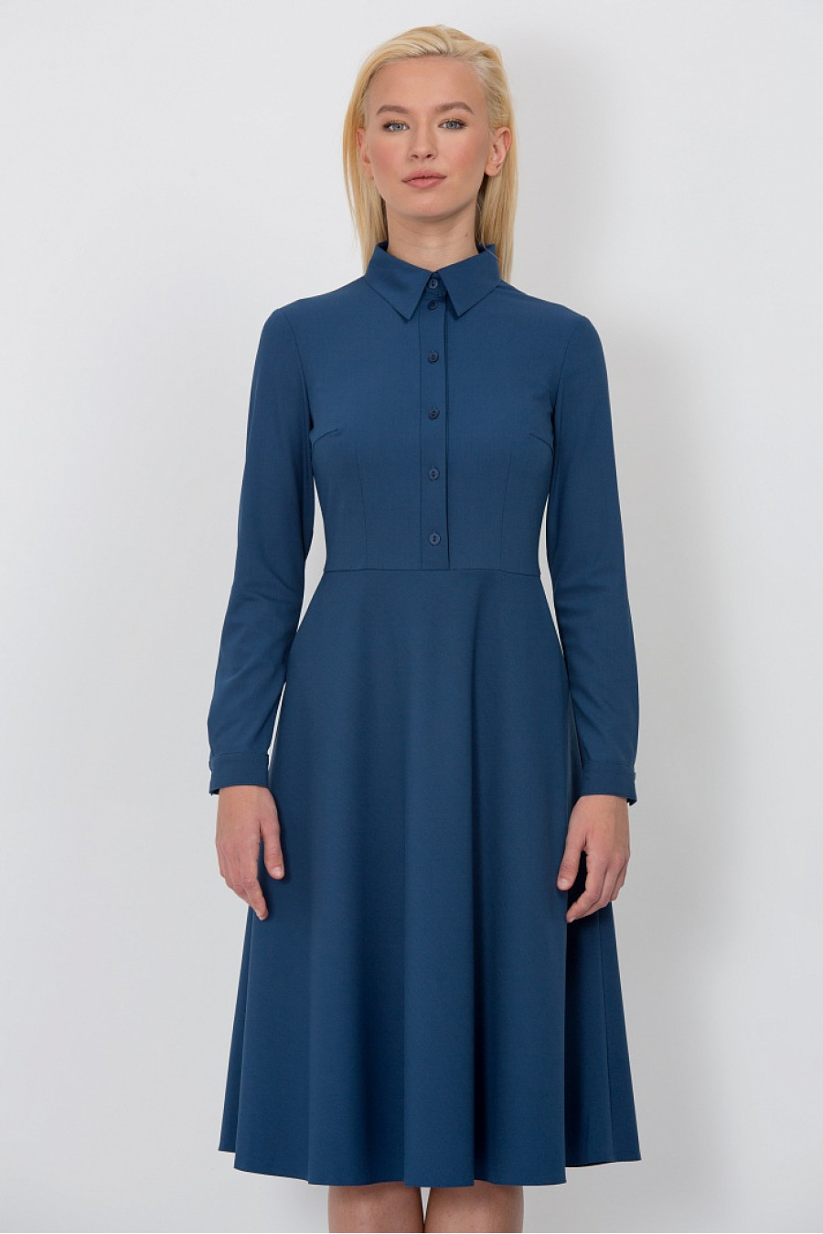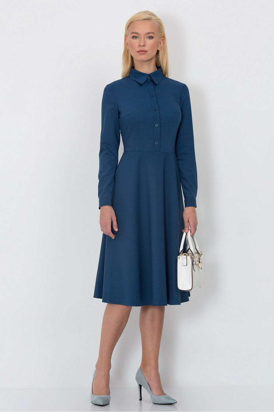 Элегантное платье лаконичного дизайна с отложным воротником и длинными рукавами. Модель приталенного кроя с пышной юбкой, длина изделия 108 см., без подкладки. Удобная застежка на пуговицы на передней части платья. В боковом шве-застёжка на потайную молнию.