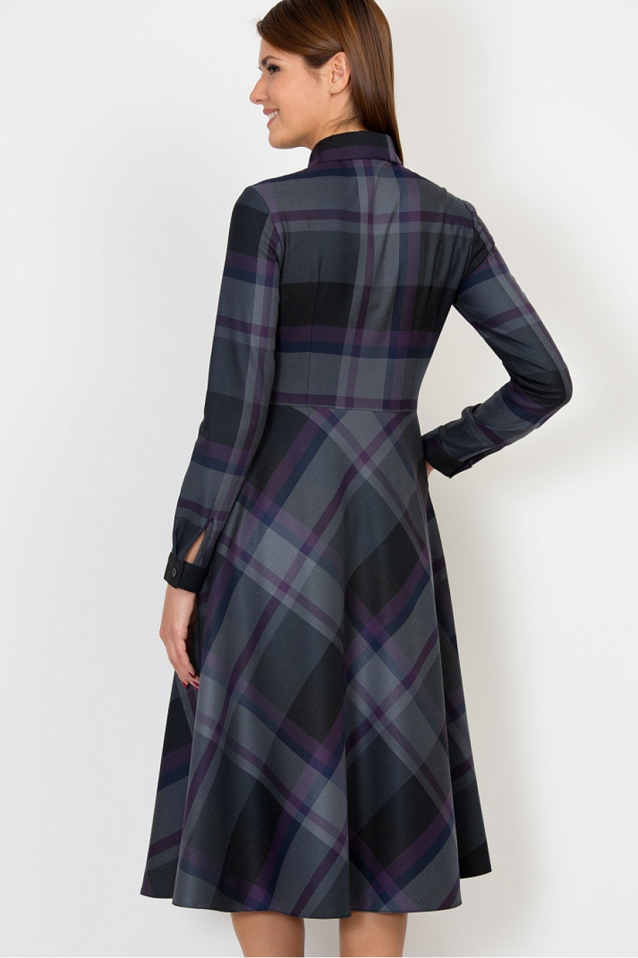 Элегантное платье лаконичного дизайна с отложным воротником и длинными рукавами. Модель приталенного кроя с пышной юбкой, длина изделия 109 см., без подкладки. Удобная застежка на пуговицы на передней части платья. В боковом шве-застёжка на потайную молнию.