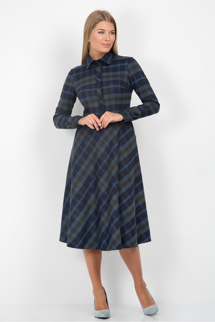 Элегантное платье лаконичного дизайна с отложным воротником и длинными рукавами. Модель приталенного кроя с пышной юбкой, длина изделия 112 см., без подкладки. Удобная застежка на пуговицы на передней части платья. В боковом шве-застёжка на потайную молнию.