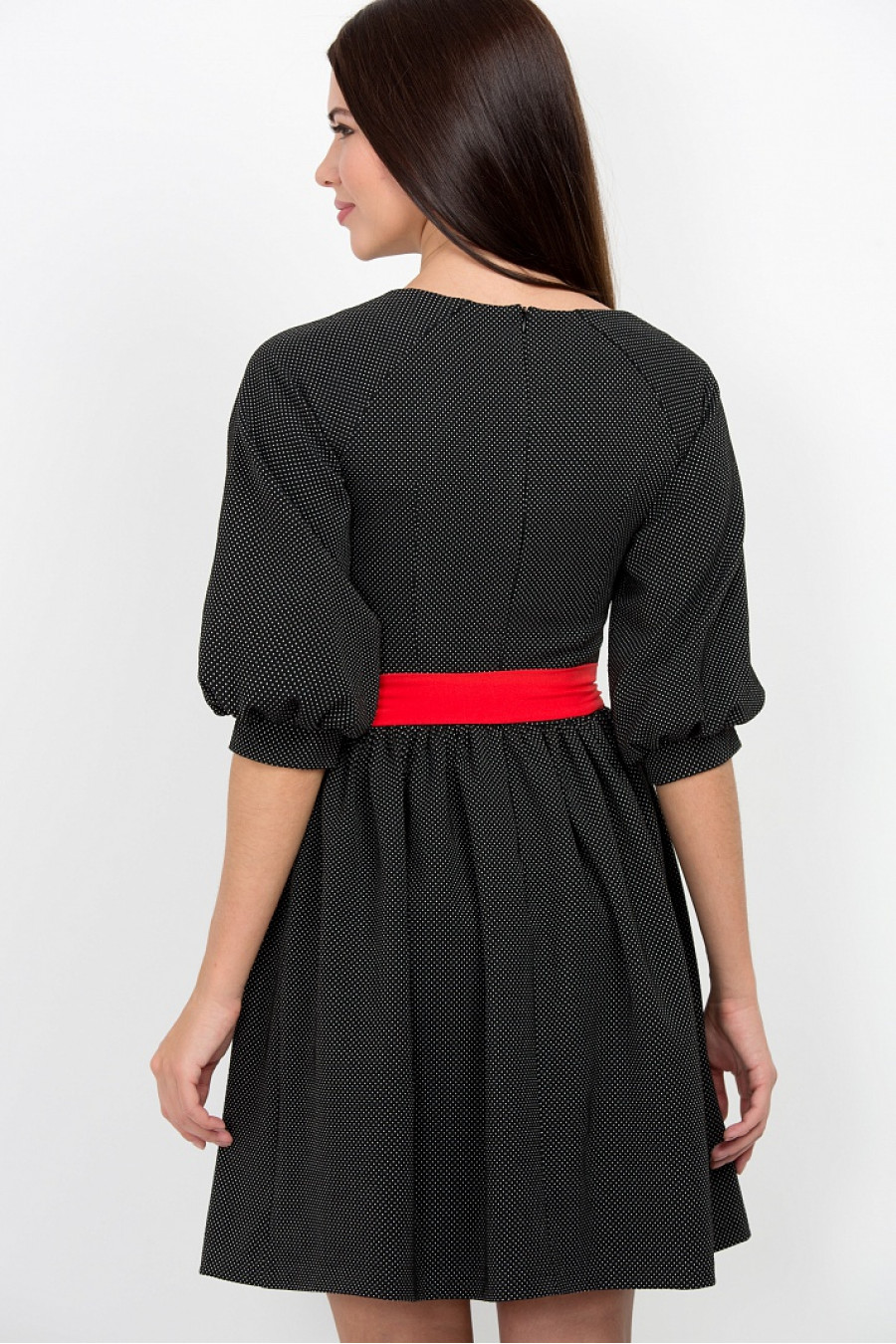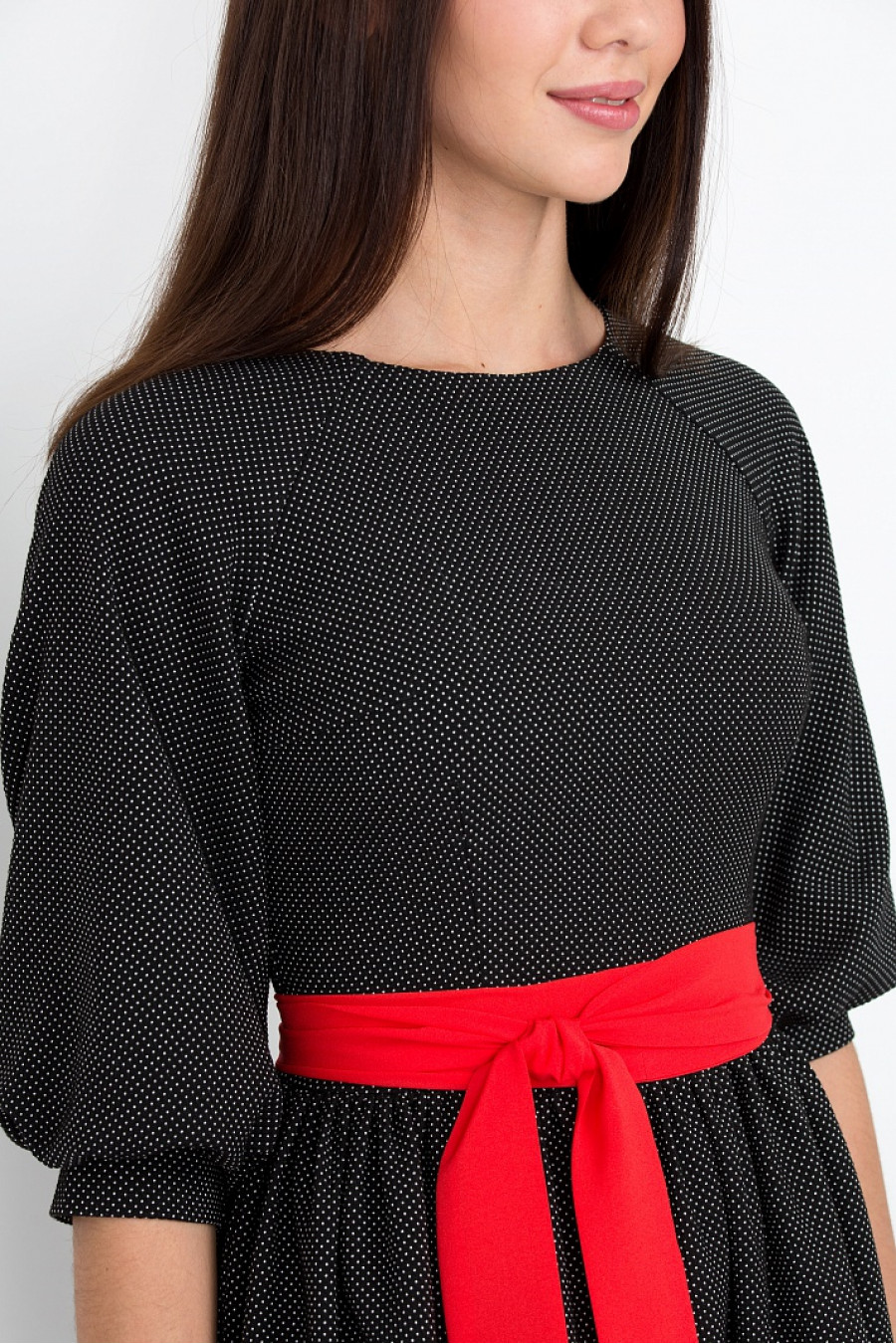 Элегантное платье лаконичного дизайна с огруглым воротником и присборенными рукавами длиной 3/4. Модель приталенного кроя с пышной юбкой, длина изделия 97 см., с подкладкой. На спинке-застёжка на потайную молнию. Пояс входит в комплект. Платье маломерит на размер.