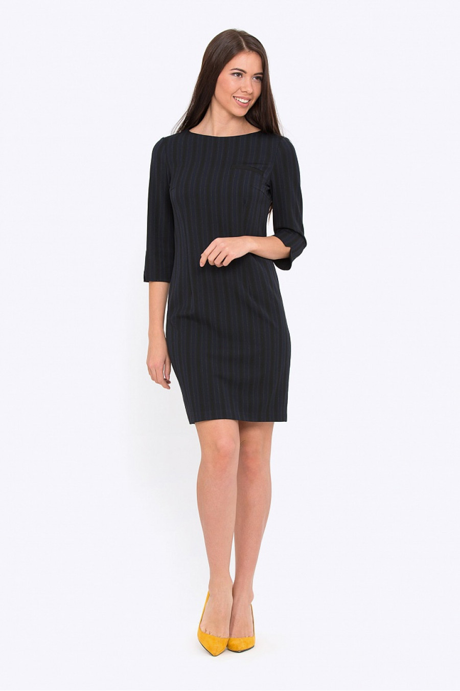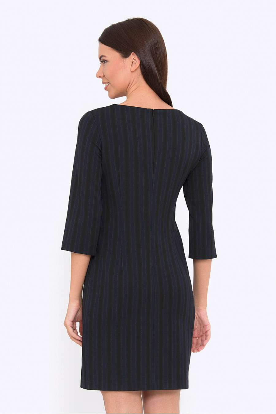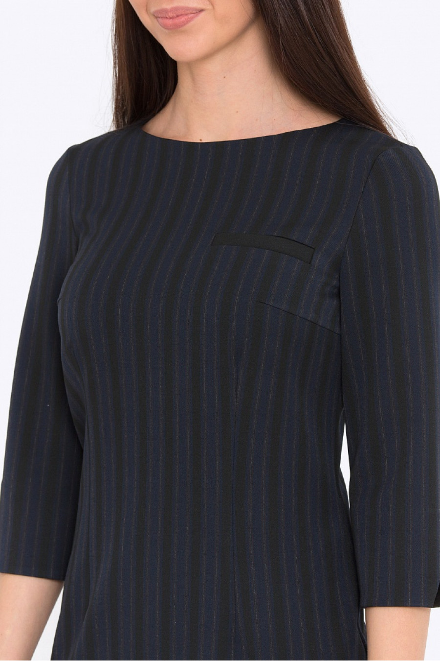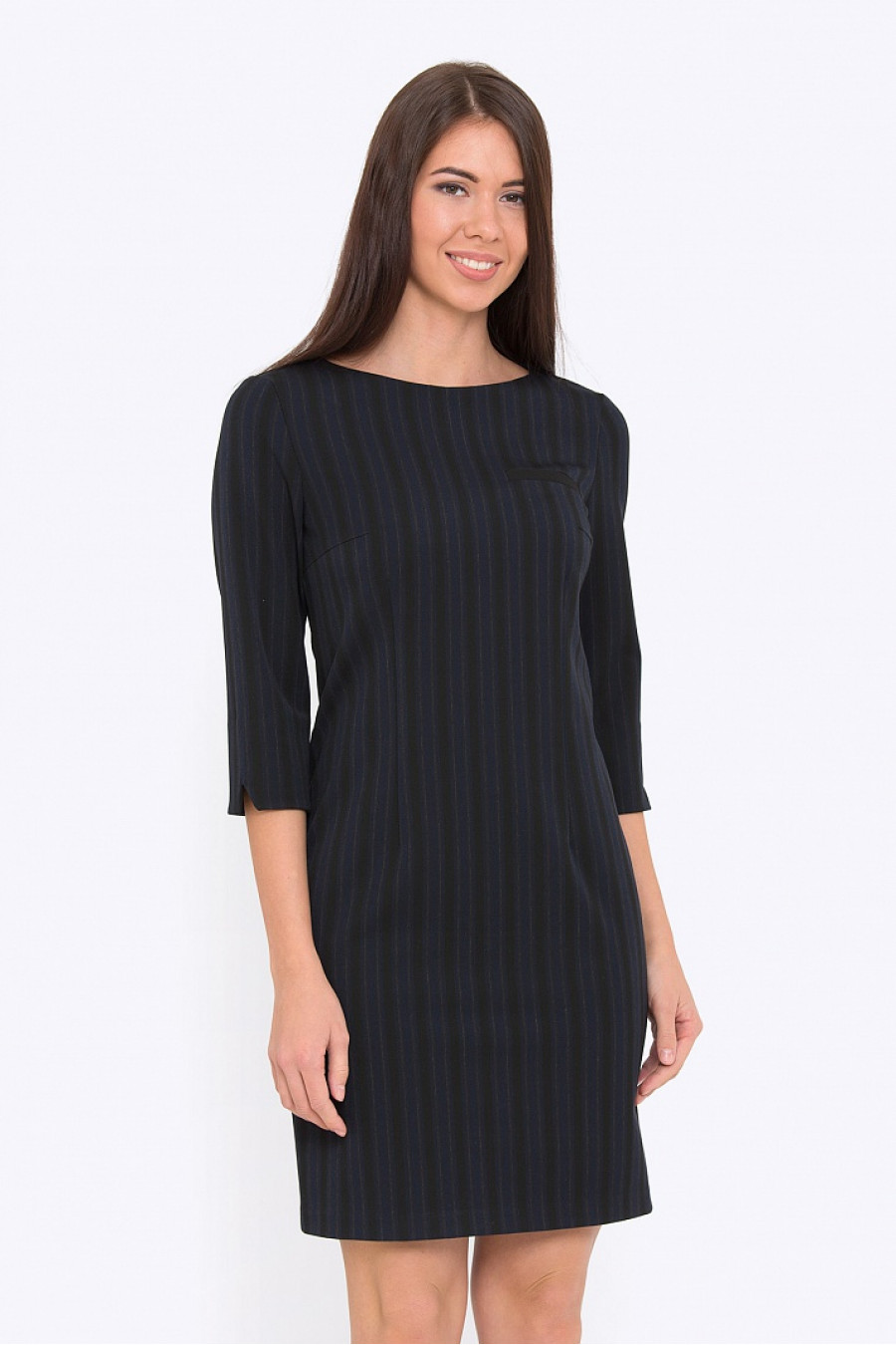 Приталенное платье. Ткань костюмная в полоску. Платье без подкладки, рукава 3/4, спереди оформлено карманом-обманкой. Модель хорошо подойдет для женщин с фигурой типа песочные часы. Отличное платье на повседневную носку в осенне-зимний сезон. Длина градируется от размера к размеру: 42 размер - 84 см 54 размер - 95,5 см. Рост фотомодели 172 см.