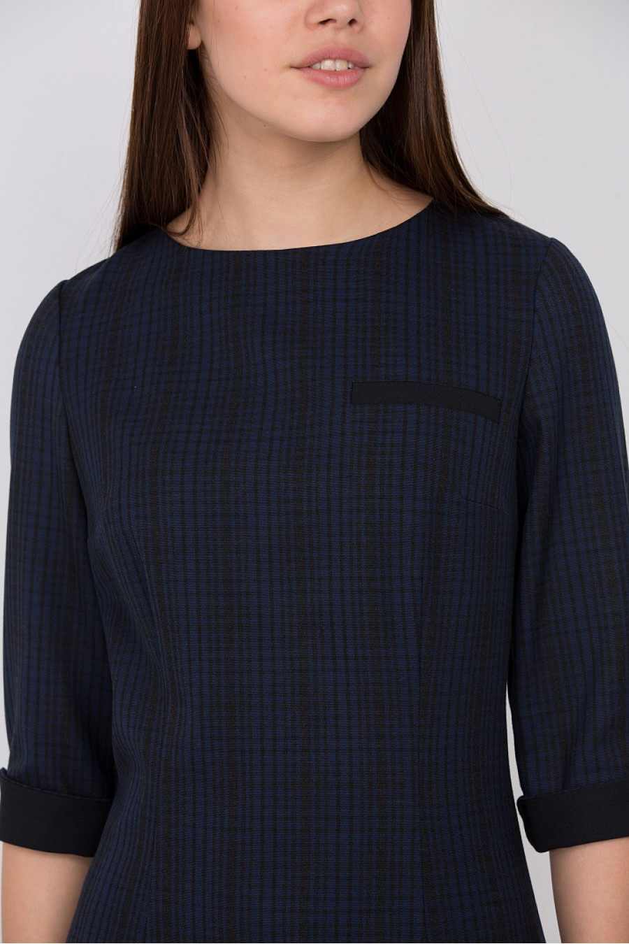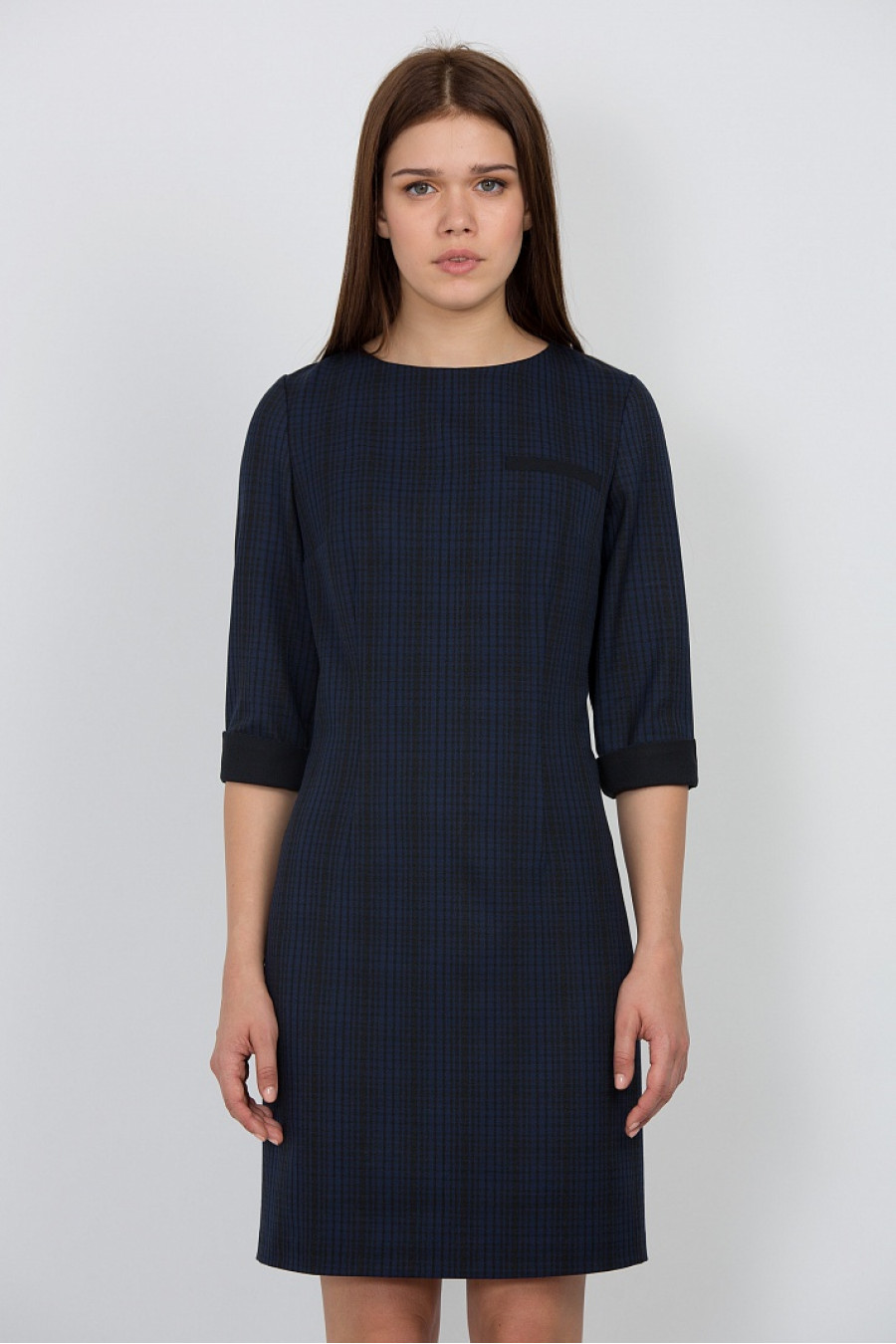 Элегантное платье лаконичного дизайна с округлым вырезом горловины и рукавами 3/4. Модель приталенного кроя, длина 88 см., на подкладке. На спинке изделия имеются потайная молния.
