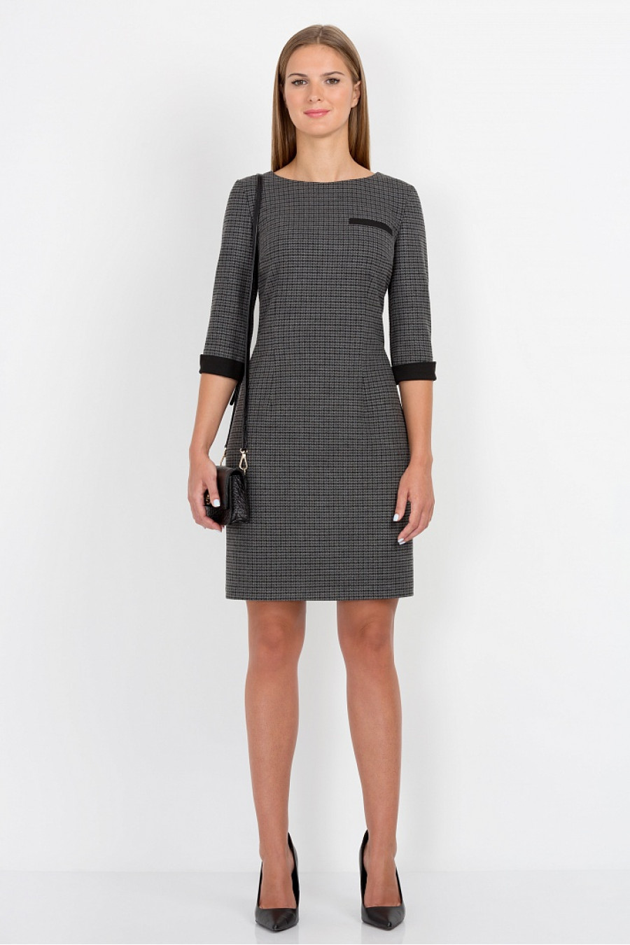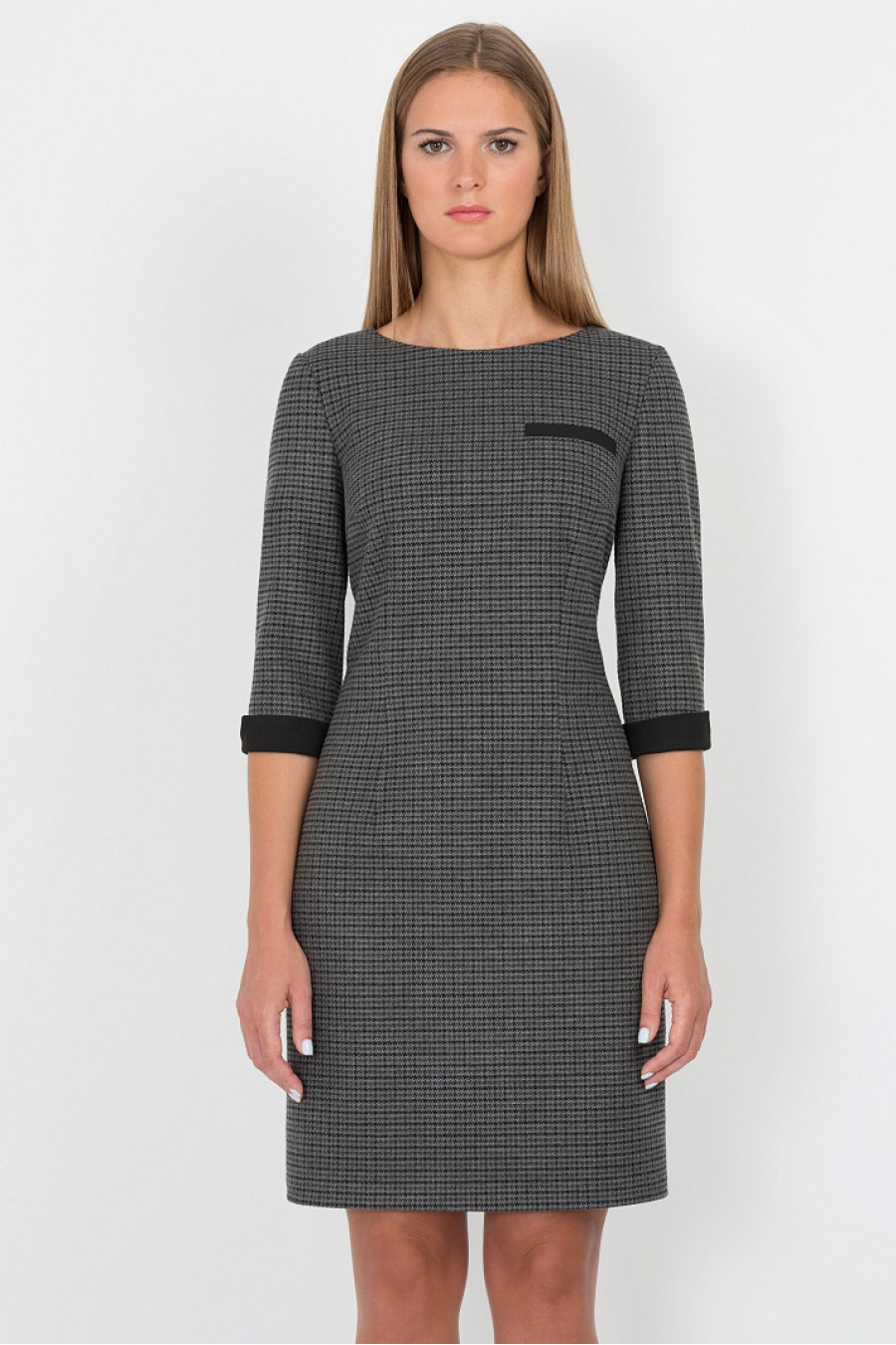 Элегантное платье лаконичного дизайна с округлым вырезом горловины и рукавами 3/4. Модель приталенного кроя, длина 89 см., на подкладке. На спинке изделия имеются потайная молния.