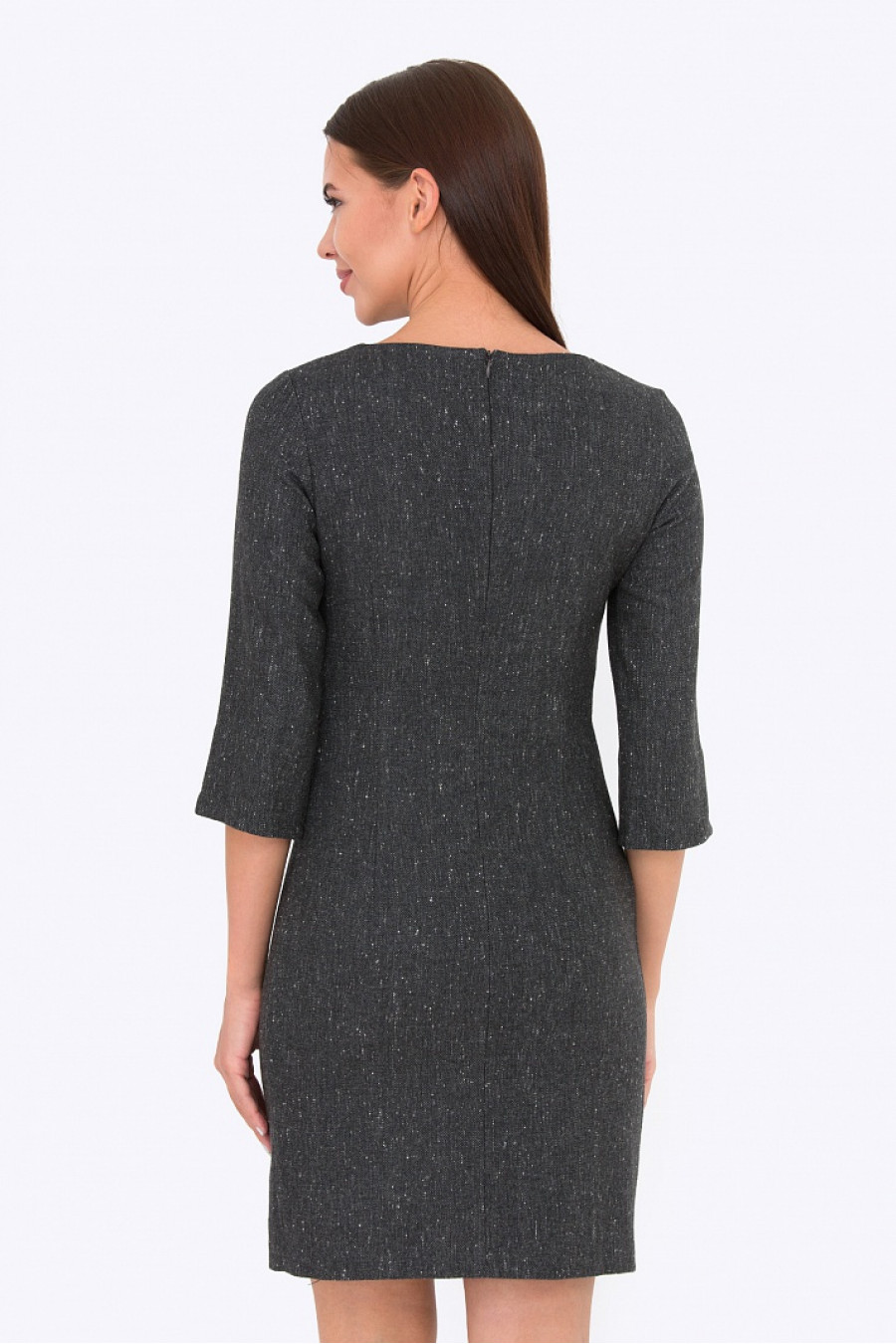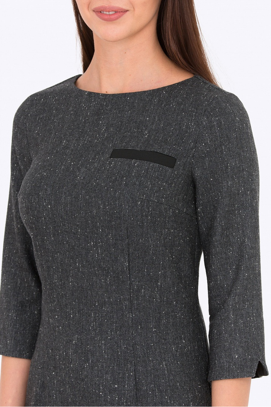 Приталенное платье серого цвета. Ткань на основе шерсти. Платье без подкладки, рукава 3/4, спереди оформлено карманом-обманкой. Модель хорошо подойдет для женщин с фигурой типа песочные часы. Отличное платье на повседневную носку в осенне-зимний сезон. Длина градируется от размера к размеру:42 размер - 89 см54 размер - 95,5 смРост фотомодели 172 см.