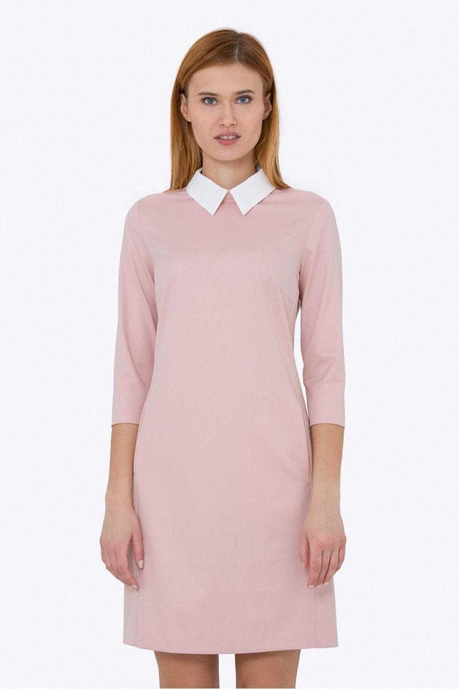 Стильное платье прямого силуэта розового цвета. Ткань средней плотности, гладкая приятная на ощупь. Без подкладки, рукав 3/4, на спинке застежка-молния. Аккуратный белый воротничок пристегивается на пуговицах. В боковых рельефах есть удобные функциональные кармашки. Замечательное офисное платье. Длина градируется от размера к размеру. Рост фотомодели 175см.