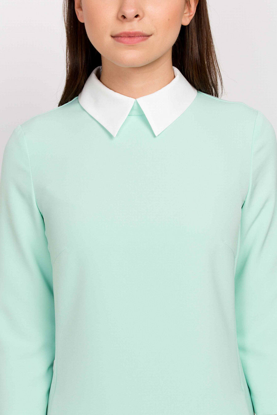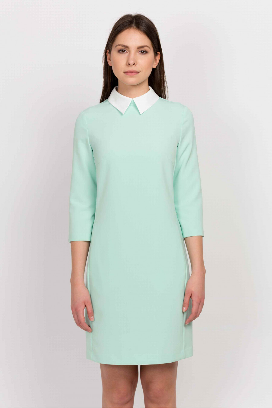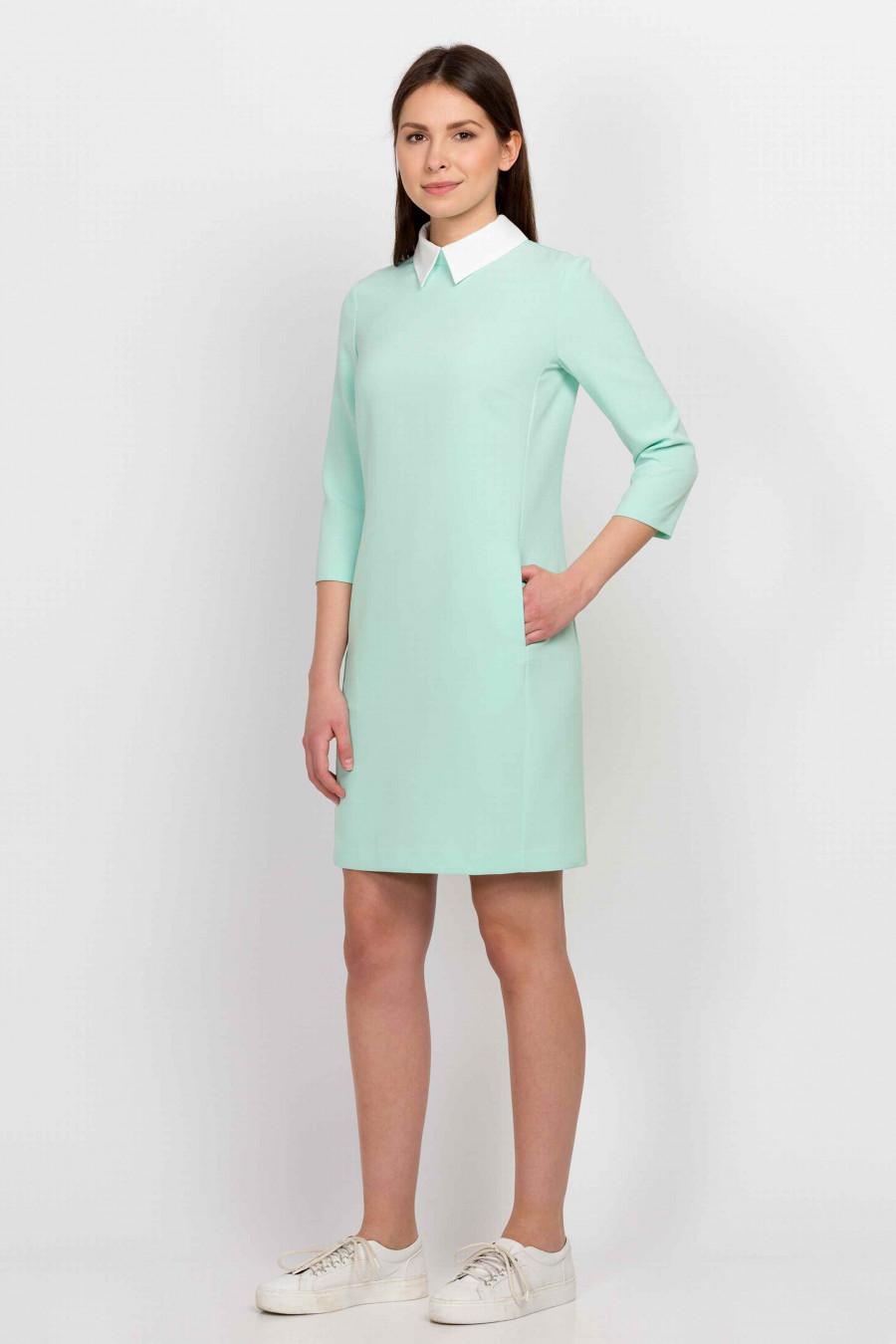 Стильное платье прямого силуэта нежного ментолового цвета. Ткань средней плотности, гладкая с легким эффектом глянца. Без подкладки, рукав 3/4, на спинке застежка-молния. Аккуратный белый воротничок пристегивается на пуговицах. В боковых рельефах есть удобные функциональные кармашки. Замечательное офисное платье.