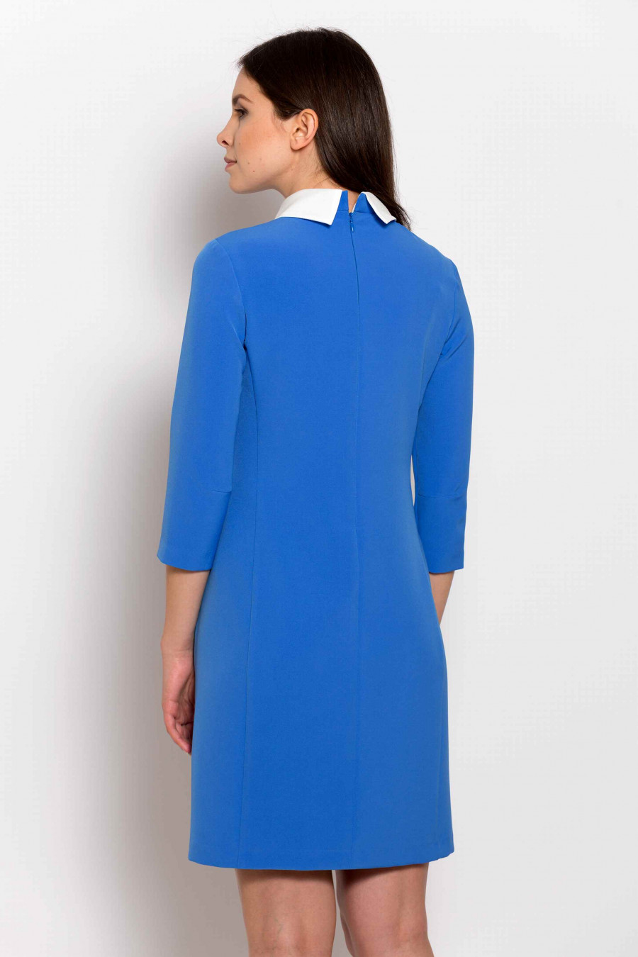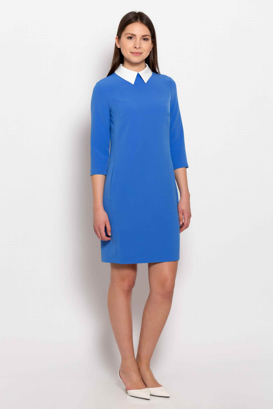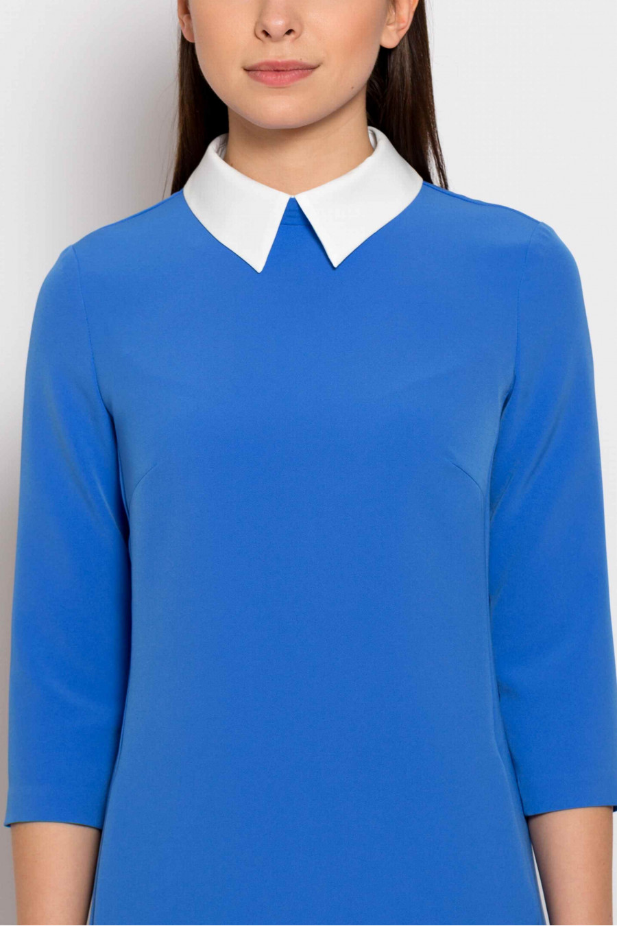 Стильное платье прямого силуэта приятного синего цвета. Ткань средней плотности, гладкая с легким эффектом глянца. Без подкладки, рукав 3/4, на спинке застежка-молния. Аккуратный белый воротничок пристегивается на пуговицах. В боковых рельефах есть удобные функциональные кармашки. Замечательное офисное платье.