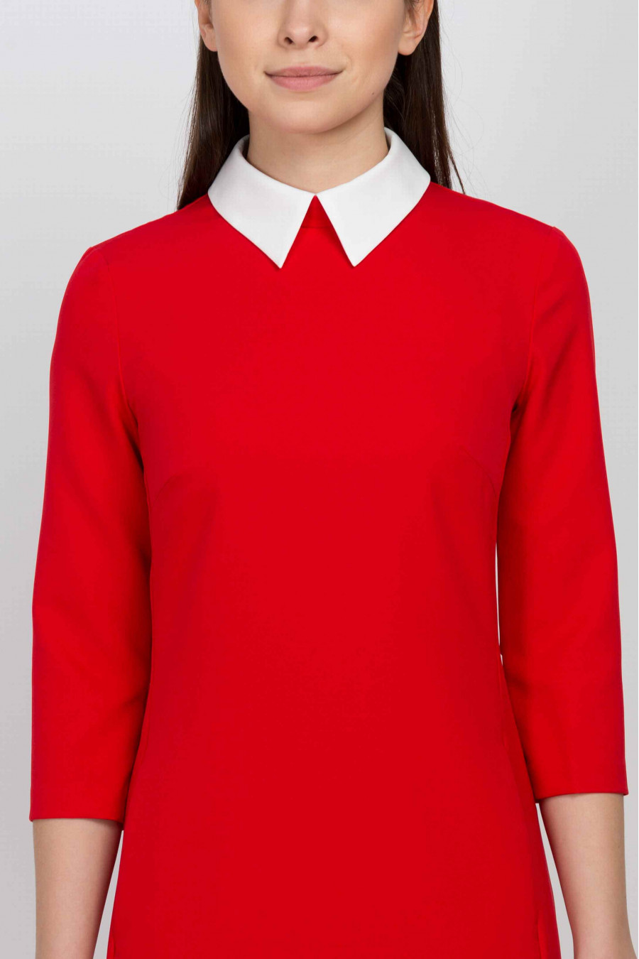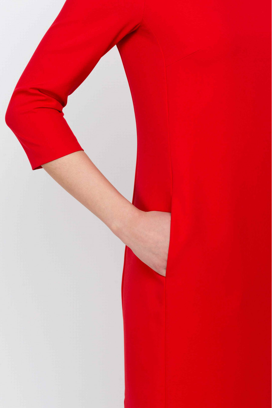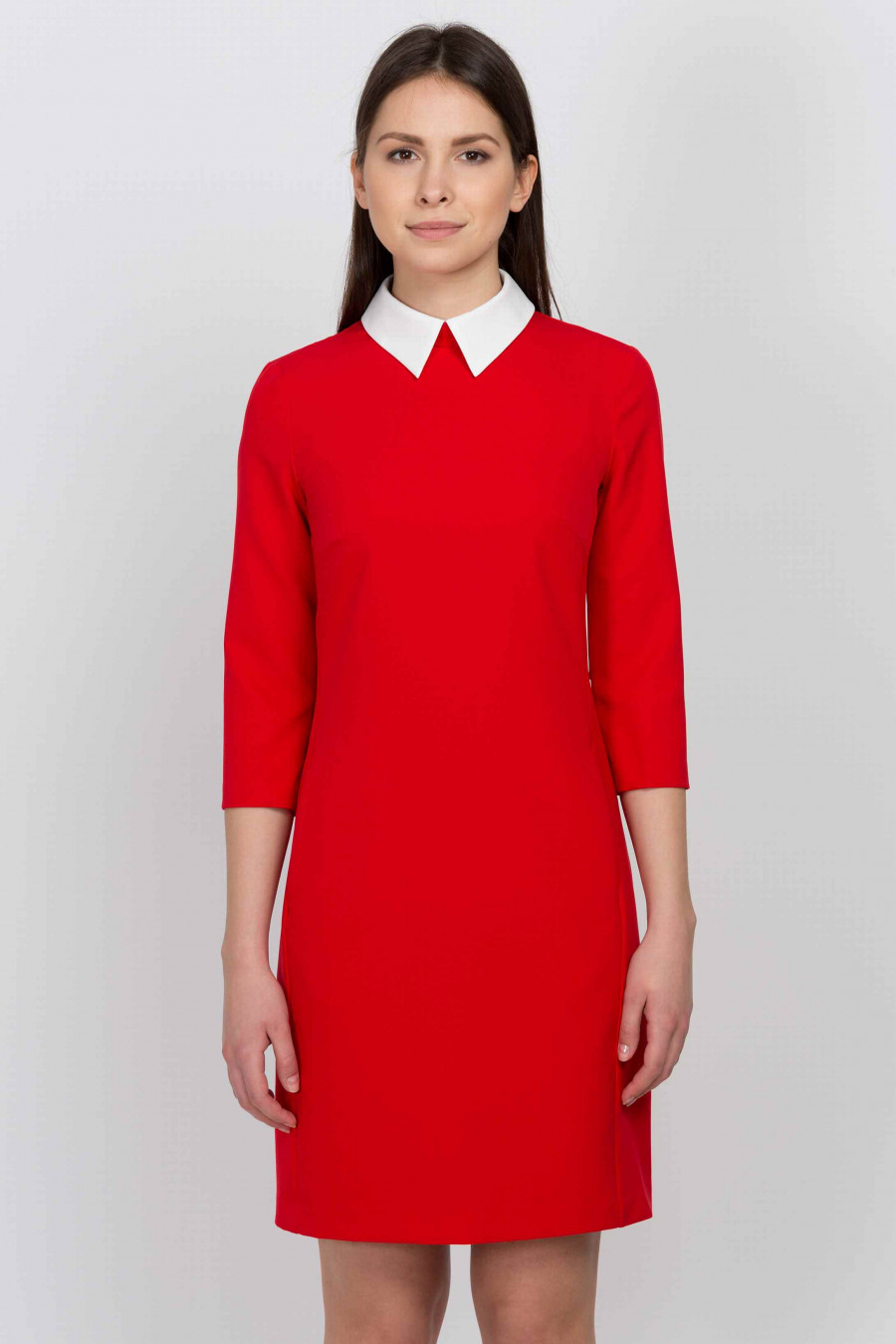 Стильное платье прямого силуэта сочного красного цвета. Ткань средней плотности, гладкая с легким эффектом глянца. Без подкладки, рукав 3/4, на спинке застежка-молния. Аккуратный белый воротничок пристегивается на пуговицах. В боковых рельефах есть удобные функциональные кармашки. Замечательное офисное платье.