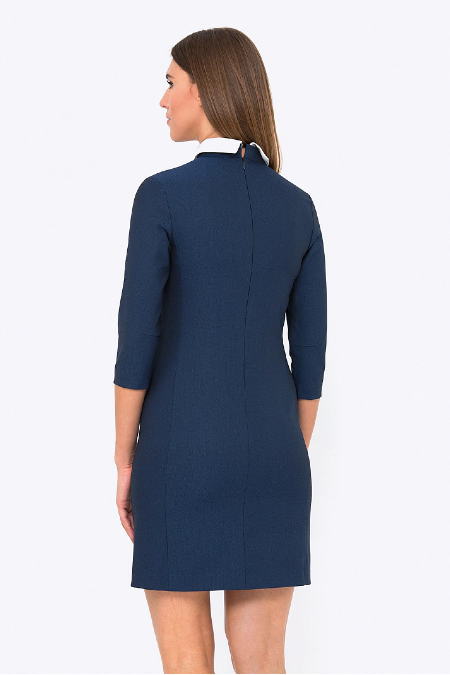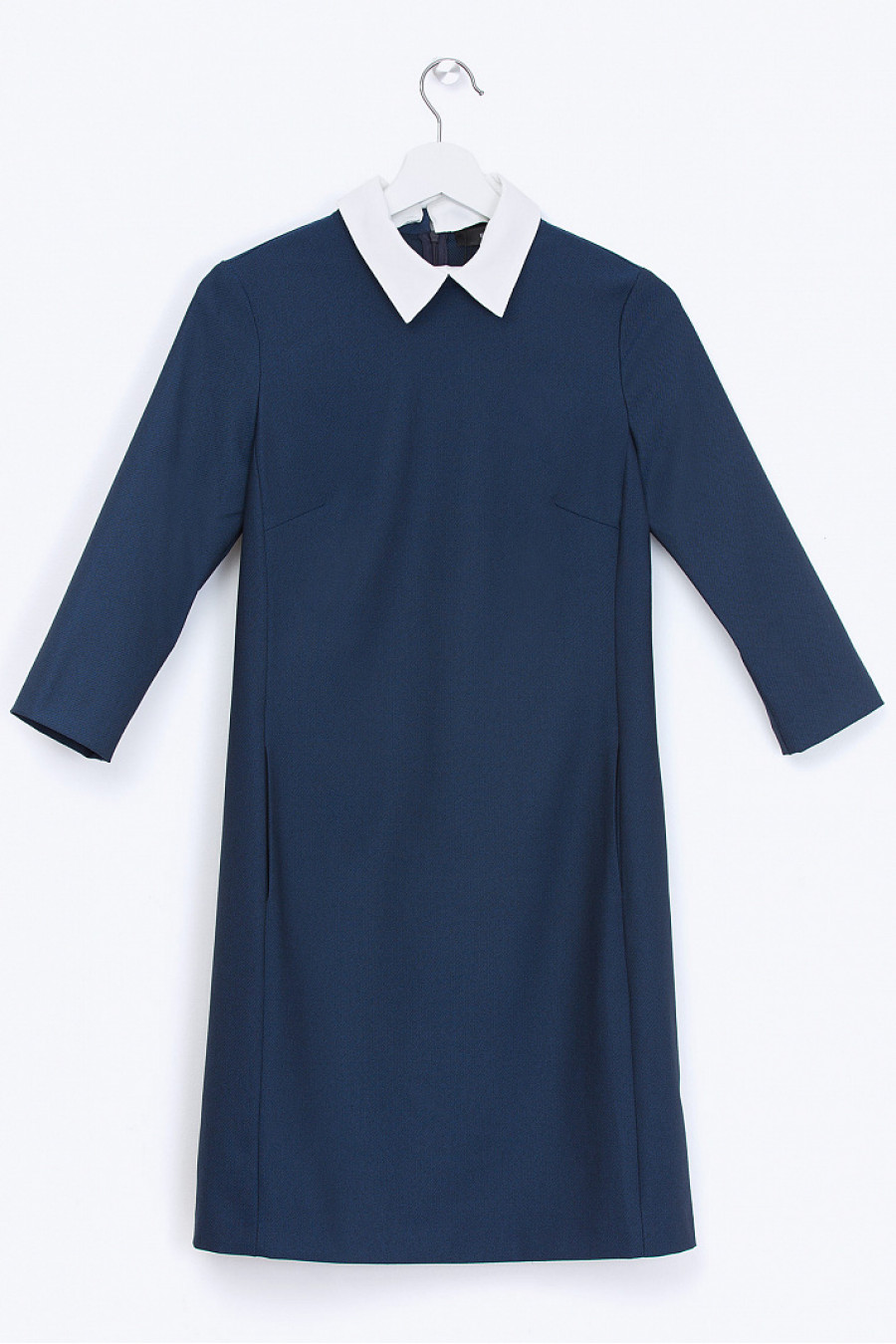 Стильное платье свободного силуэта, синего цвета. Ткань средней плотности, гладкая приятная на ощупь. Без подкладки, рукав 3/4, на спинке застежка-молния. Аккуратный белый воротничок пристегивается на пуговицах. В боковых рельефах есть удобные функциональные кармашки. Замечательное офисное платье. Длина градируется от размера к размеру. Рост фотомодели 178см.