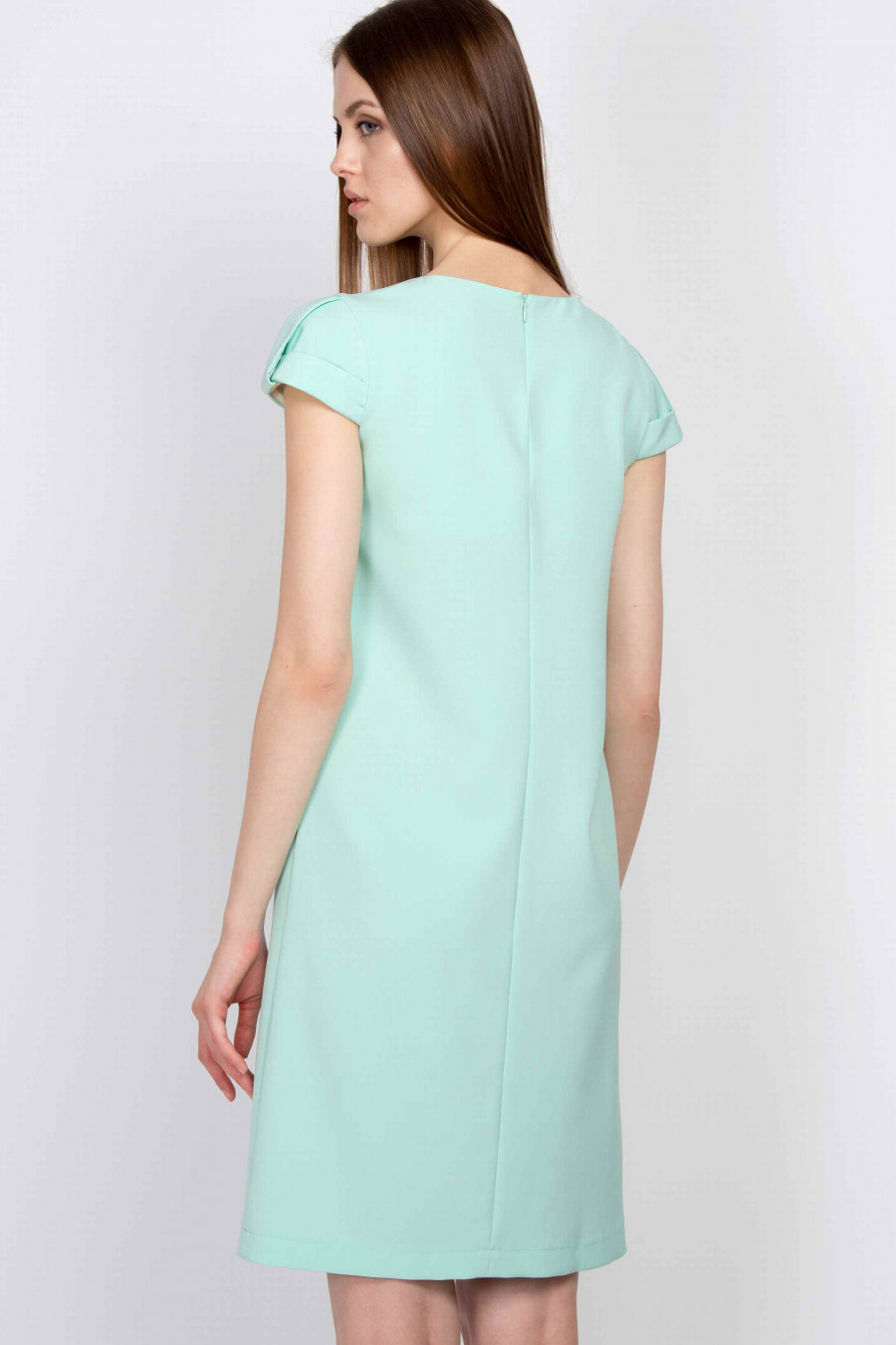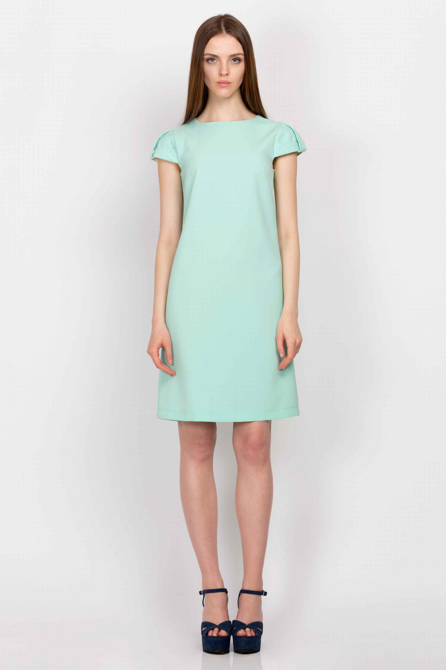 Элегантное платье прямого кроя мягкого ментолового цвета. Ткань гладкая, слегка эластичная, очень приятная на ощупь. Есть аккуратные рукава-крылышки, украшенные манжетами, сзади застежка-молния. Платье без подкладки, отлично подойдет для создания легкого весеннего образа.