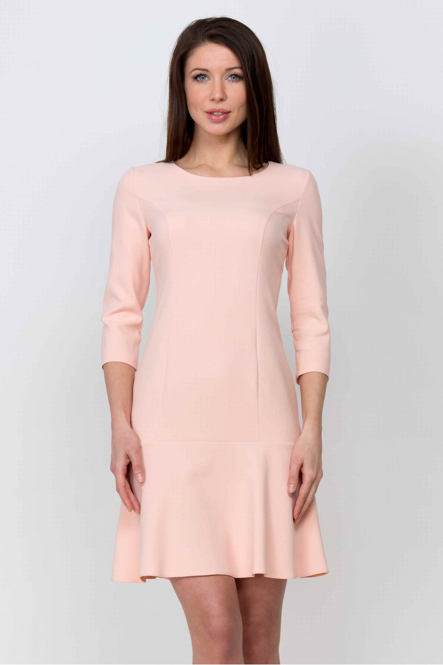 Платье нежно-розового цвета из ткани средней плотности с эффектом крепа и легкой эластичностью. Рукав 3/4, застежка-молния по спинке до талии. Подол - широкий волан. Платье поможет создать легкий весенний образ.