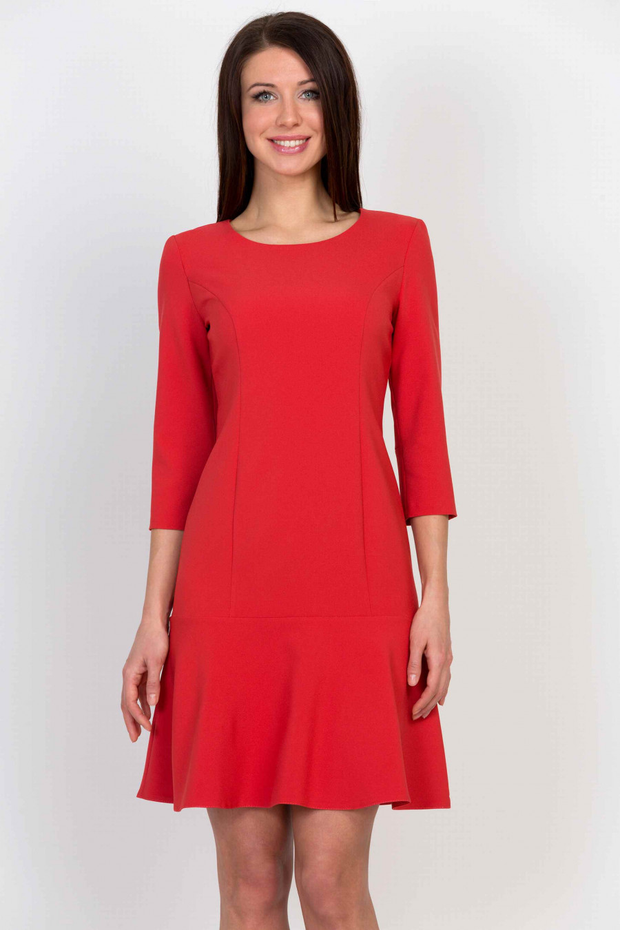 Платье сочно-красного цвета из ткани средней плотности с эффектом крепа. Рукав 3/4, застежка-молния по спинке до талии. Подол - широкий волан. Благодаря легкой эластичности и яркости цвета ткани, платье идеально облегает фигуру и привлекает мужское внимание.