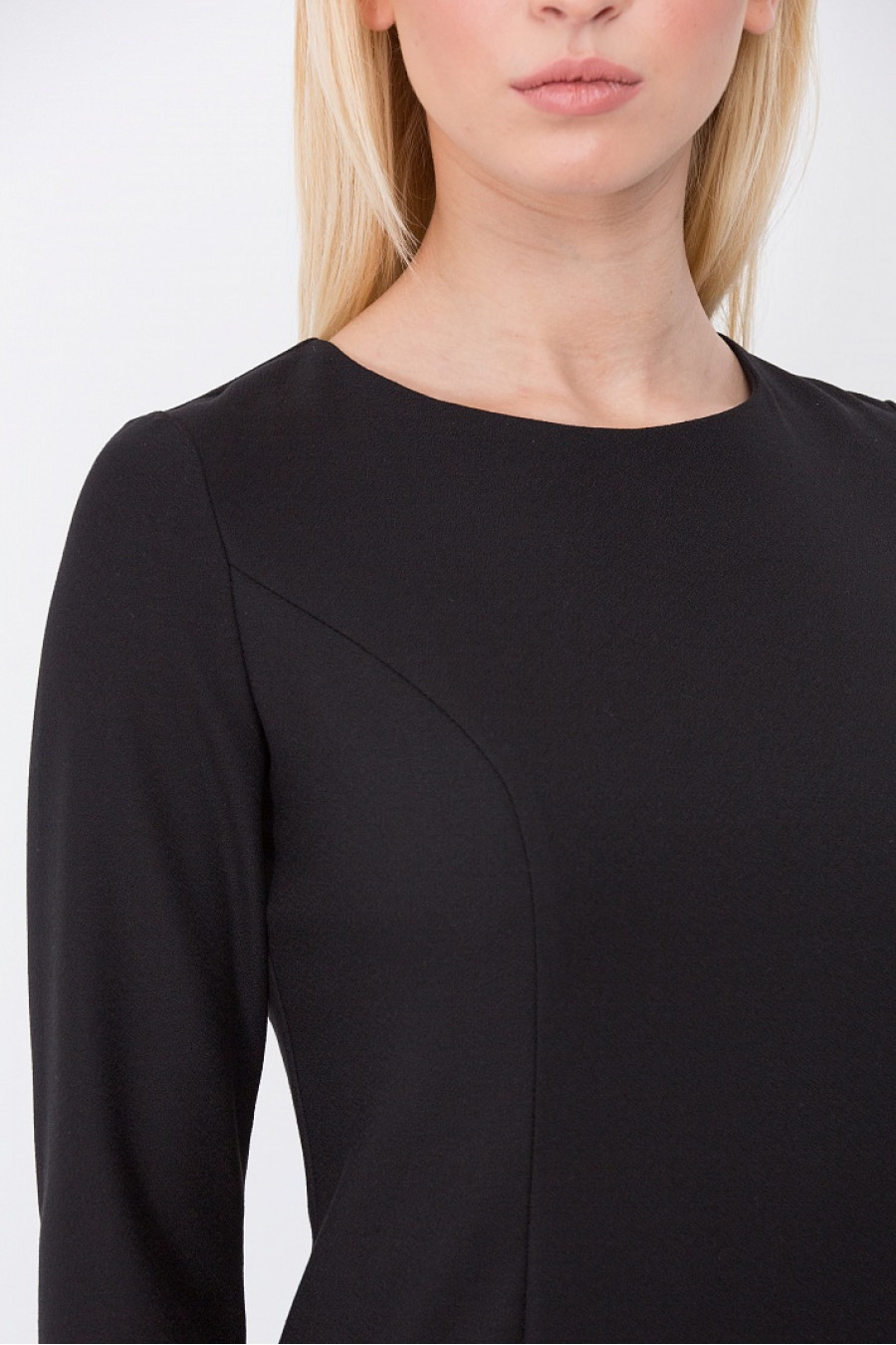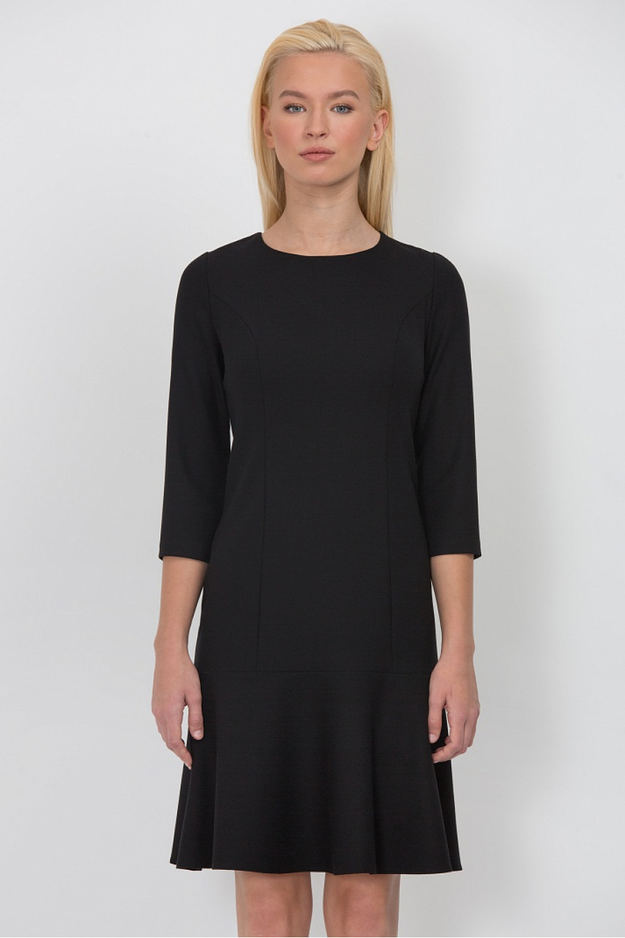 Оригинальная модель в классическом стиле органично впишется в повседневный гардероб. Платье с округлым воротником. Рукава 3/4. Юбка модели расклешенная с небольшими сборками. Модель выполнена из качественной ткани. Сзади-застёжка на потайную молнию. Длина - 90 см. Длина градируется от размера к размеру. Без подкладки. Станет замечательным дополнением к Вашему гардеробу.