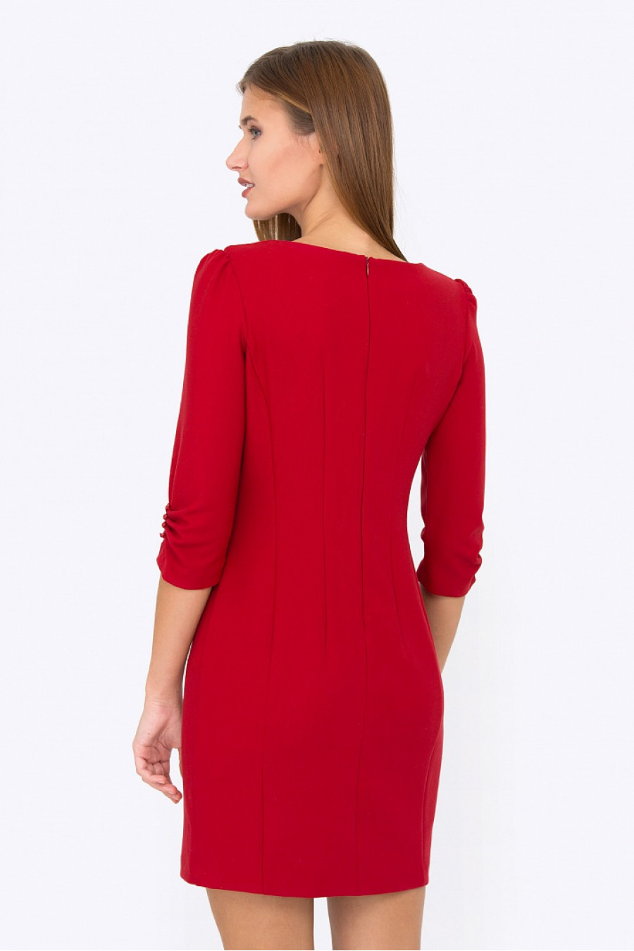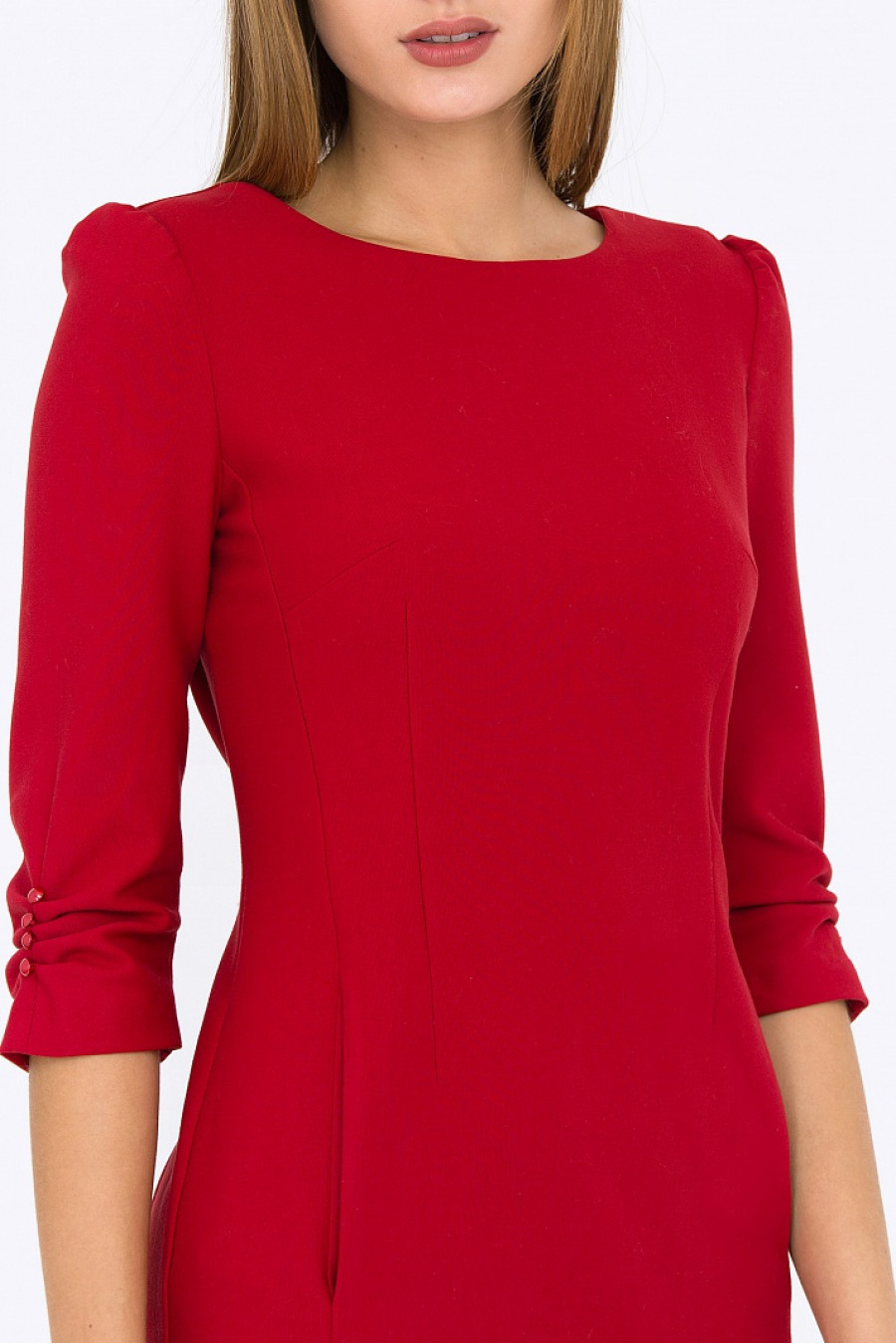 Платье мини красного цвета. Ткань плотная, эластичная, приятная на ощупь. Рукава 3/4, оформлены складками с декоративными пуговицами. Благодаря вертикальным рельефам платье стройнит, подчеркивает привлекательные изгибы женской фигуры. Отличный вариант для офиса или вечеринки. Длина градируется от размера к размеру:42 размер - 88 см50 размер - 97 см.Рост фотомодели 175 см.