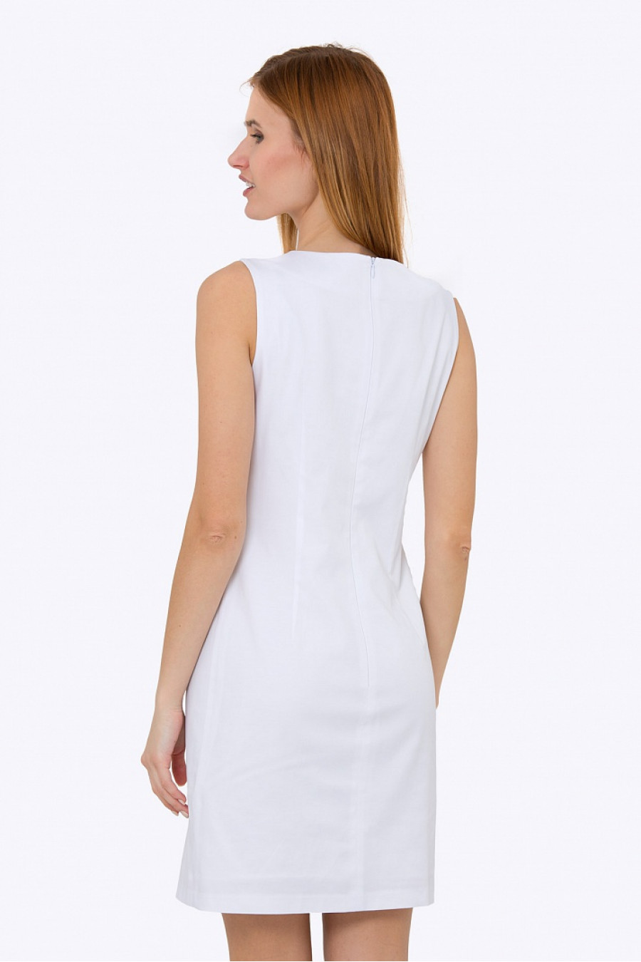Легкое приталенное платье без рукавов. Ткань приятная к телу, белого цвета. Есть подкладка из хлопка. Застежка-молния на спинке. Платье выглядит очень эффектно и стильно. Отличная модель для весенне-летнего сезона, модель хорошо подойдет как для повседневной носки, так и для коктейльной вечеринки. Длина градируется от размера к размеру. Рост фотомодели 175 см.