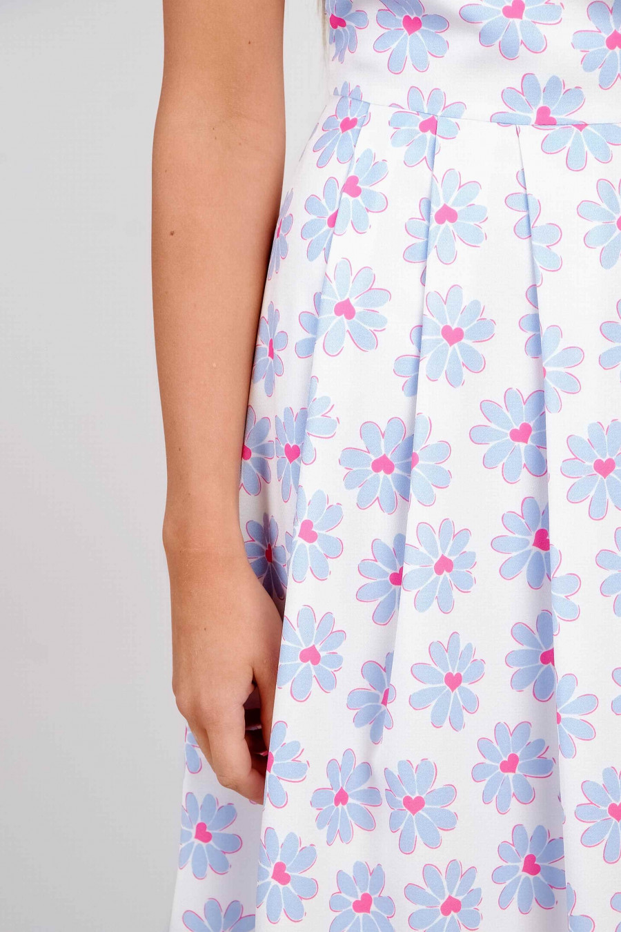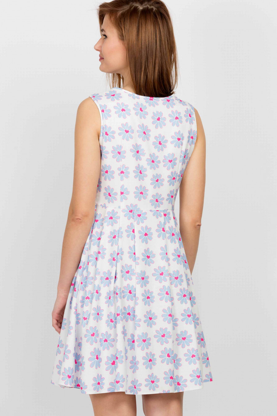Легкое платье без рукавов, отрезное по линии талии, юбка с элегантными складками. Ткань белая с цветочным принтом - мягкая, приятная на ощупь с эффектом крепа. Горловина оформлена аккуратными складками. Есть легкая хлопковая подкладка. Сбоку застежка-молния. Платье хорошо сидит по фигуре, зрительно вытягивает силуэт и акцентирует внимание на красивых ножках. Очень нежная и женственная модель.