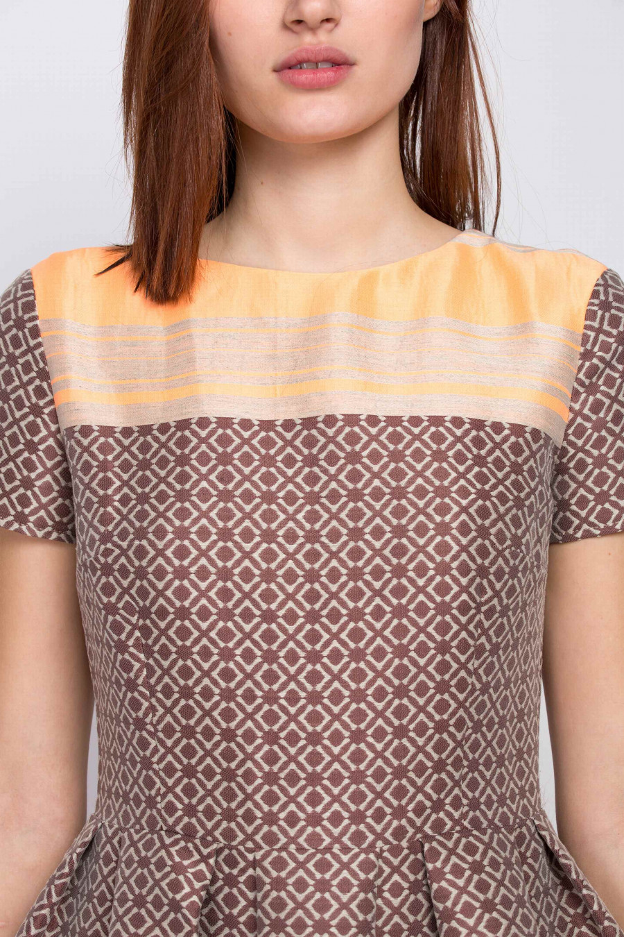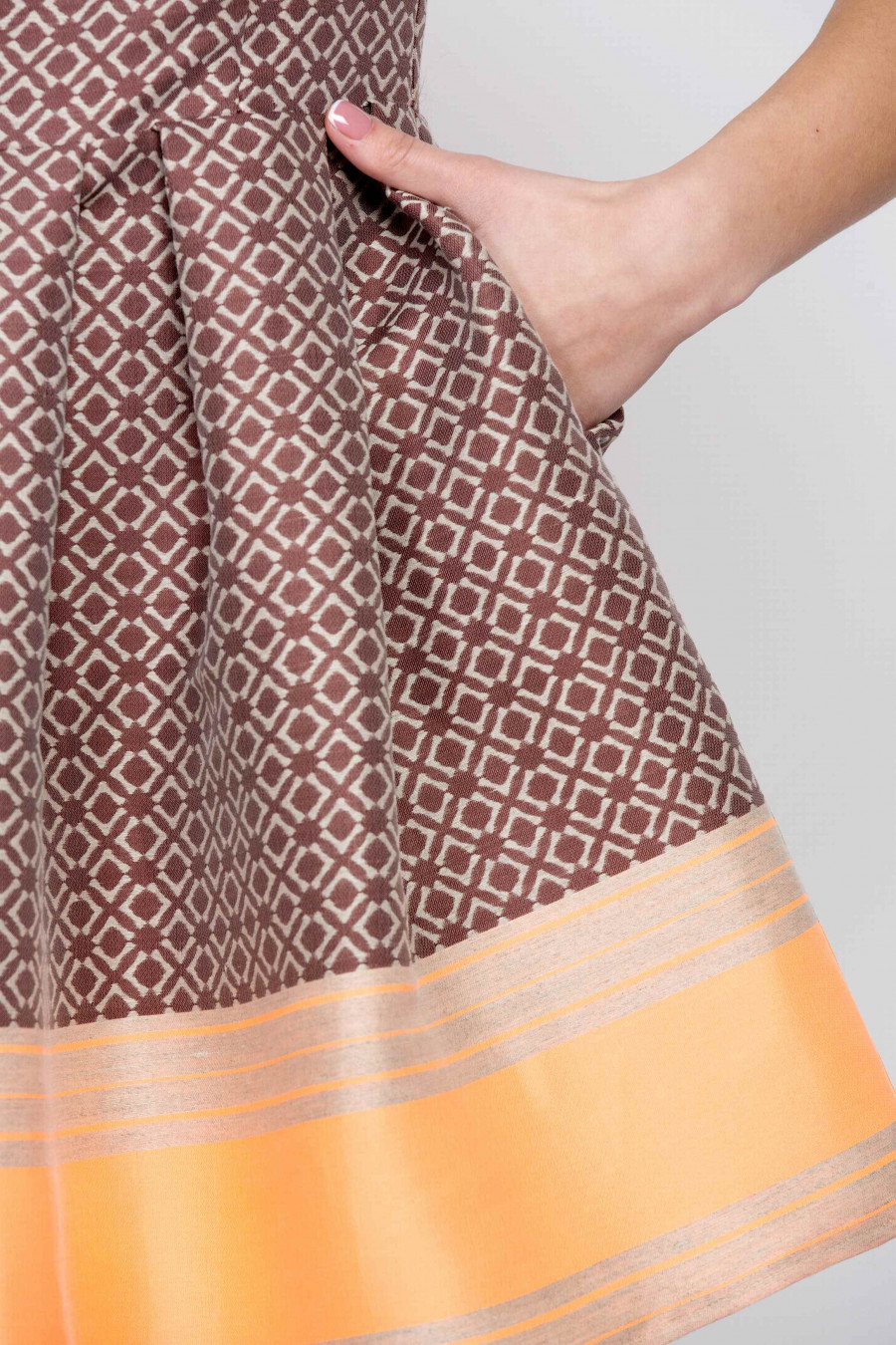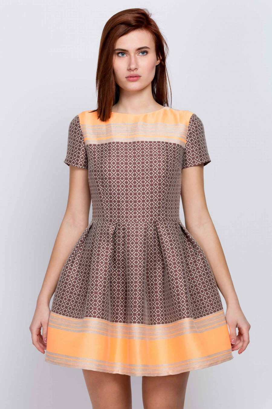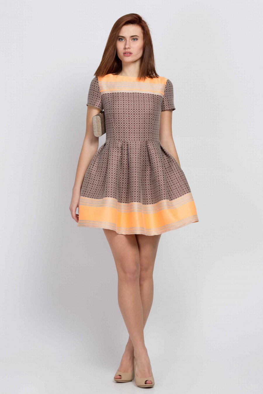 Стильное укороченное платье с пышной юбкой. Отрезное по линии талии с функциональными кармашками в швах. Ткань коричневая с принтом, средней плотности, хорошо держит форму. Есть легкая подкладка по лифу, на спинке застежка-молния. Благодаря пышной юбке и ярким оранжевым полосам по верху и низу создается эффект кукольного платья. Отличный выбор для молодой, уверенной в себе девушки.
