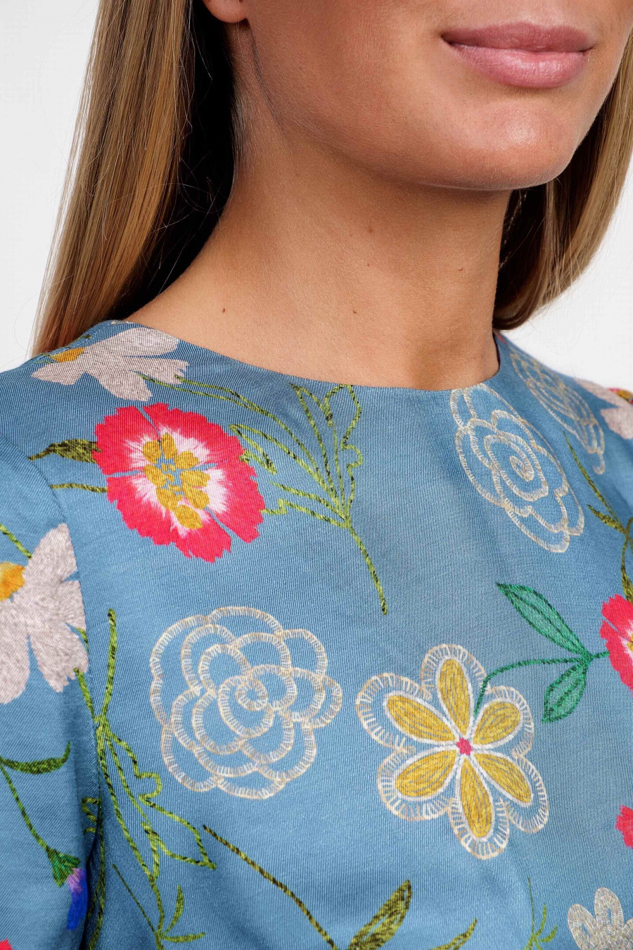 Роскошное струящееся платье в пол. Ткань легкая, приятная к телу с небольшим эффектом глянца. Платье голубого цвета с ярким цветочным принтом. Рукава короткие, застегивается сзади на пуговицу в тон. Без подкладки. Есть резинка на талии, которая корректирует посадку и формирует мягкие складки на юбке. В комплекте идет тканевый пояс. Стильная и элегантная модель хорошо смотрится с туфлями на высоком каблуке.