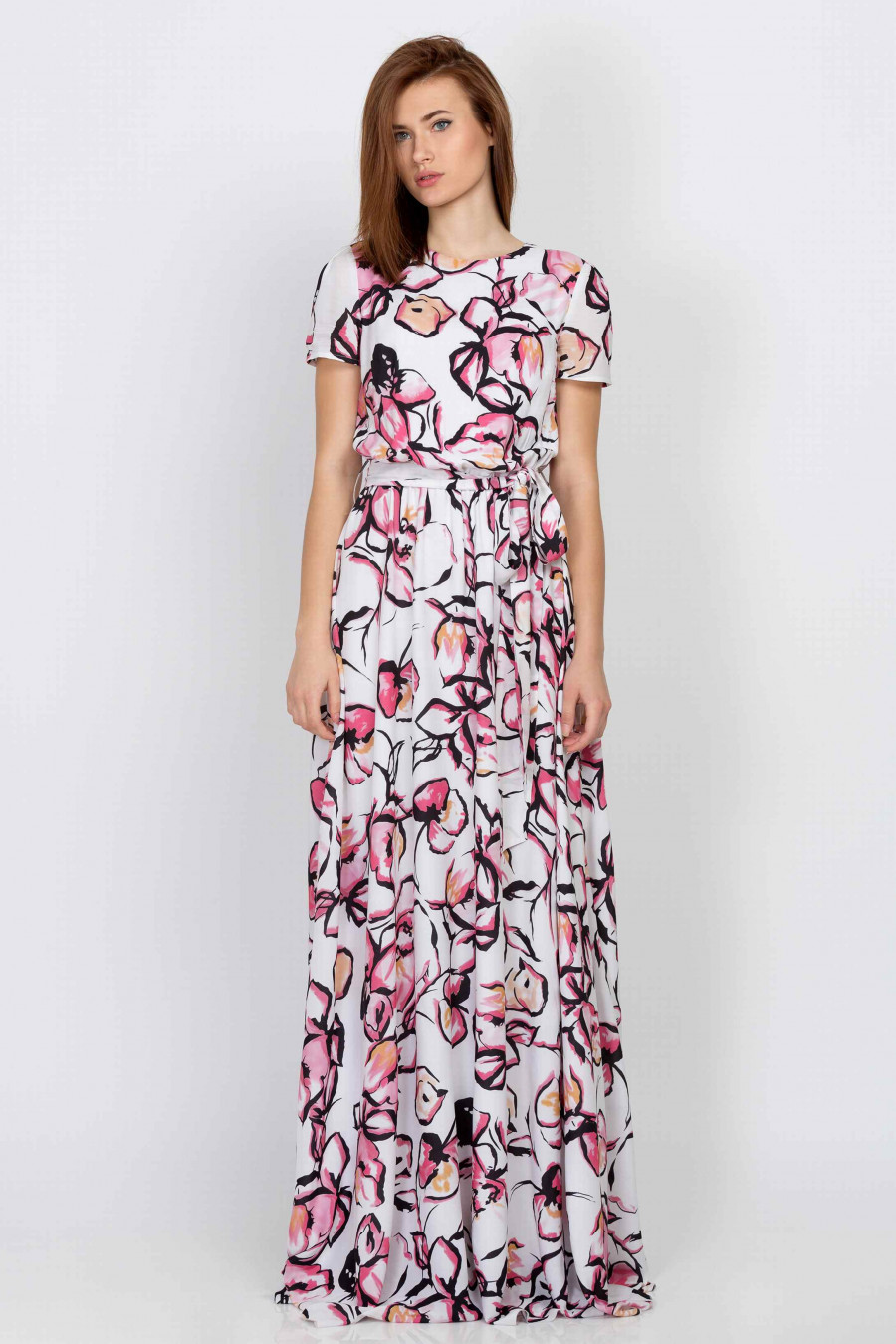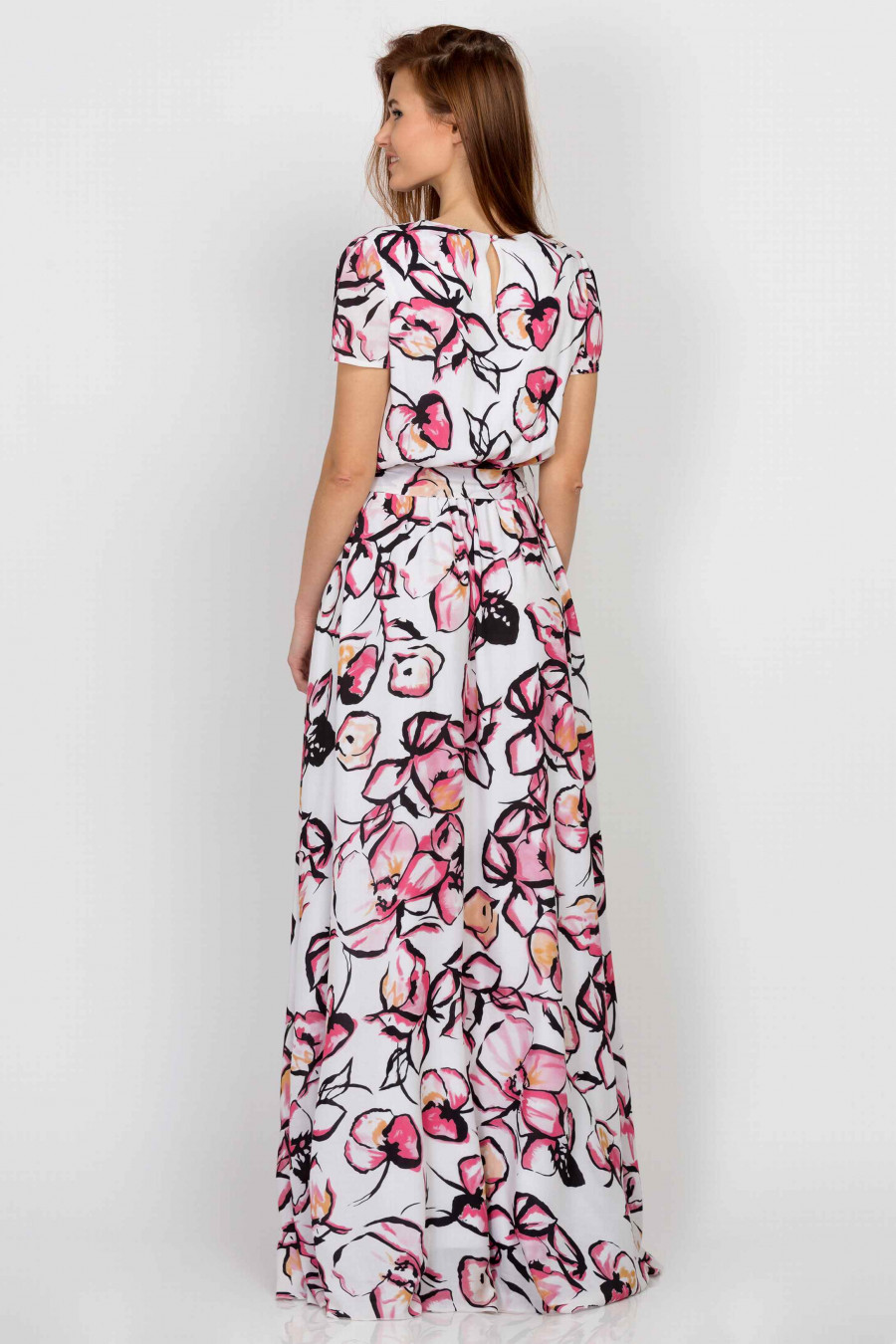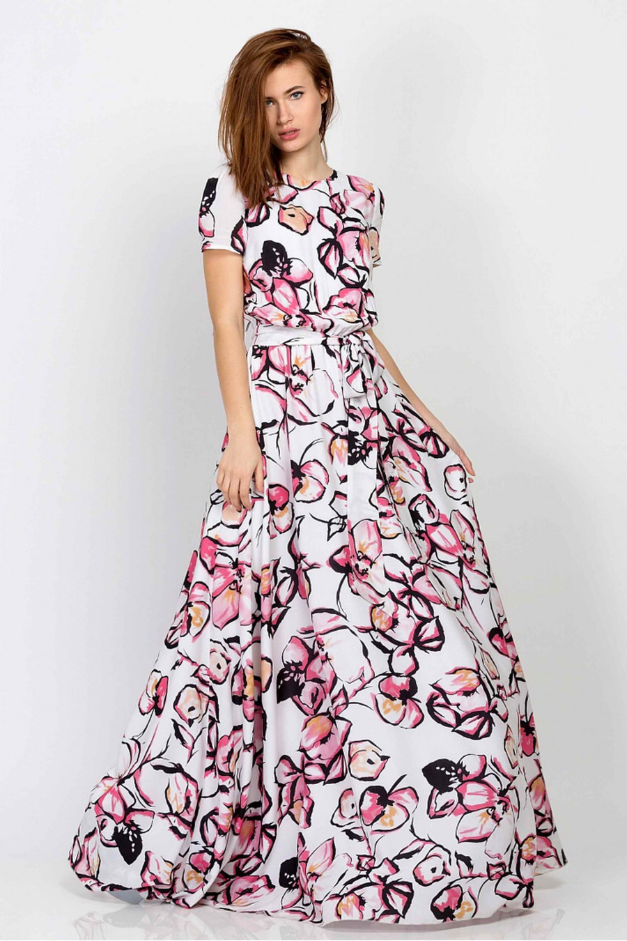 Роскошное струящееся платье в пол. Ткань легкая, приятная к телу с небольшим эффектом глянца. Платье белого цвета с ярким цветочным принтом. Есть легкая хлопковая подкладка. Рукава короткие, застегивается сзади на пуговицу в тон. Есть резинка на талии, которая корректирует посадку и формирует мягкие складки на юбке. В комплекте идет тканевый пояс. Стильная и элегантная модель хорошо смотрится с туфлями на высоком каблуке. Рост фотомодели 175 см. Длина: 167 см.