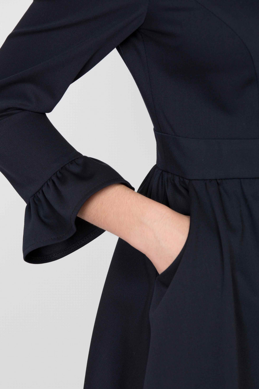 Стильное укороченное платье, отрезное по линии талии из плотной, приятной к телу ткани темно-синего цвета. Силуэт приталенный, юбка с мягкими складками, украшена аккуратными карманами по бокам. Платье без подкладки, рукав 3/4 с манжетами в виде небольших воланов. Воротник-стойка со сборками и подол украшены декоративной кружевной лентой белого цвета. Спереди есть декоративная планка на белых пуговицах, сзади застежка-молния. Отличный молодежный вариант.