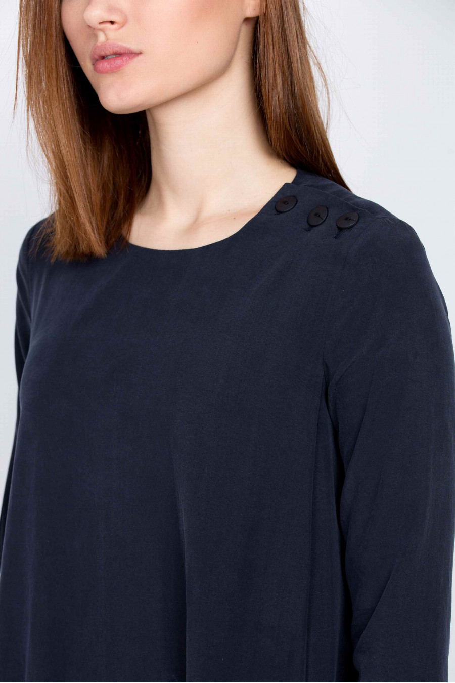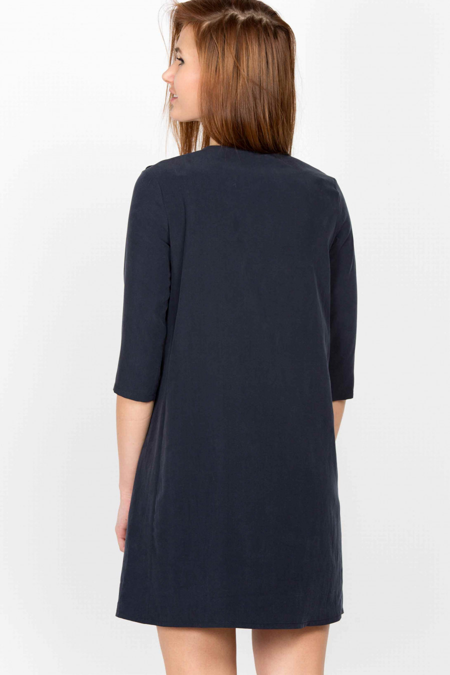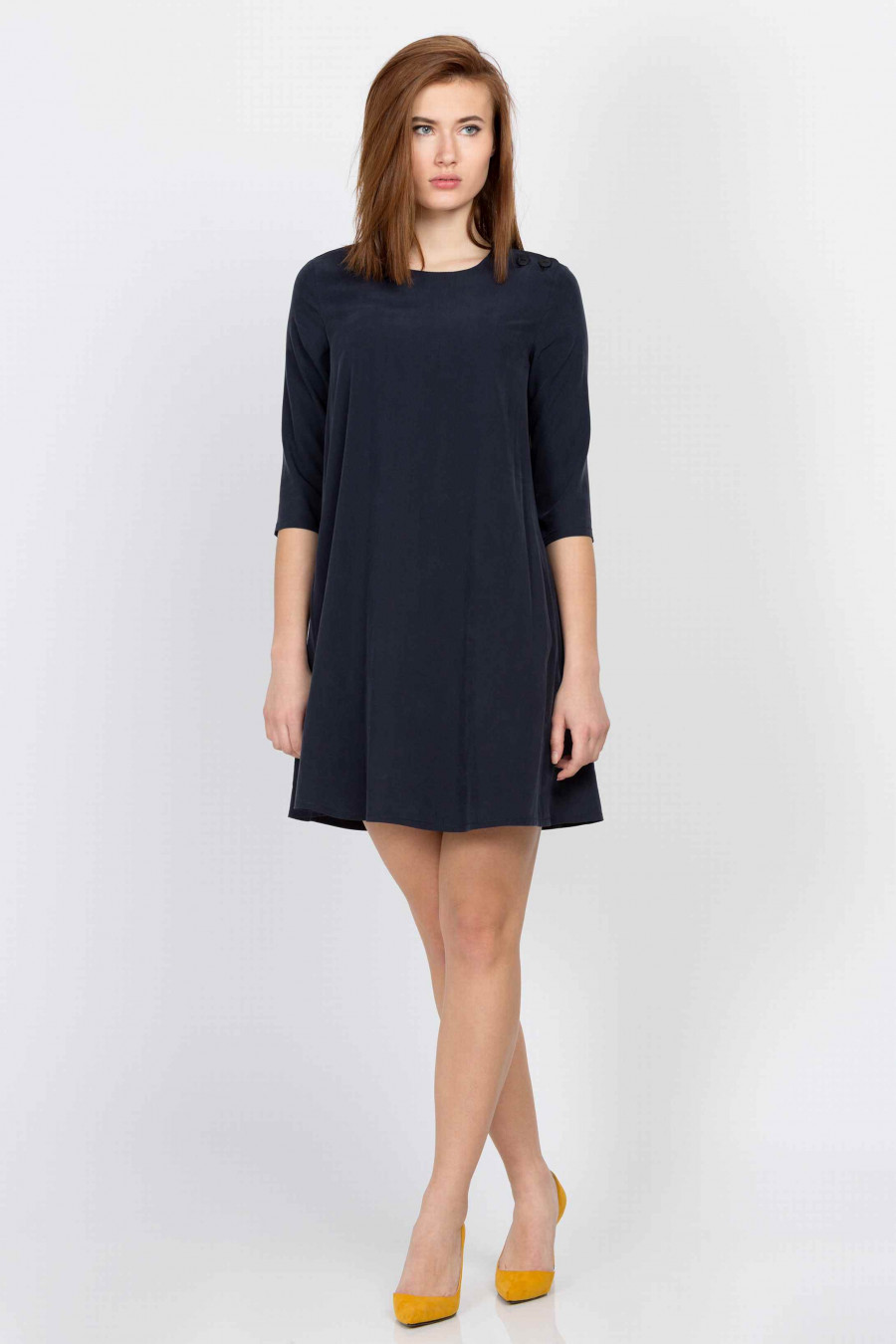 Стильное темно-синее платье А-силуэта. Ткань легкая, бархатистая, очень приятная на ощупь. В боковых рельефах есть функциональные кармашки. Без подкладки, рукав 3/4. Очень удобное и комфортное платье, отлично подойдет как для офиса, так и для коктейльной вечеринки.