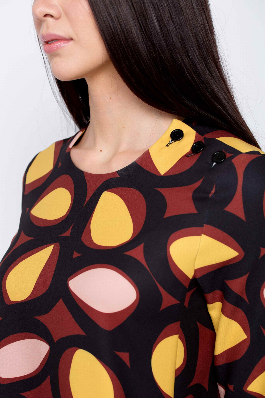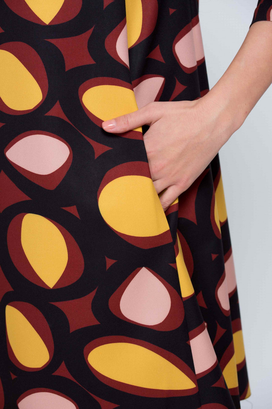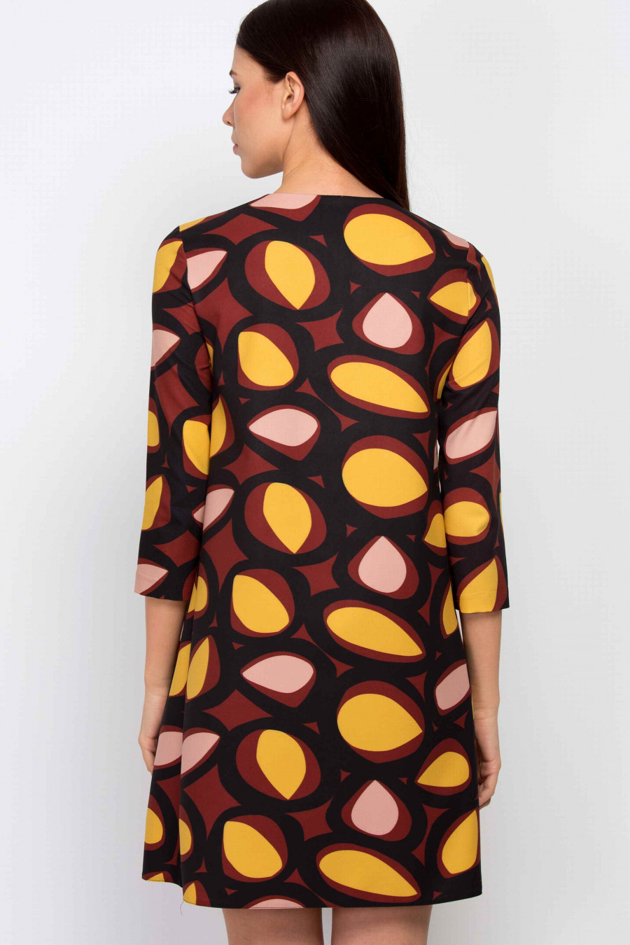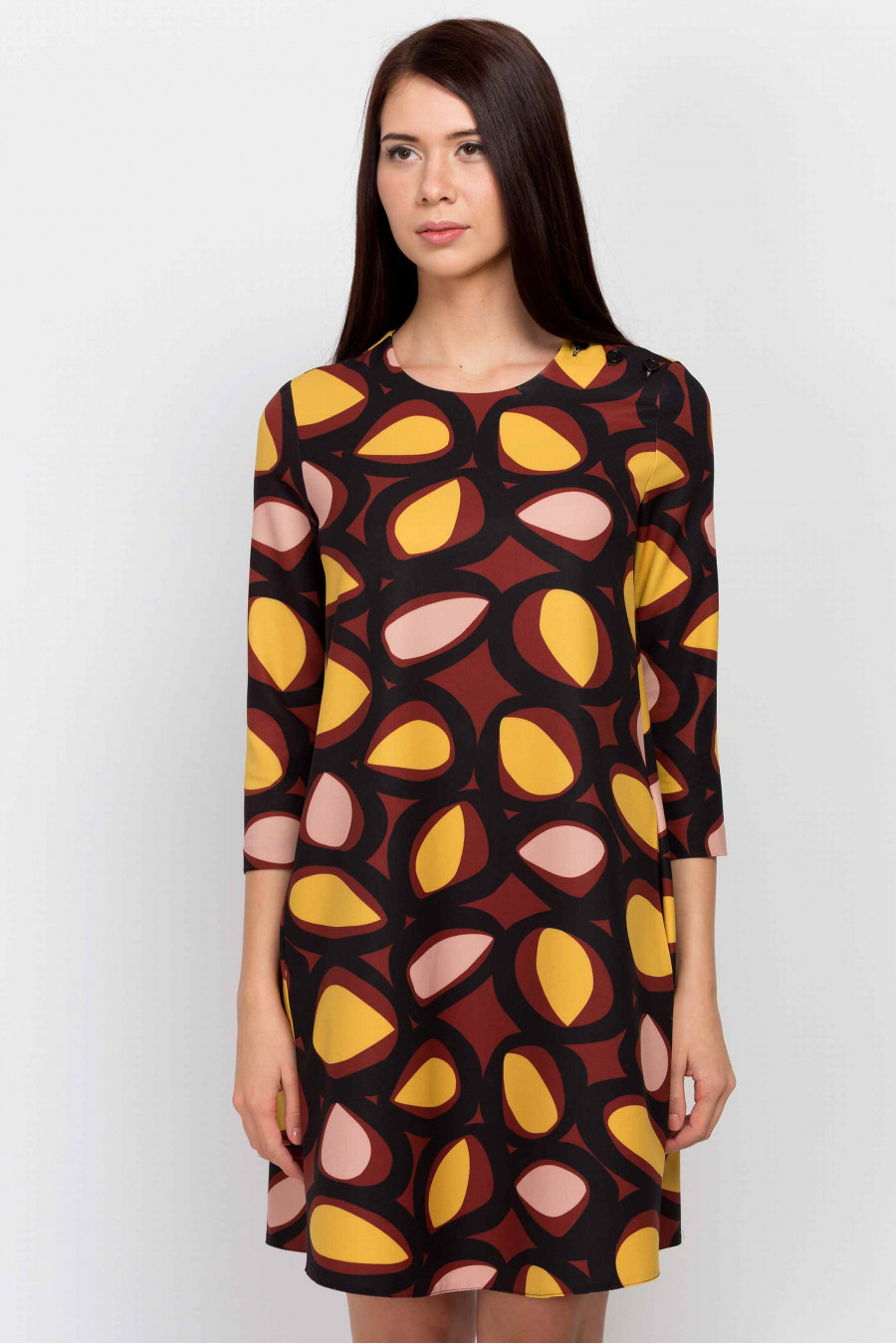 Стильное коричневое платье А-силуэта. Ткань средней плотности, очень приятная на ощупь с оригинальным принтом. В боковых рельефах есть функциональные кармашки. Без подкладки, рукав 3/4. Очень удобное и комфортное платье, отлично подойдет как для офиса, так и для коктейльной вечеринки.