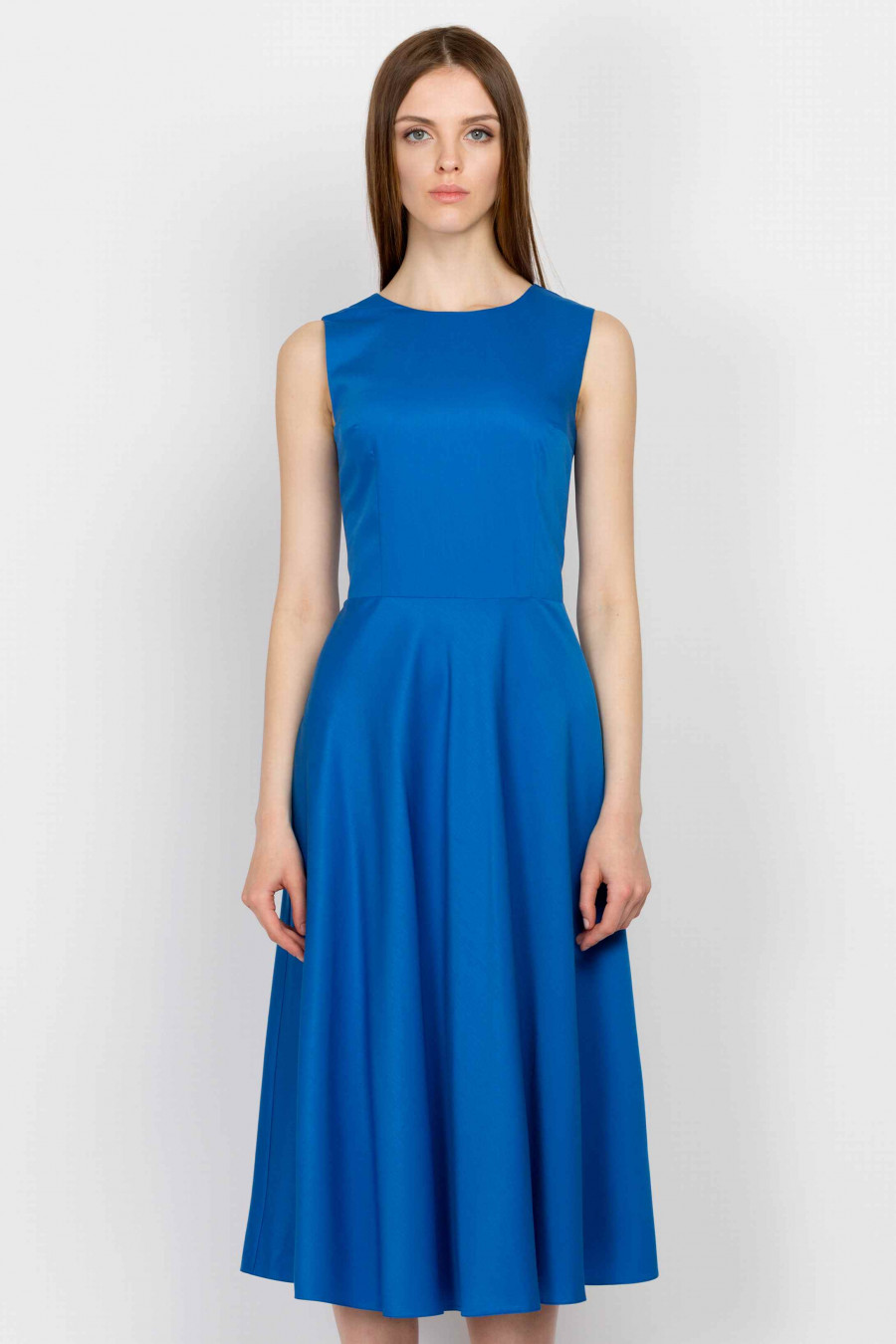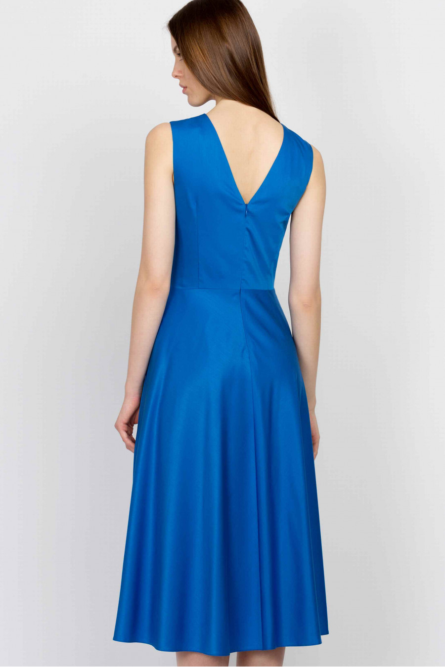 Элегантное женственное платье, отрезное по линии талии без рукавов. Ткань гладкая, струящаяся с легким эффектом глянца королевского голубого цвета. На спинке застежка-молния и V-образный вырез. Есть легкая подкладка из натурального хлопка. Платье хорошо сидит по фигуре, зрительно вытягивает силуэт. Отлично сочетается с классическими туфлями.