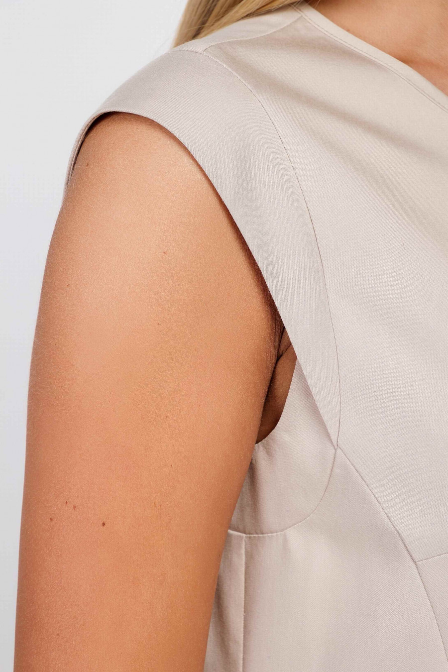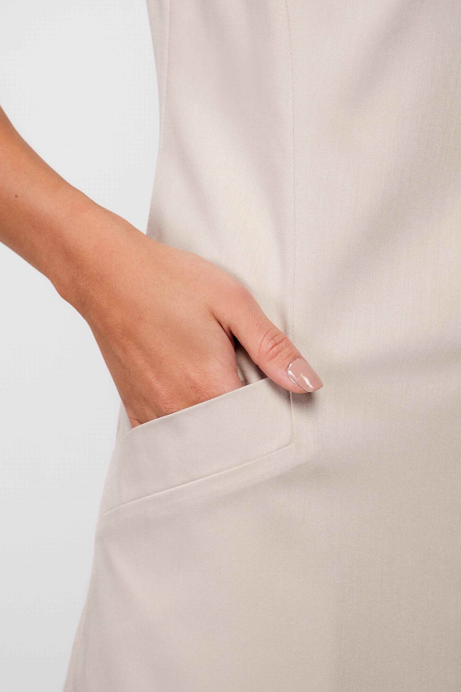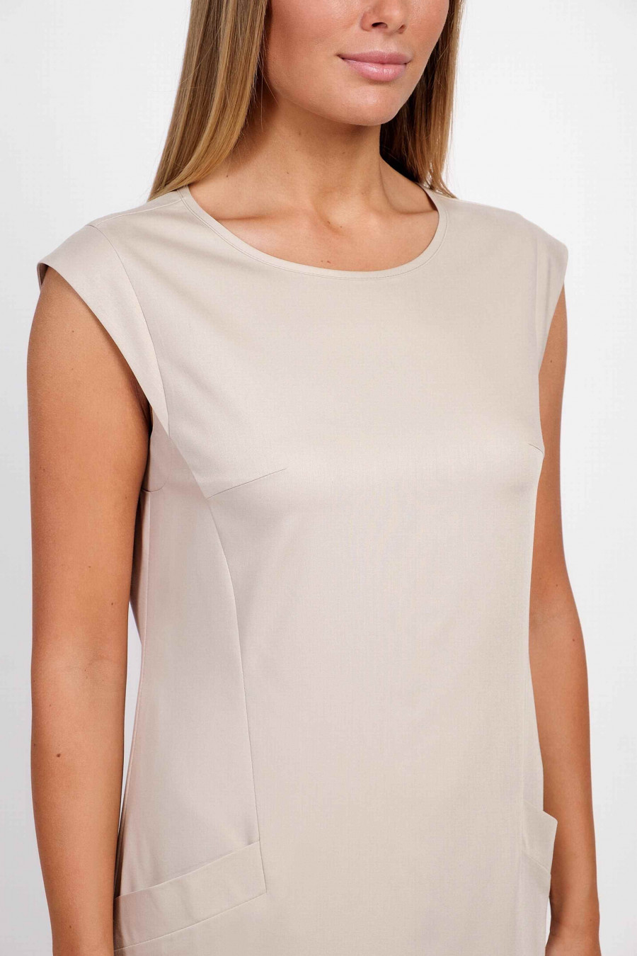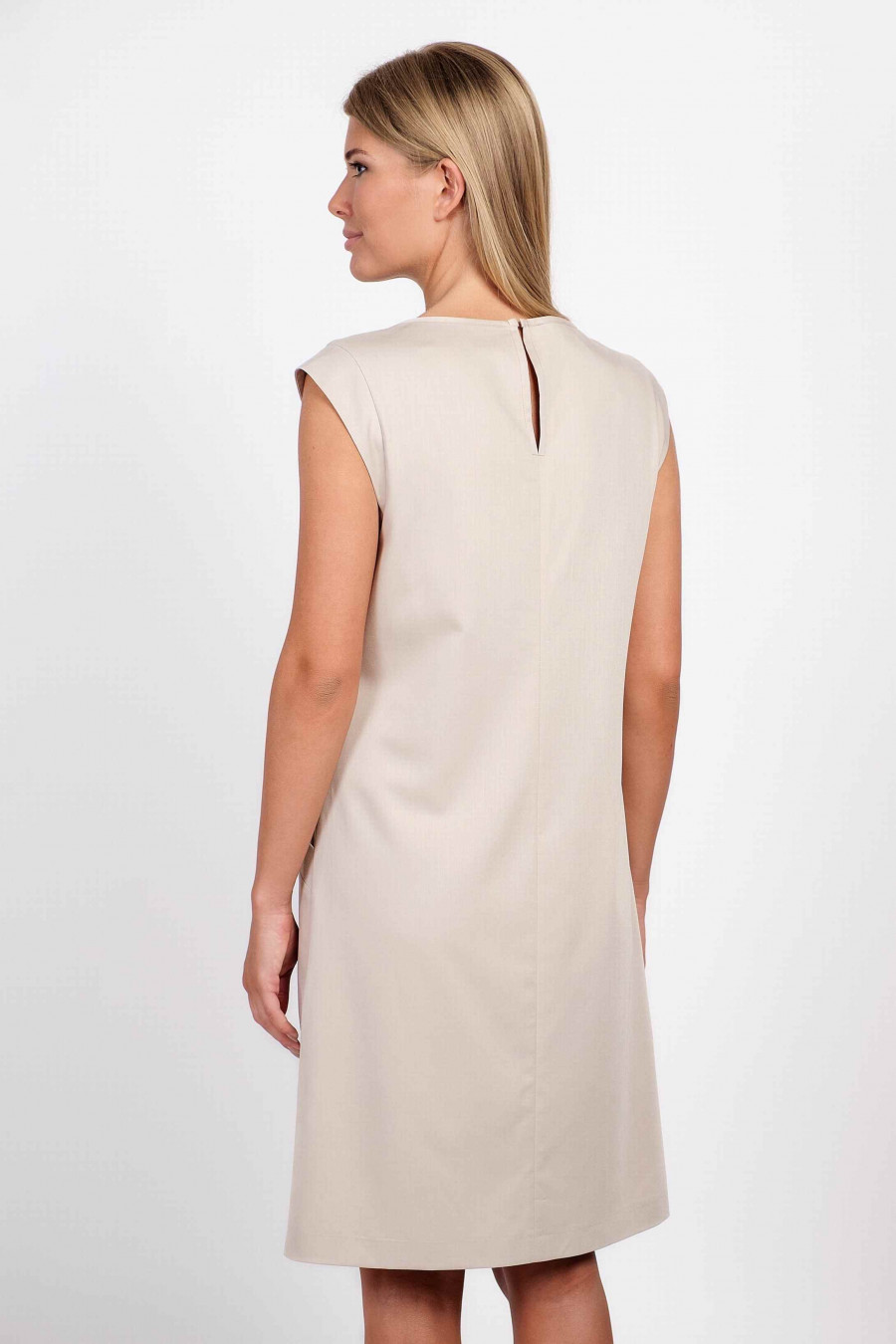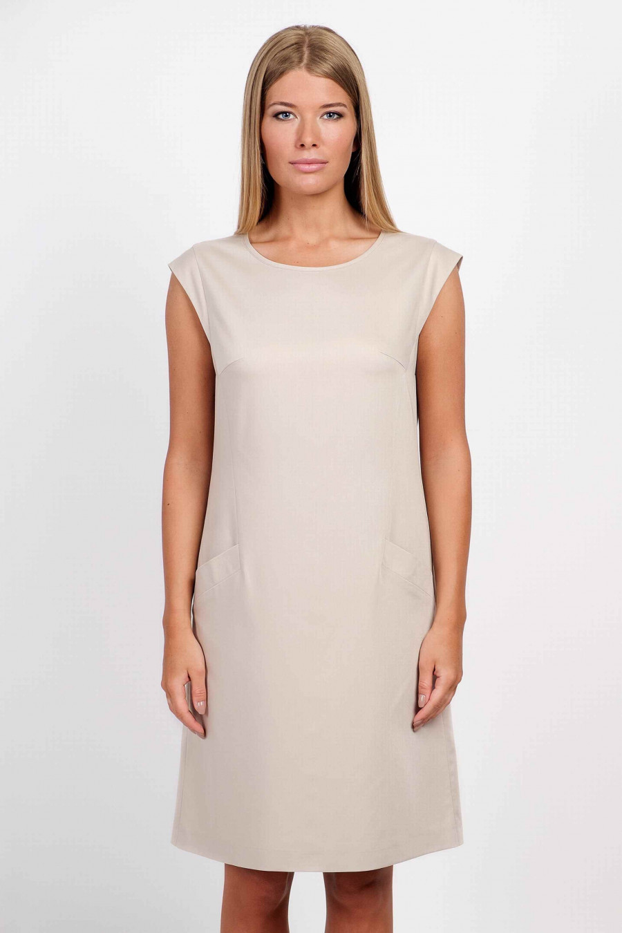 Легкое, приятное к телу платье мягкого бежевого цвета, без подкладки. Крой платья прямой с укороченными рукавами-крылышками, по бокам есть элегантные кармашки. Очень удобное платье, отлично подойдет на повседневную носку.