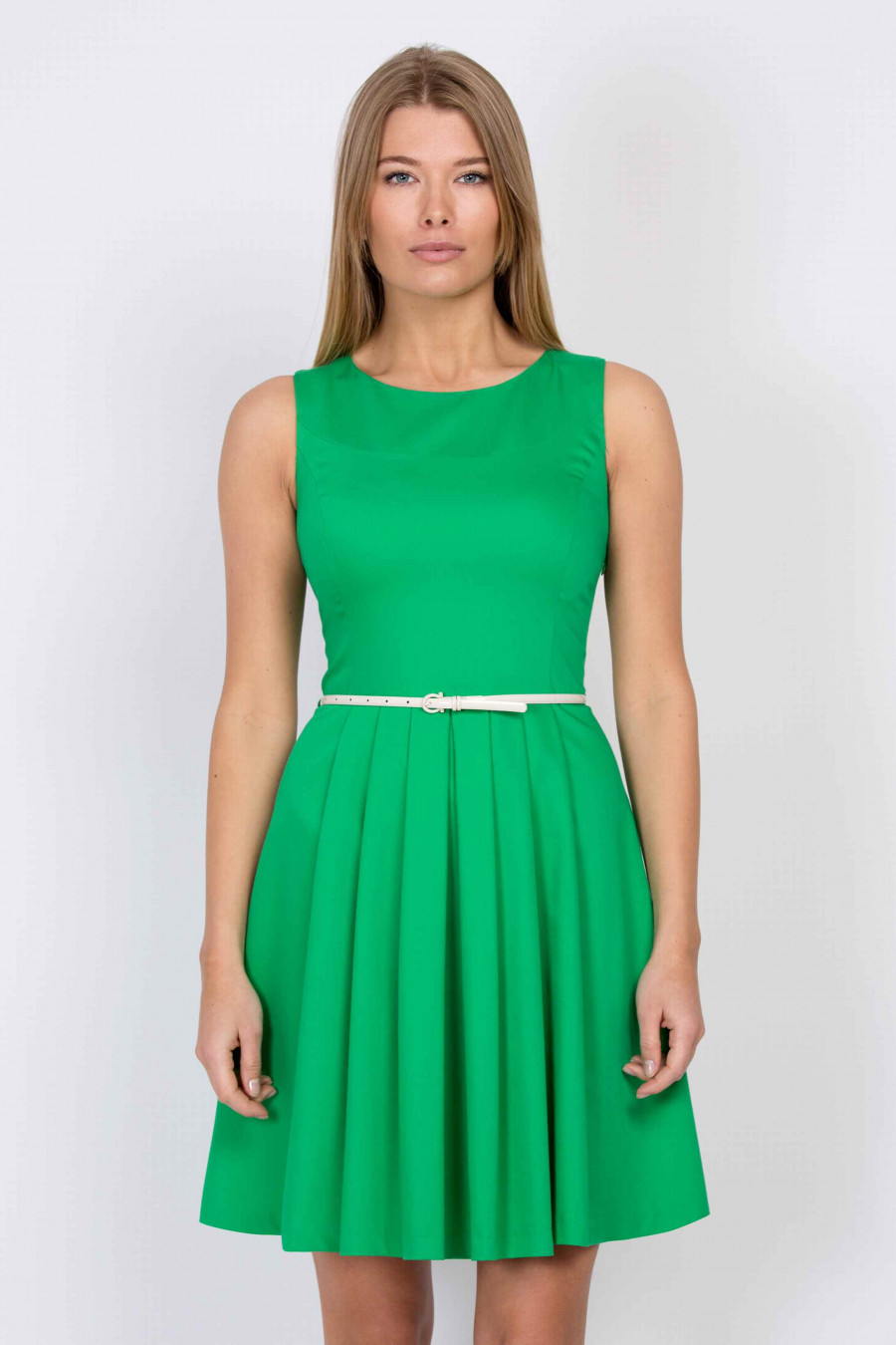 Легкое приталенное платье, отрезное по линии талии, лиф рельефный, юбка слегка расклешенная с мягкими складками. Ткань зеленого цвета, приятная к телу, без подклада. Застежка-молния сбоку. На поясе есть шлевки, ремешок продается отдельно. Отличная летняя модель, хорошо подчеркивает фигуру, зрительно удлиняет ноги.