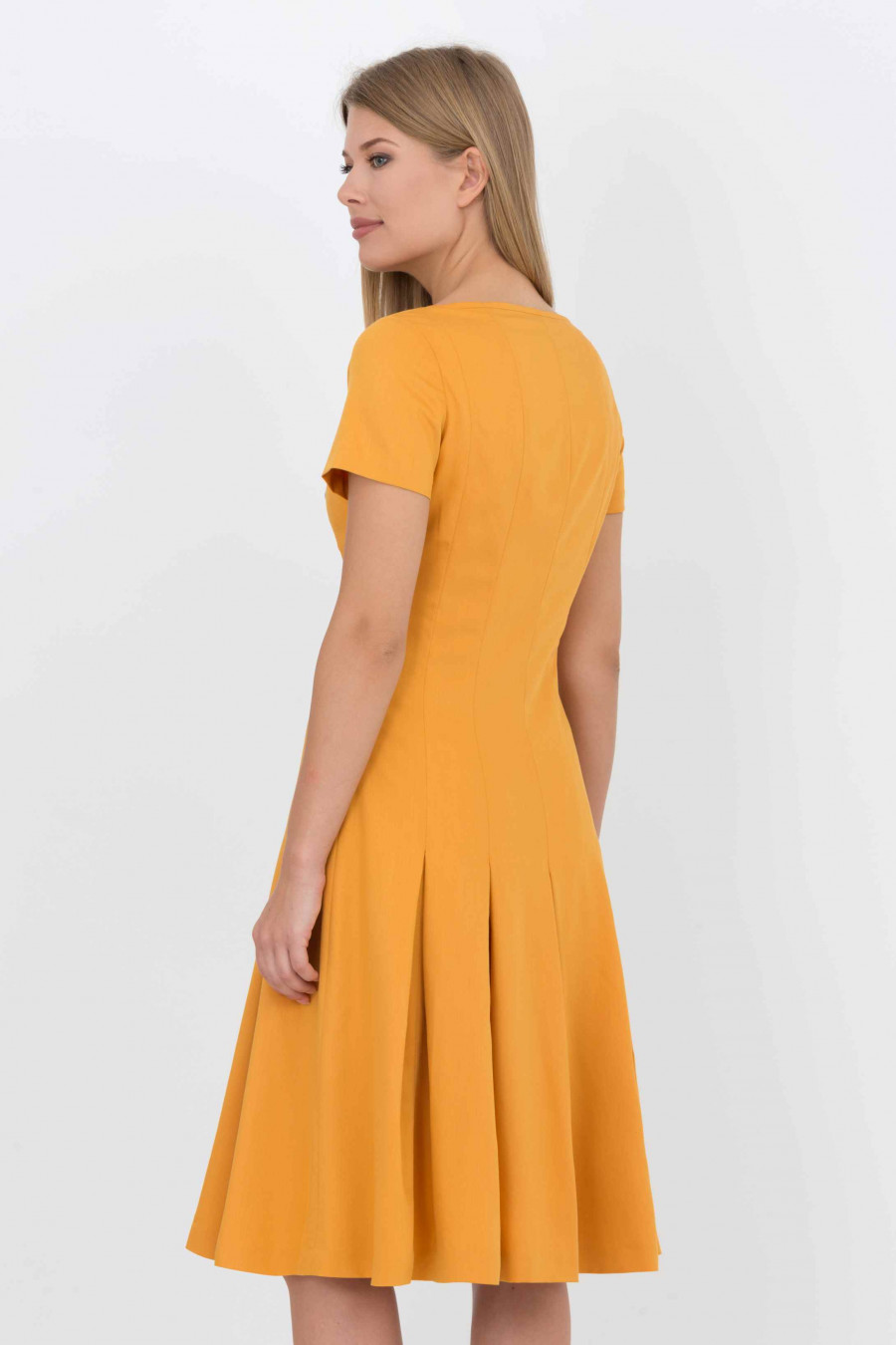 Стильное платье с юбкой, оформленной крупными складками, идеально подойдет для работы и вечерних прогулок.