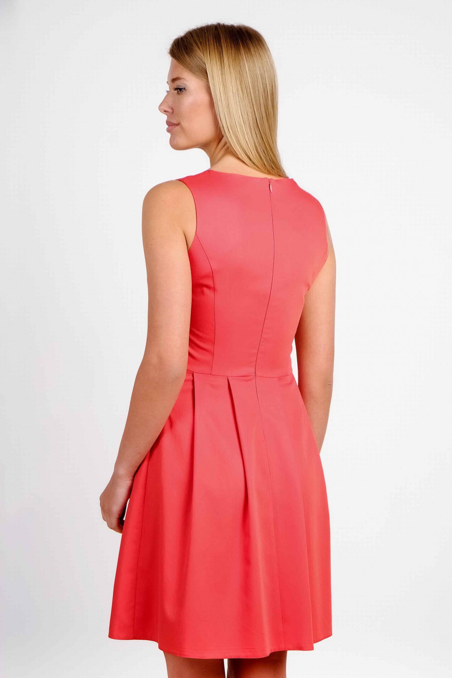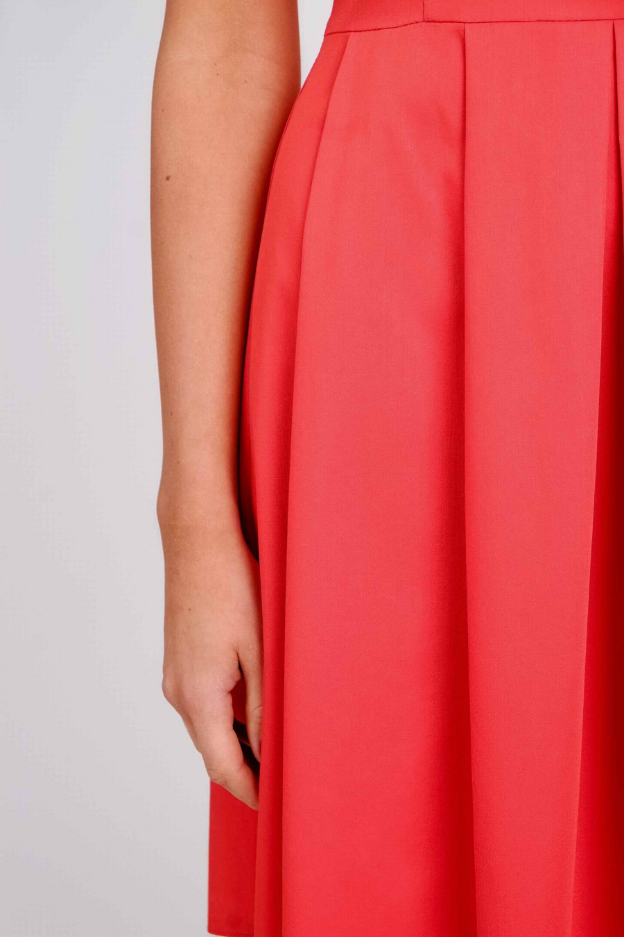 Легкое приталенное платье, отрезное по линии талии, лиф рельефный, юбка слегка расклешенная с мягкими складками. Ткань темно-оранжевого цвета, приятная к телу, без подкладки. Застежка-молния на спинке. Отличная летняя модель, хорошо подчеркивает фигуру, зрительно удлиняет ноги.