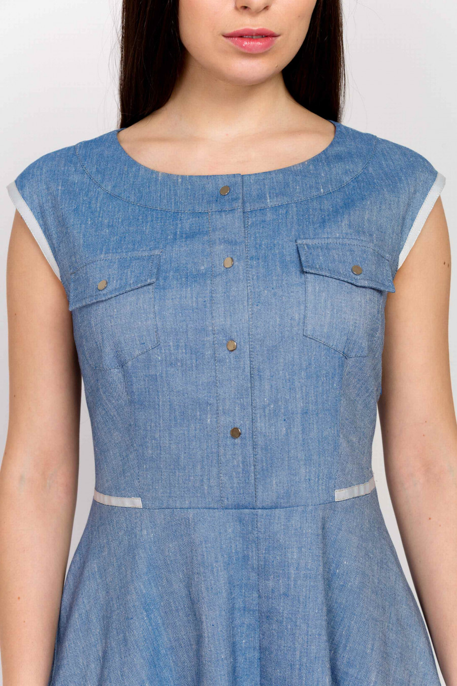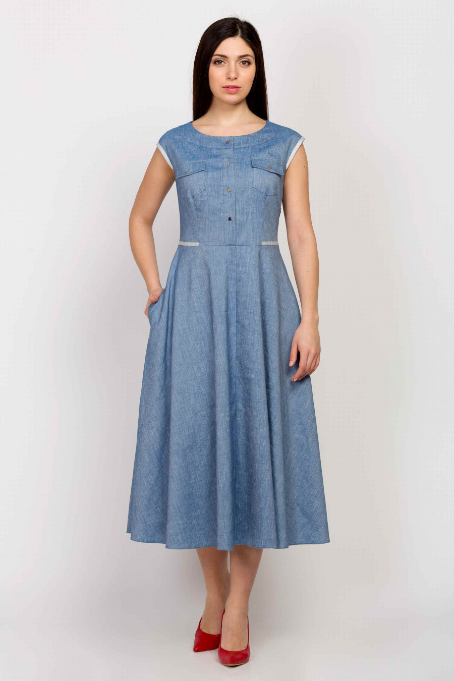 Приталенное платье с расклешенной юбкой-четырехклинкой. Ткань эластичная на основе льна голубого цвета с эффектом «под джинсу». Платье по линии талии и краю рукавов отделано светлой тесьмой. Спереди аккуратные накладные кармашки с клапанами и застежка-планка на металлических кнопках. Платье сочетает в себе элементы классического и casual стиля, поэтому хорошо смотрится как с элегантными лодочками, так и демократичными слипонами. Отличная модель на повседневную носку.