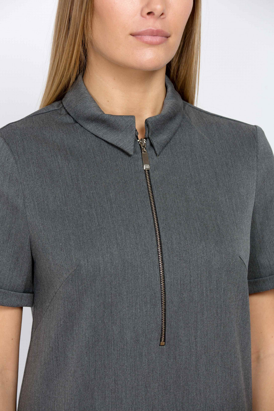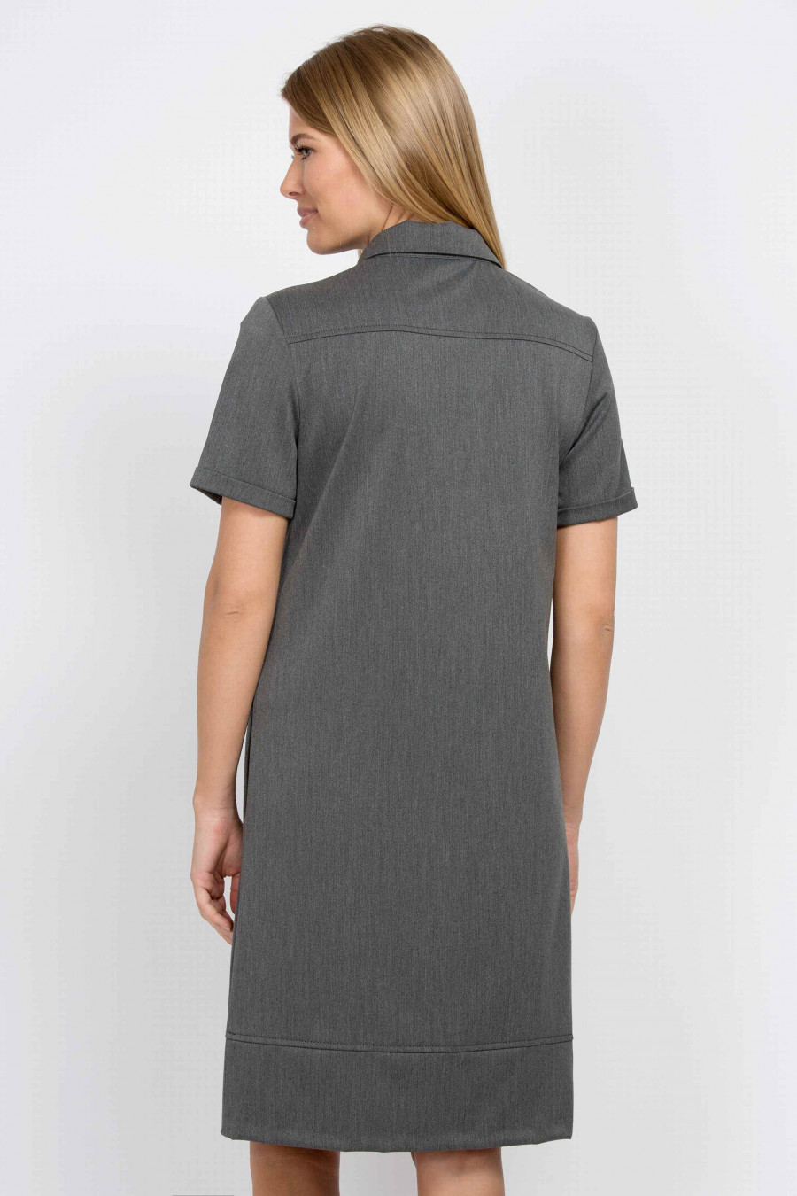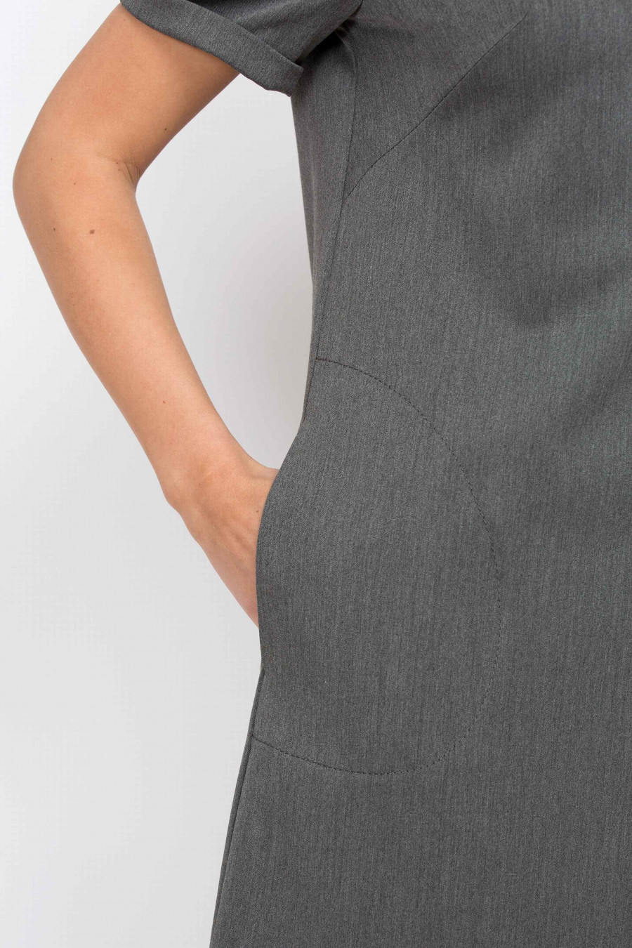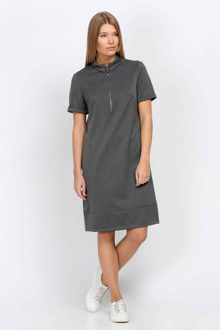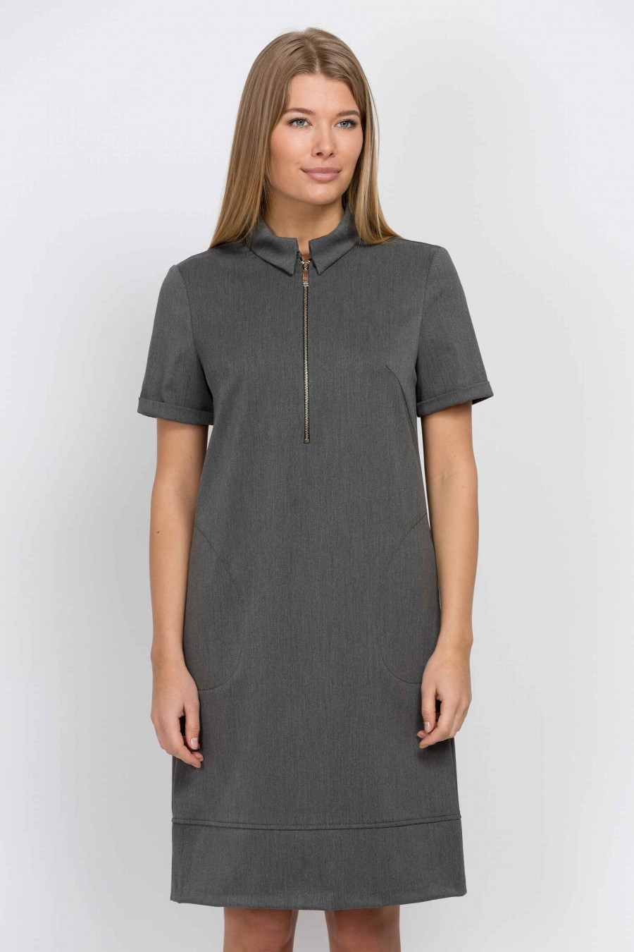 Удобное платье прямого кроя в спортивном стиле. Ткань приятная к телу, эластичная серого цвета. Рукава короткие с манжетами. Спереди застежка-молния и функциональные кармашки, есть аккуратный воротничок. Платье очень комфортное, неприхотливое в носке, идеально подойдет на каждый день. Без подкладки. Хороший выбор для весенне-летнего сезона.