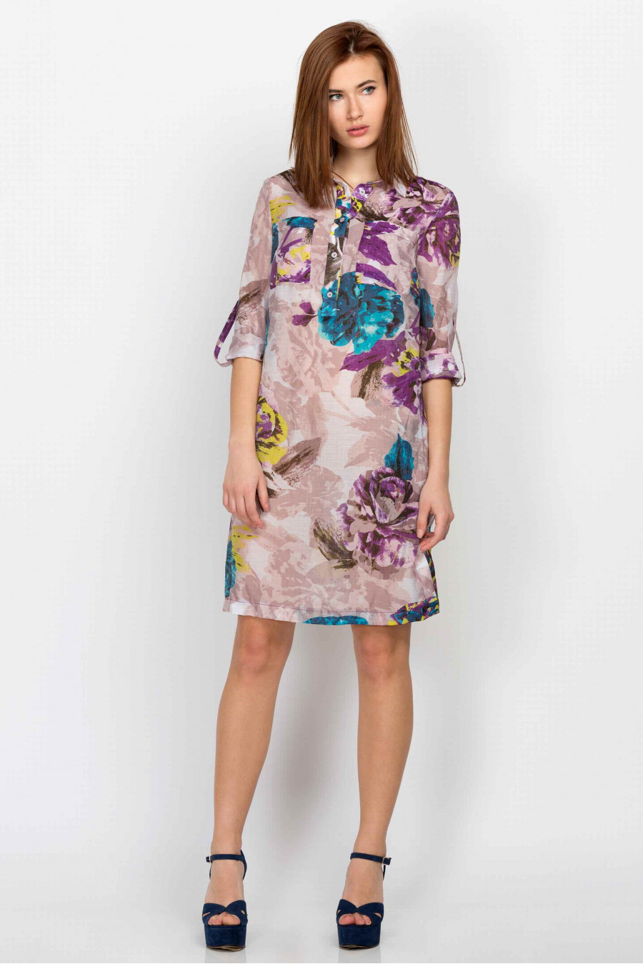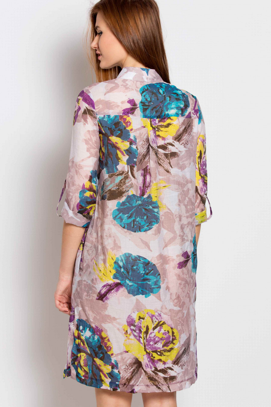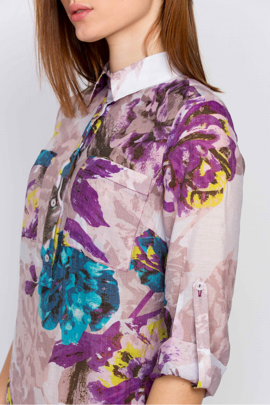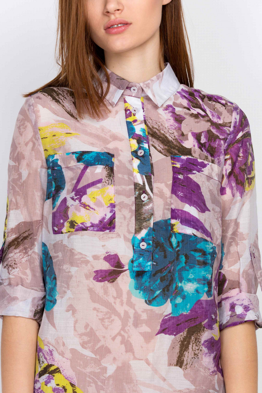Стильная туника с воротничком. Ткань легкая с ярким цветочным принтом. Спереди два накладных кармашка. Рукава 3/4 с хлястиком на пуговице. Туника просвечивает, отличная модель для пляжного сезона. В повседневной жизни тунику можно носить с телесной майкой и легинсами.