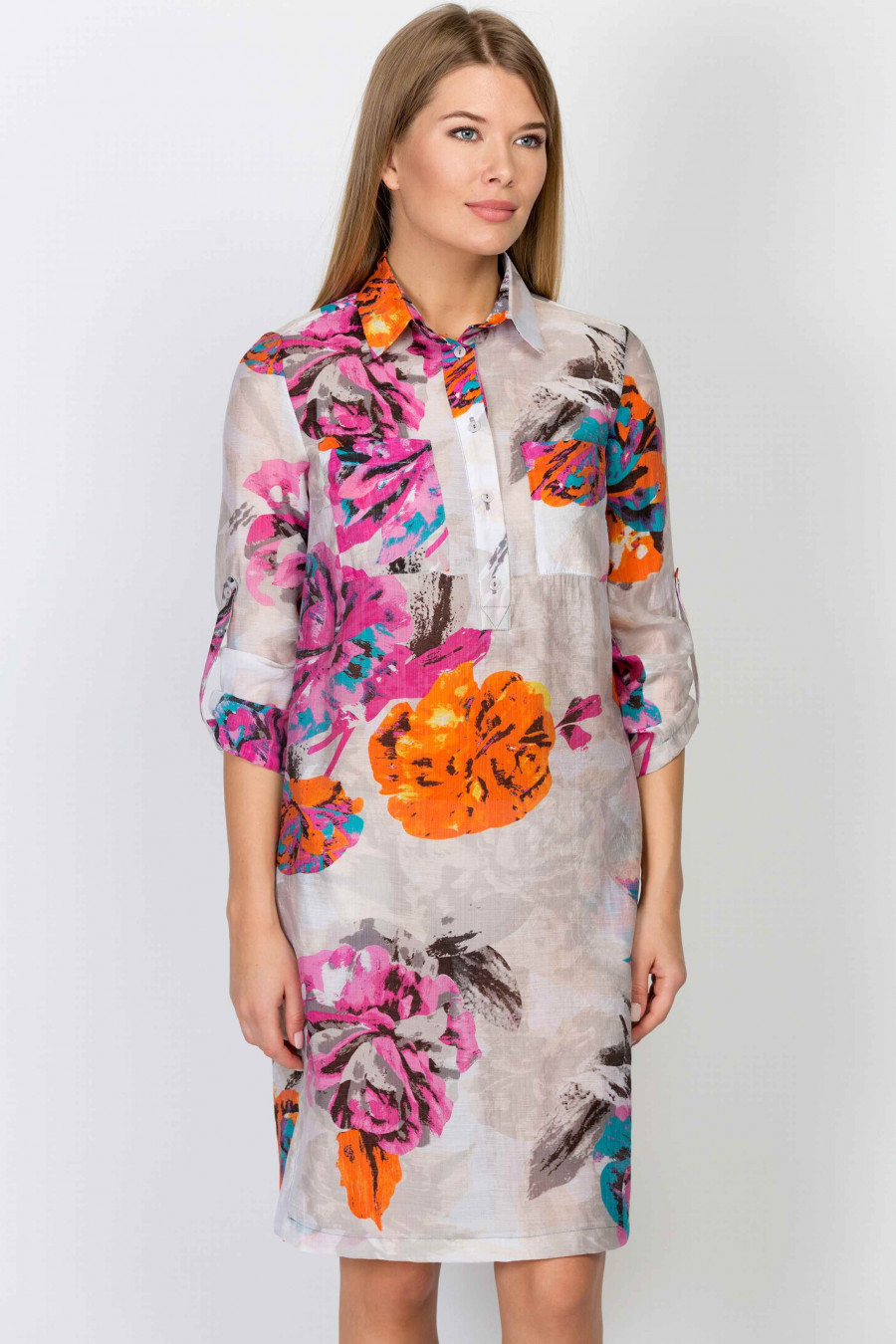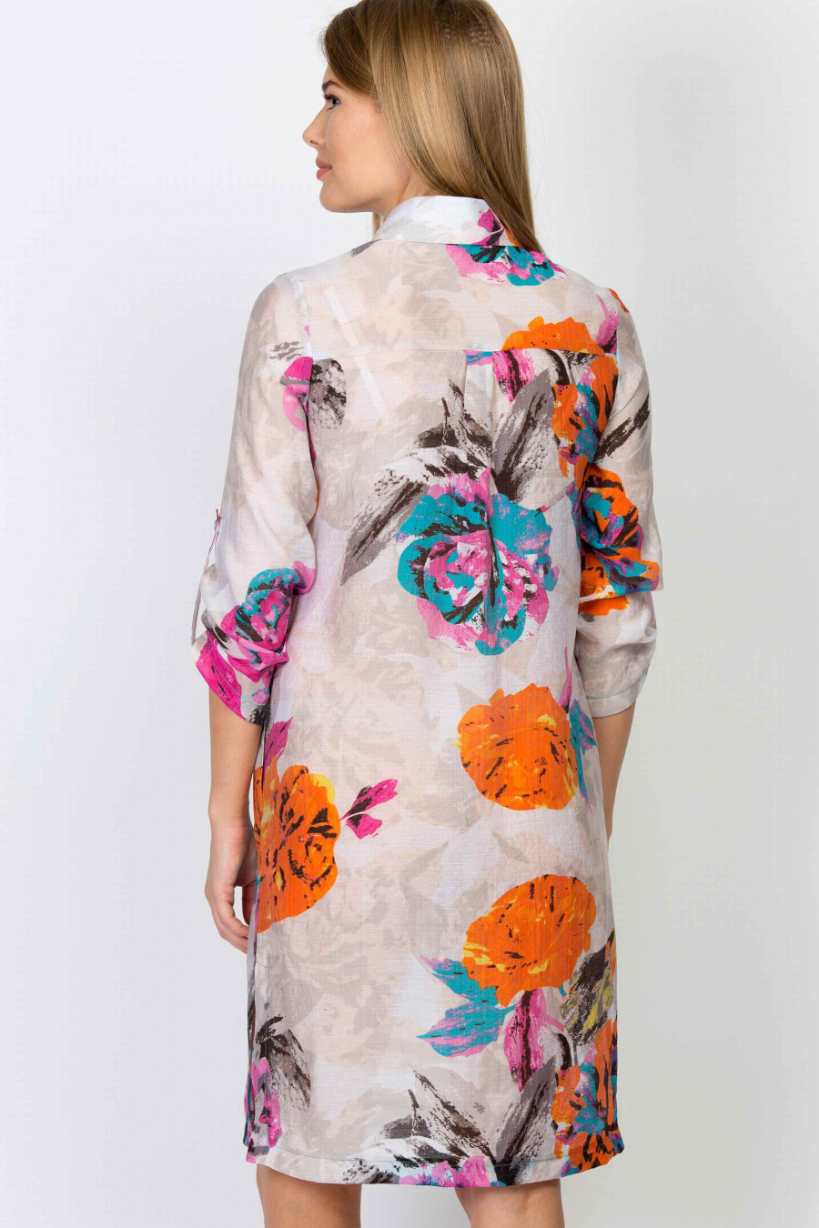 Стильная туника с воротничком. Ткань легкая с ярким цветочным принтом. Спереди два накладных кармашка. Рукава 3/4 с хлястиком на пуговице. Туника просвечивает, отличная модель для пляжного сезона. В повседневной жизни тунику можно носить с телесной майкой и легинсами.