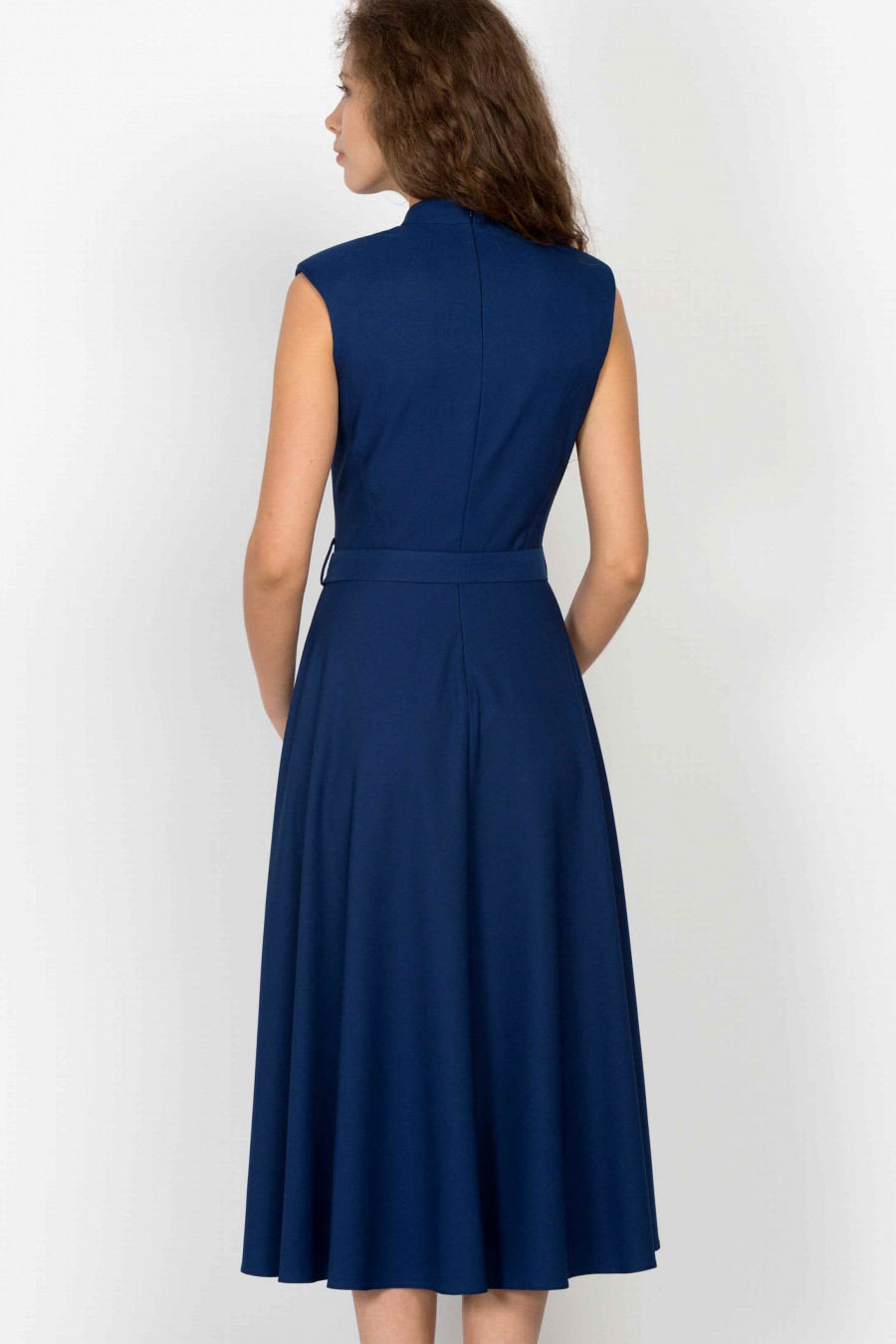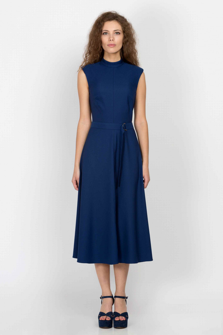 Женственное платье с воротником-стойкой отрезное по линии талии. Ткань фактурная, эластичная, приятная к телу, темно-синего цвета. Юбка расклешенная, струящаяся. На поясе есть шлевки, в комплект входит элегантный тканевый пояс. Платье без подкладки. На спинке застежка-молния, есть небольшие поролоновые плечики. Платье отлично подойдет для повседневной носки. Хорошо сочетается с классическими лодочками.