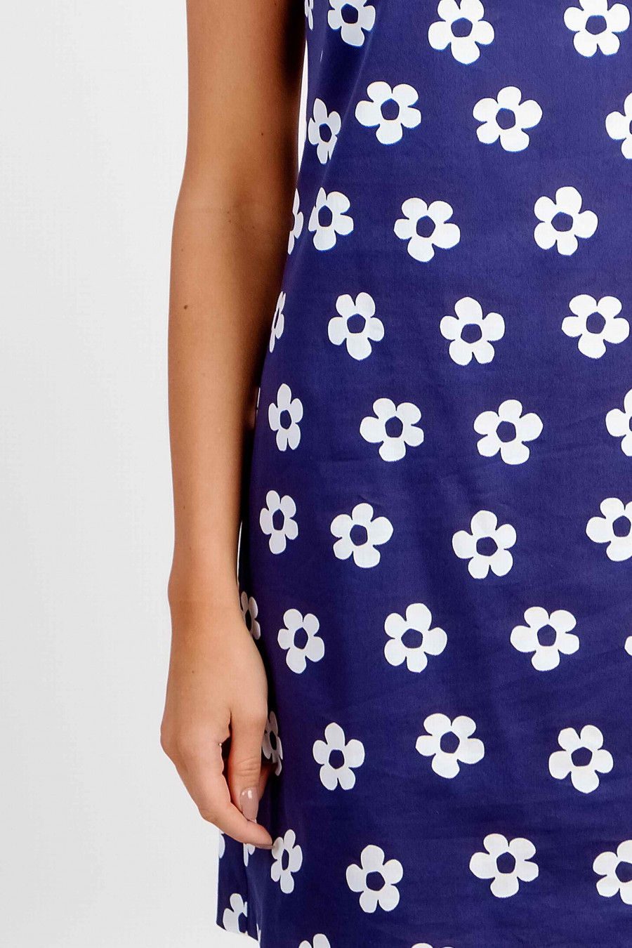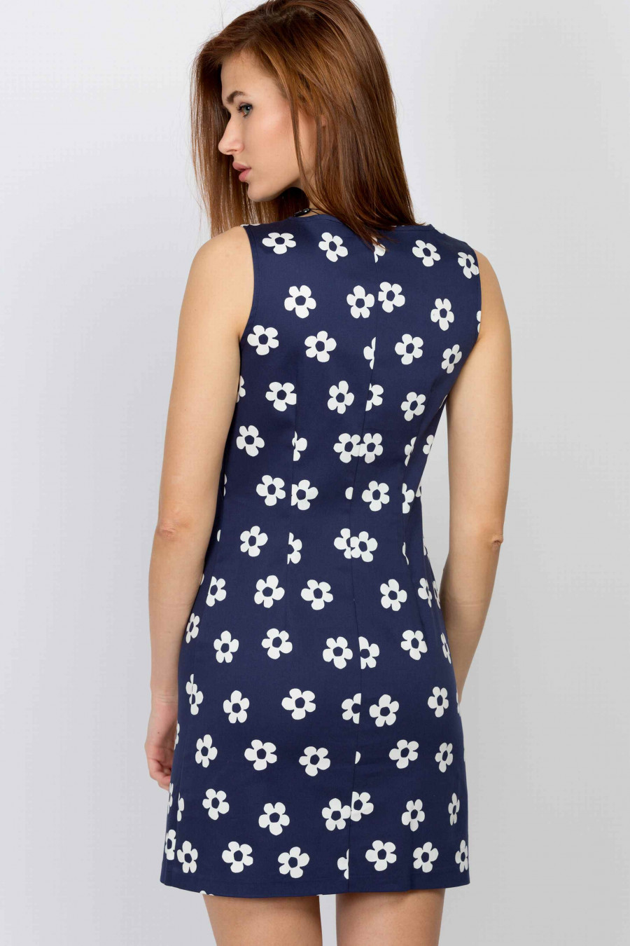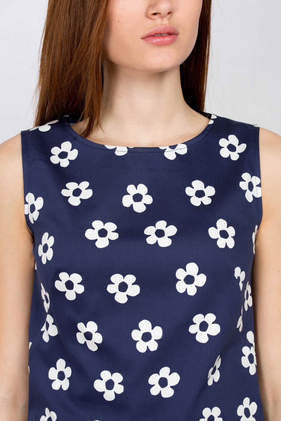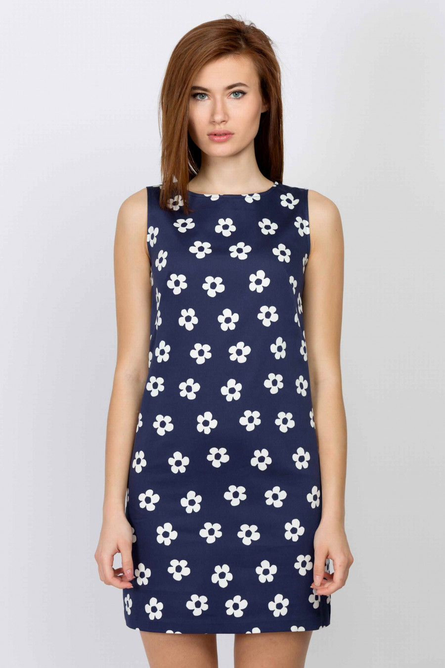 Нежное платье без рукавов прямого кроя. Ткань гладкая темно-синего цвета с белым цветочным принтом, без подклада. Отличная летняя модель, хорошо подчеркивает фигуру, зрительно удлиняет ноги.