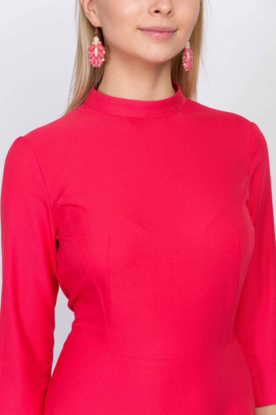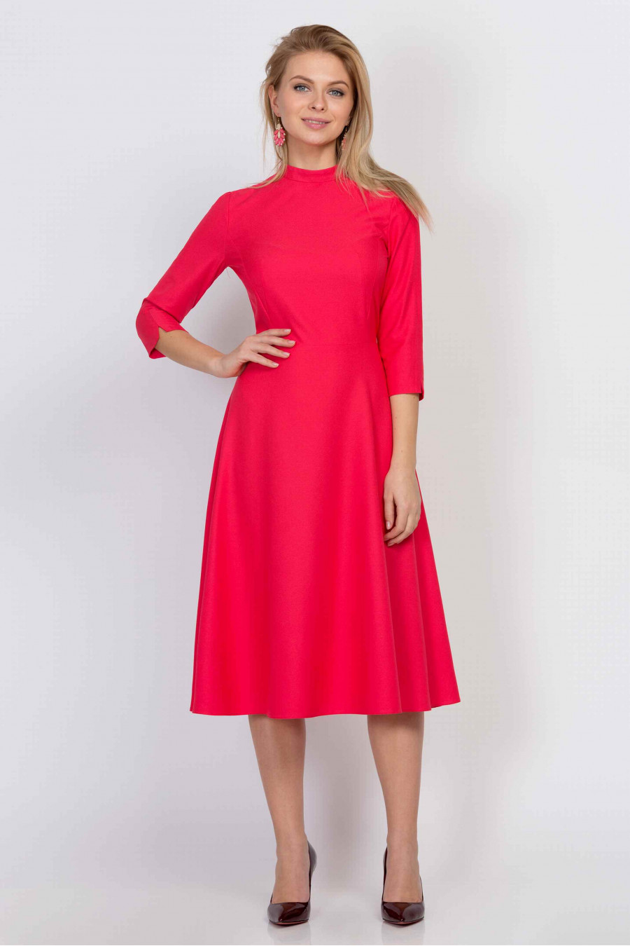 Элегантное платье с воротником-стойкой. Ткань текстурная, средней плотности кораллово-розового цвета. Без подкладки, рукав 3/4. Юбка струящаяся, застежка-молния на спинке. Платье подчеркивает талию, формирует притягательный женственный силуэт, и благодаря яркой расцветке притягивает взгляды.