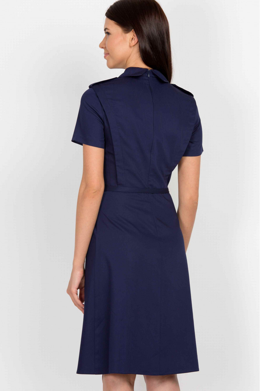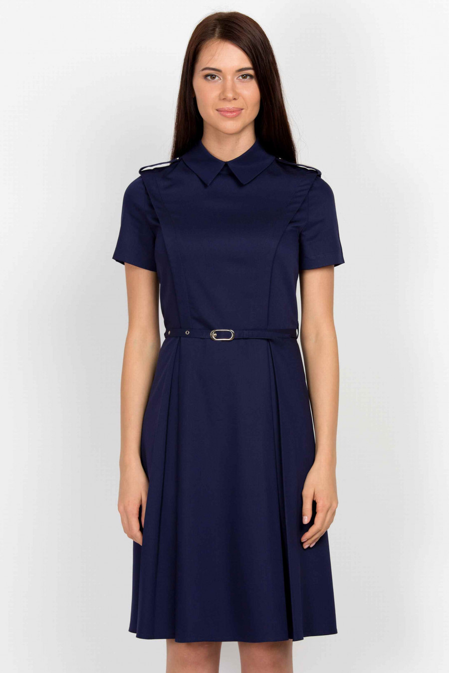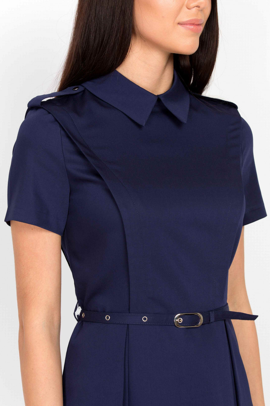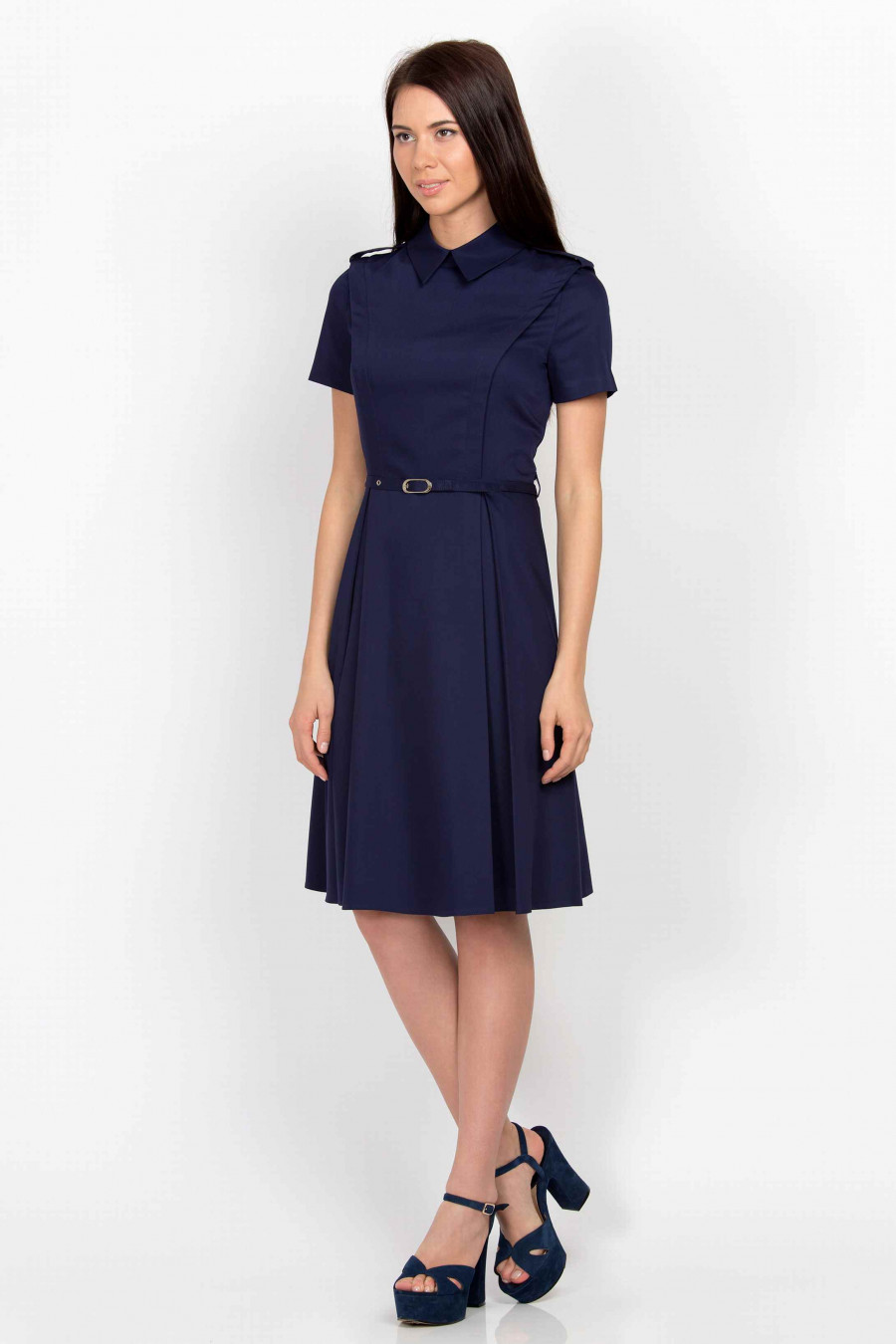 Стильное платье с воротничком на стойке. Ткань гладкая, приятная к телу темно-фиолетового, черничного цвета. Лиф отрезной, юбка спереди оформлена встречными складками. На поясе есть шлевки, в комплект входит тонкий тканевый ремешок. Рукава короткие, на спинке застежка-молния. Без подклада. Стильная изюминка платья - плечевые погоны на металлических заклепках и оригинальные рельефы. Модель хорошо сочетается с босоножками и туфлями на высоких массивных каблуках. Отлично подойдет для офиса.