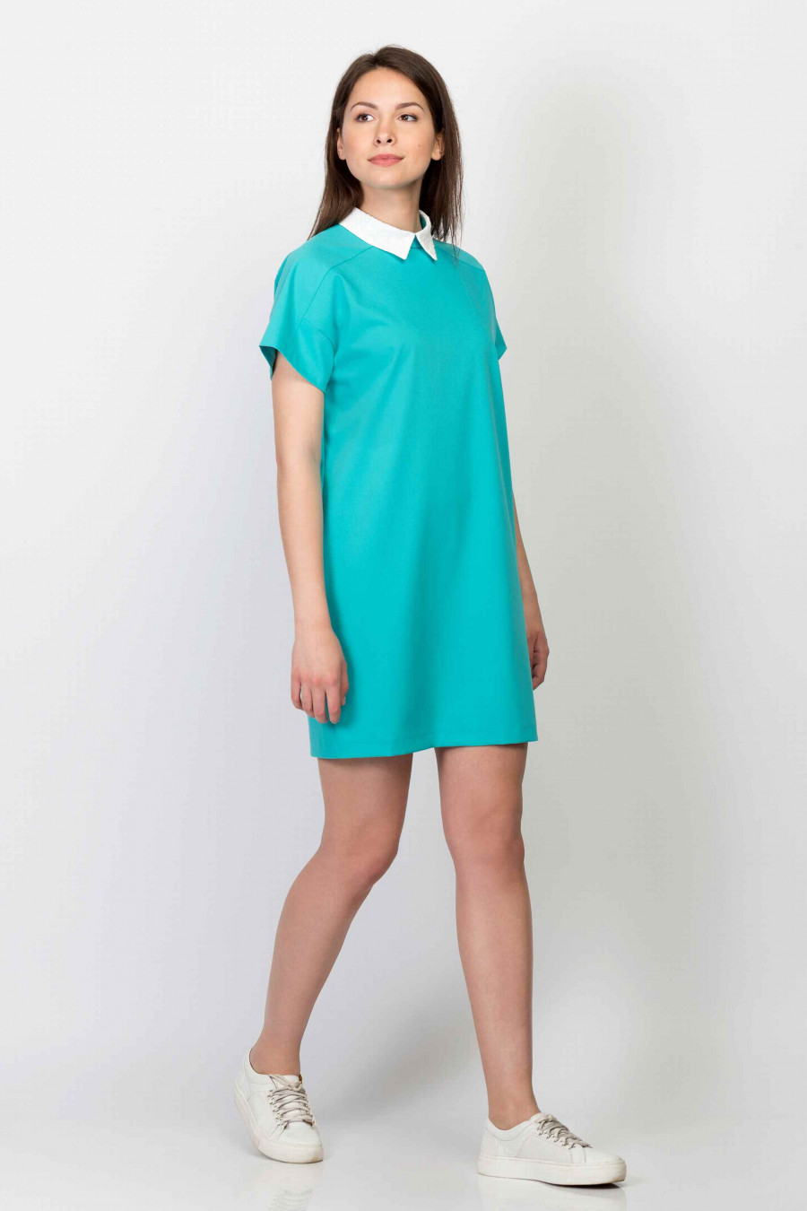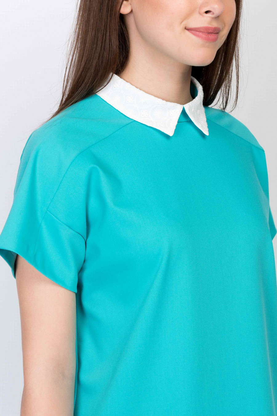 Стильное платье прямого кроя. Ткань приятная к телу ярко-голубого цвета. Платье без подкладки, рукав-реглан. Стильная изюминка платья - белый ажурный воротничок. Хорошая офисная модель, подчеркивает стройные ножки. Длина градируется от размера к размеру: 42 размер - 84,5 см. 54 размер - 101 см. Рост фотомодели 174 см. Длина: 86 см.