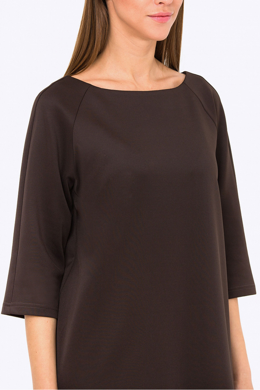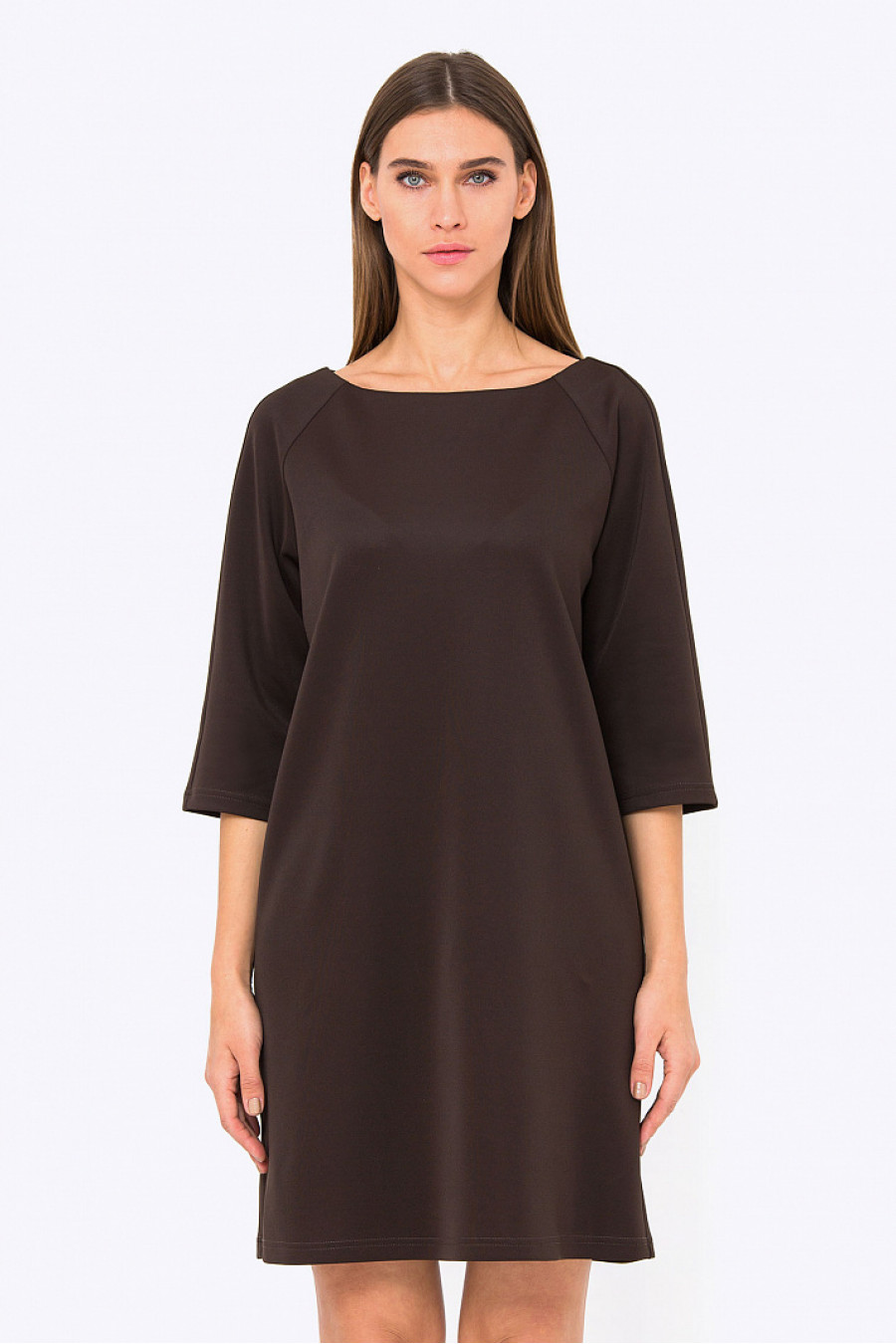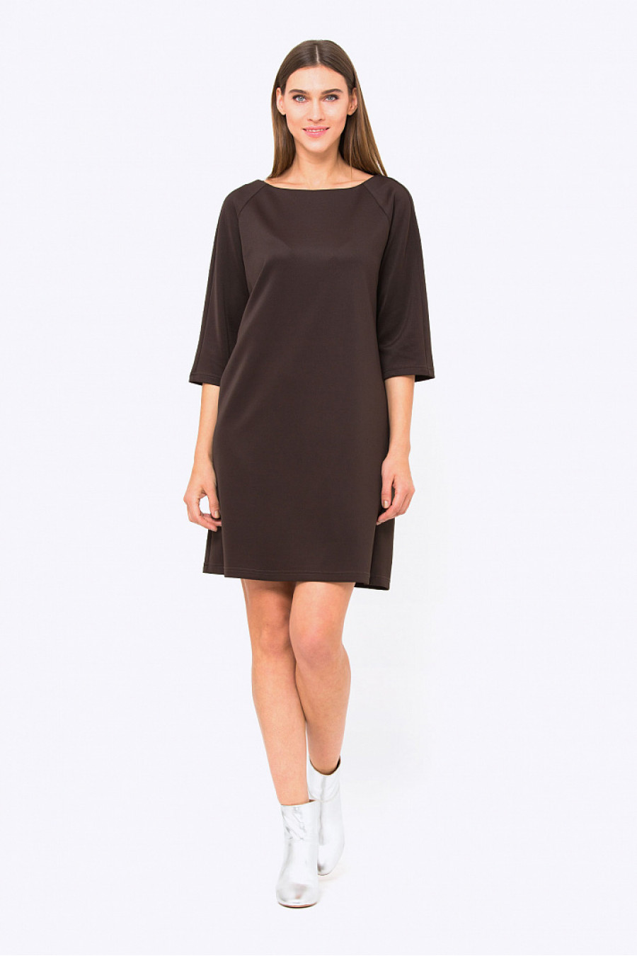 Стильное платье прямого кроя. Ткань эластичная, коричневого цвета. Рукава 3/4. Универсальная модель для осенне-зимнего сезона. Хорошо подойдет для офиса или для повседневной носки. Рост фотомодели 178 см.