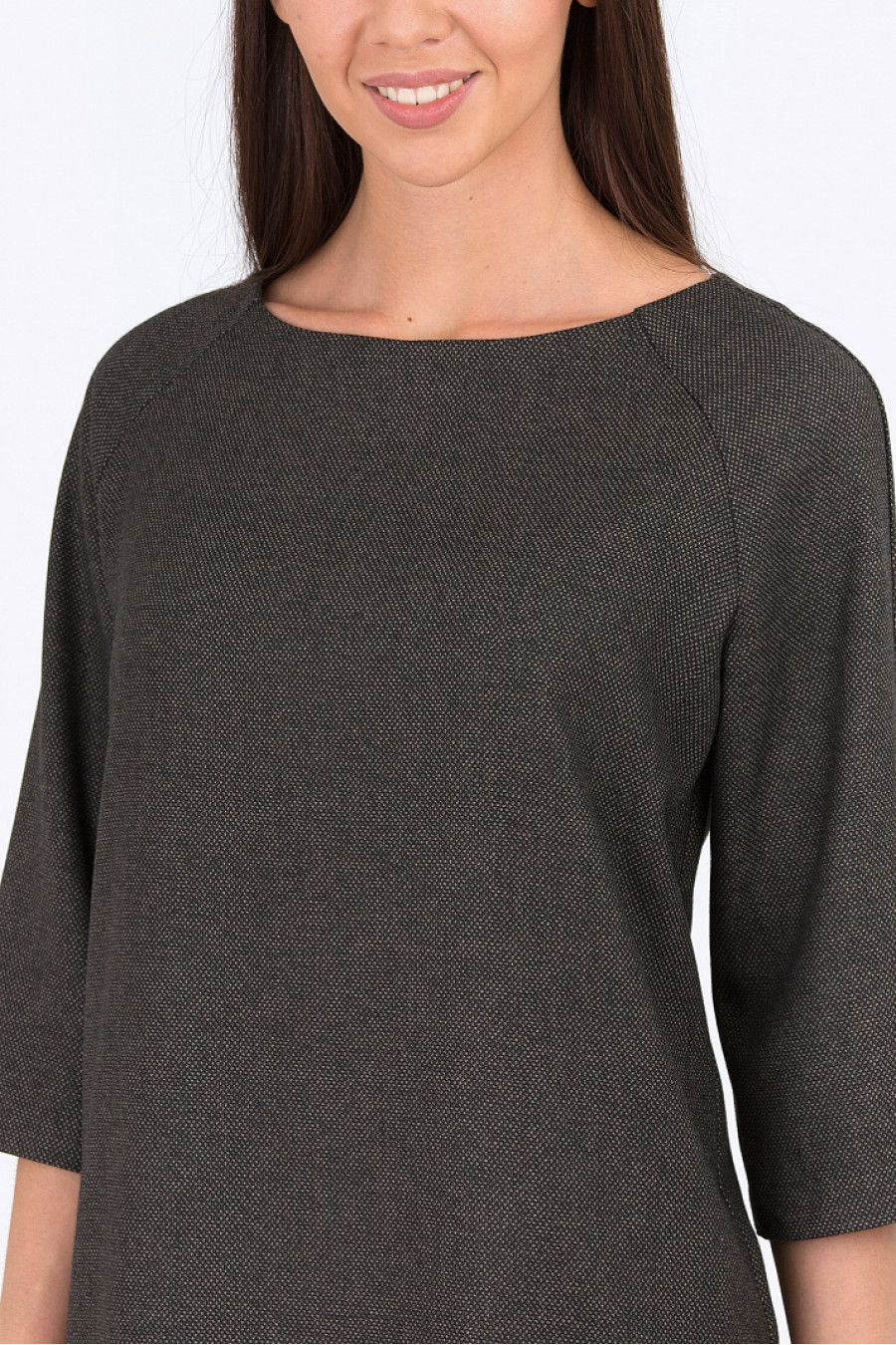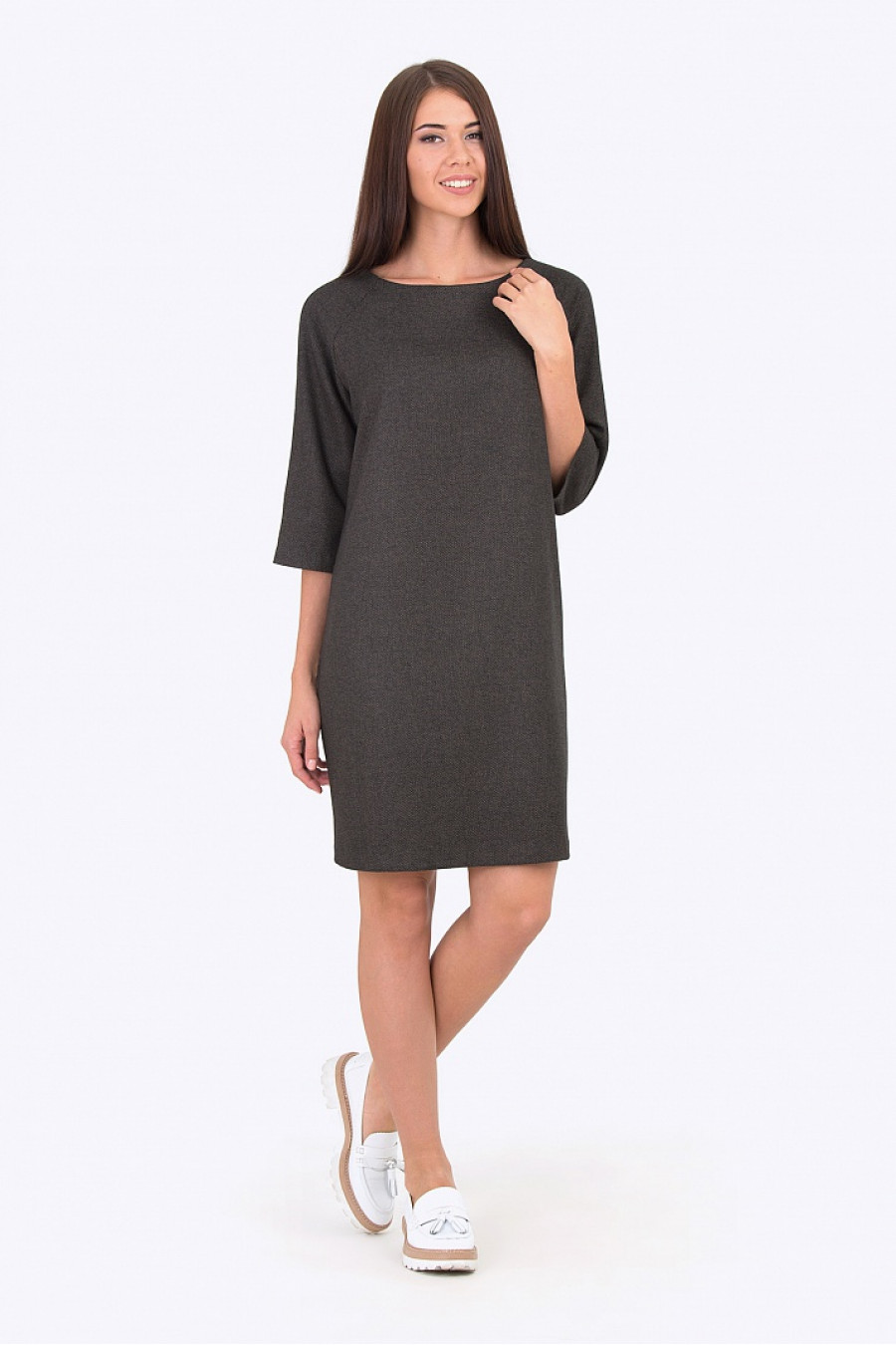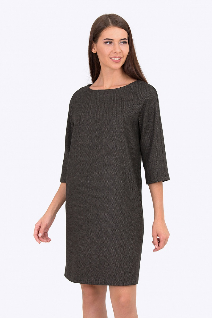 Стильное платье прямого кроя. Ткань серая с мелким принтом, очень приятная на ощупь. Платье без подкладки, рукава 3/4. Универсальная модель для осенне-зимнего сезона. Хорошо подойдет для офиса, а с яркими аксессуарами станет отличным выбором для торжественного мероприятия.