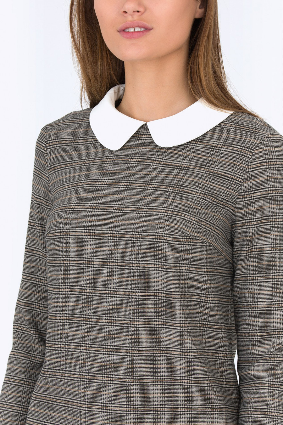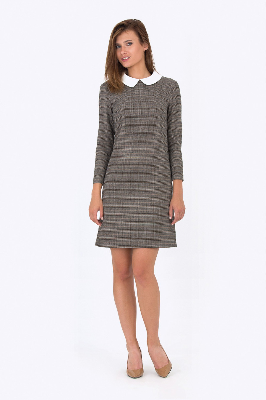 Уютное бежевое платье в клетку прямого кроя. Ткань мягкая, бархатистая, очень приятная к телу. Без подкладки, рукава 3/4. Благодаря закругленному белому воротнику платье смотрится очень стильно. Модель визуально стройнит и хорошо сидит по фигуре. Длина градируется от размера к размеру: 42 размер - 90 см, 54 размер - 94 см. Рост фотомодели 175 см. Длина: 90 см.